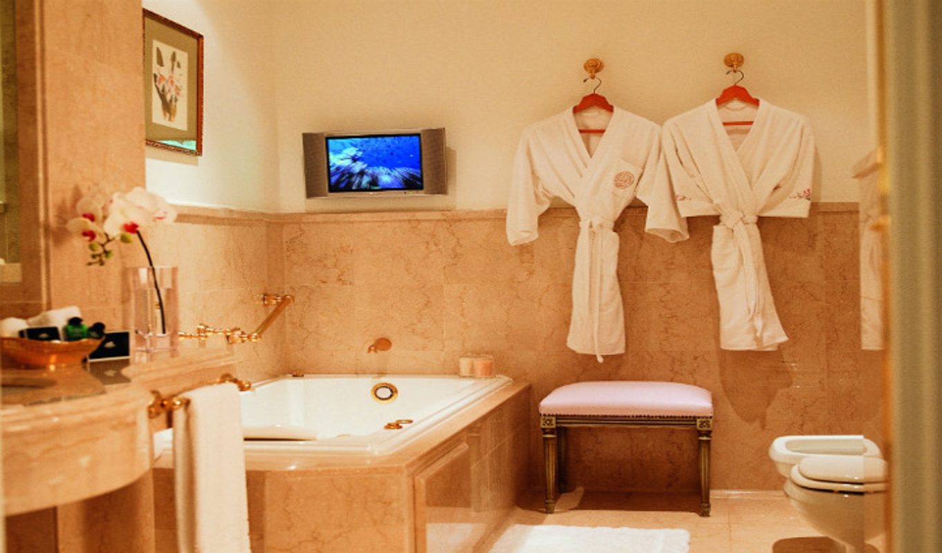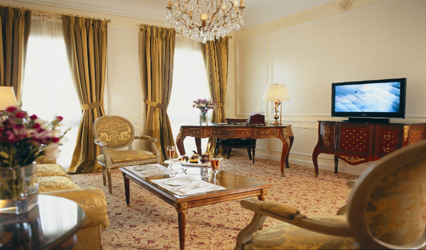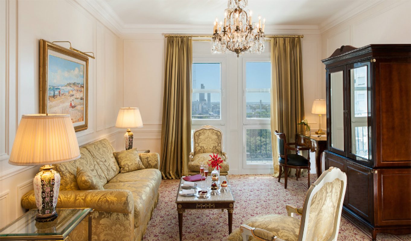 We love the bathrooms, adorned with enough towels and bathrobes for Louis XVI’s entire entourage, the finest Hermes toiletries and gold fittings that take centre piece in your suite.