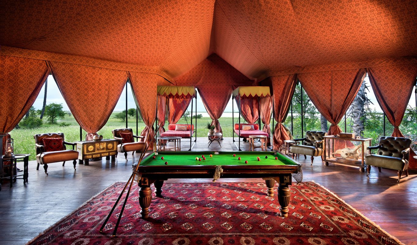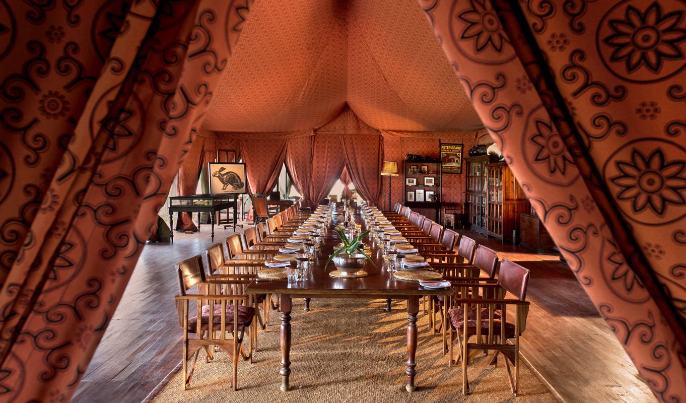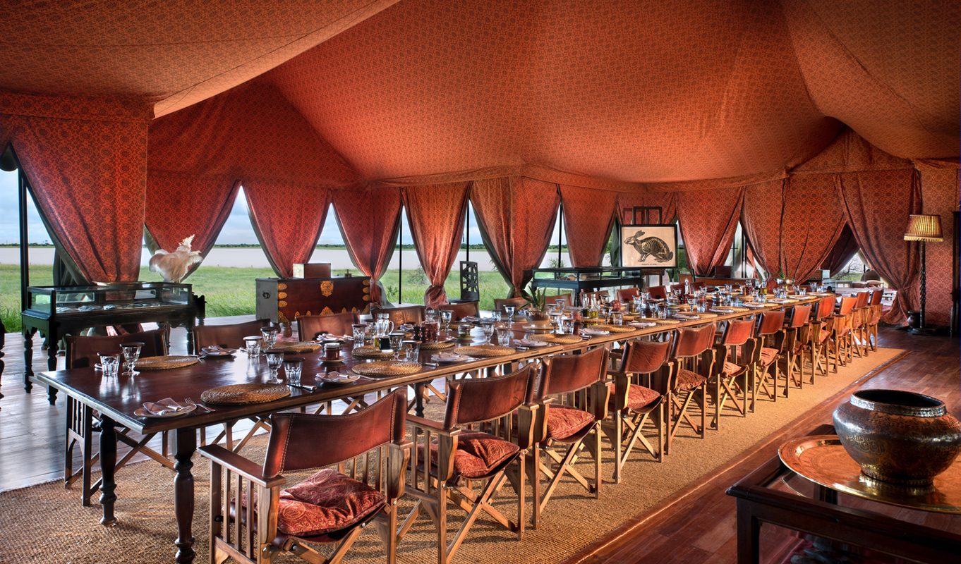 Jack’s camp consists of ten green roomy and stylish canvas tents with en-suite bathrooms and indoor and outdoor showers (for those who want to feel the Kalahari breeze on their skin). They have been fashioned in classical 1940’s style with Persian rugs underfoot, cool cotton sheets and mahogany and brass campaign-style kit from old family safari stores. These form a striking contrast with the rugged wilderness viewed from the comfort of one’s own veranda.