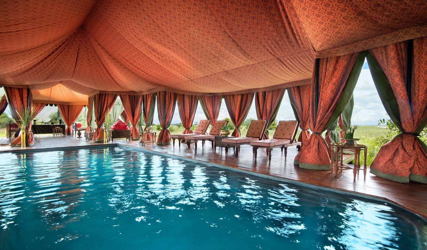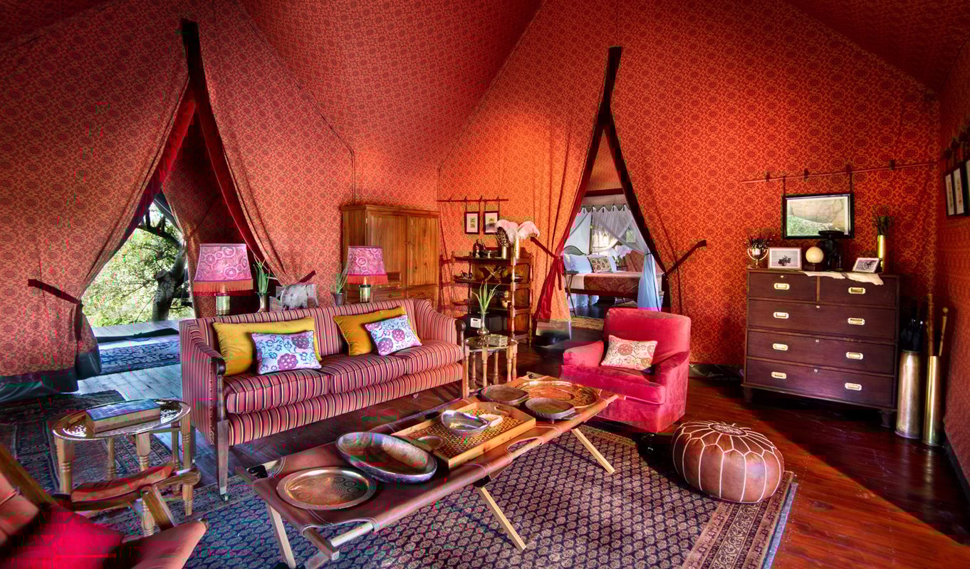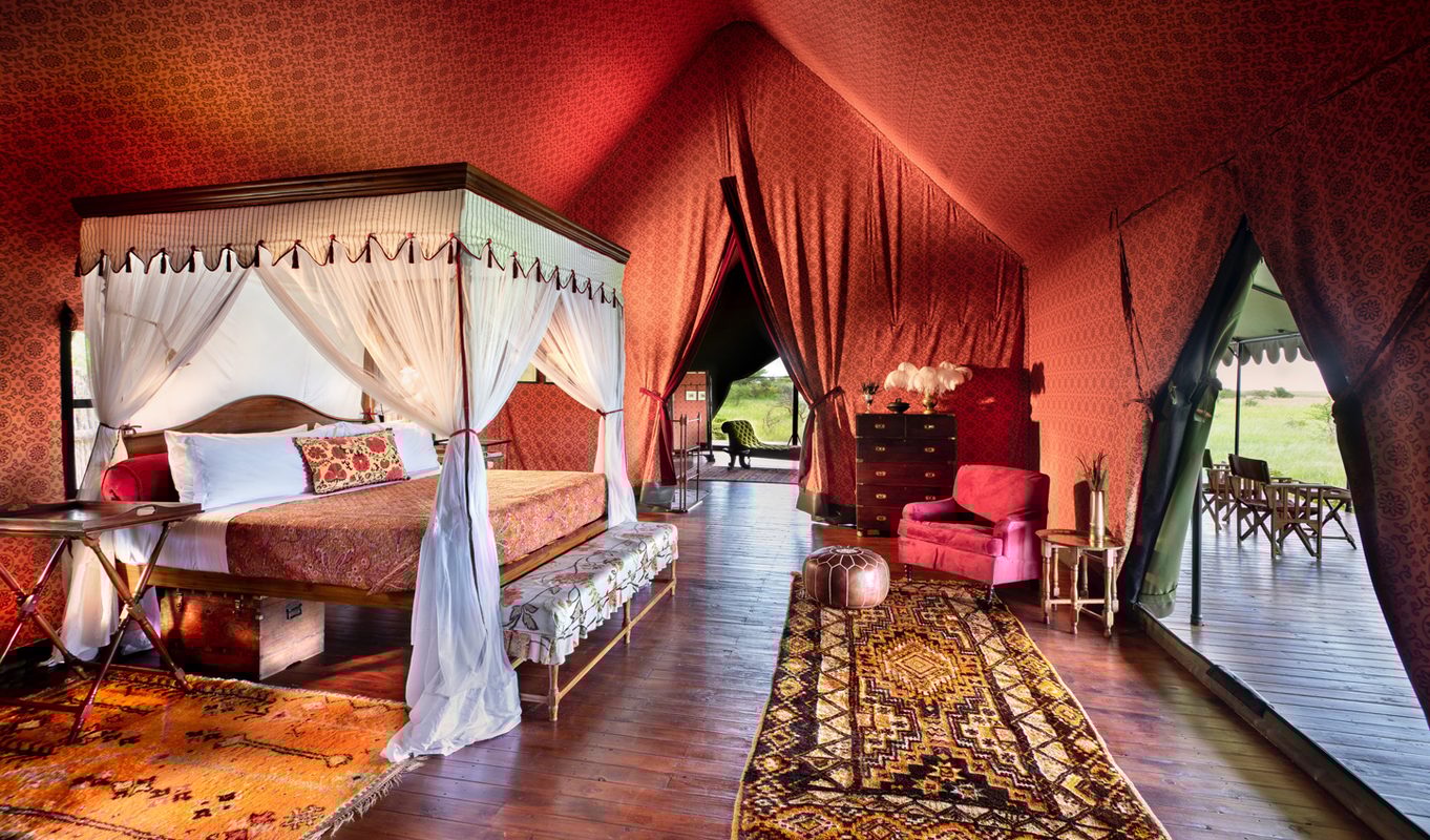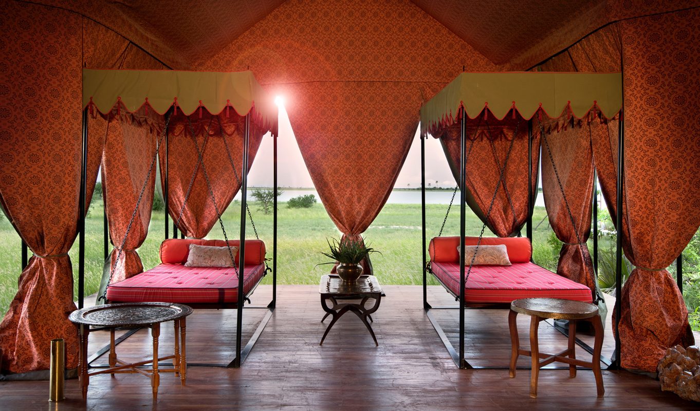Jack’s camp consists of ten green roomy and stylish canvas tents with en-suite bathrooms and indoor and outdoor showers (for those who want to feel the Kalahari breeze on their skin). They have been fashioned in classical 1940’s style with Persian rugs underfoot, cool cotton sheets and mahogany and brass campaign-style kit from old family safari stores. These form a striking contrast with the rugged wilderness viewed from the comfort of one’s own veranda.