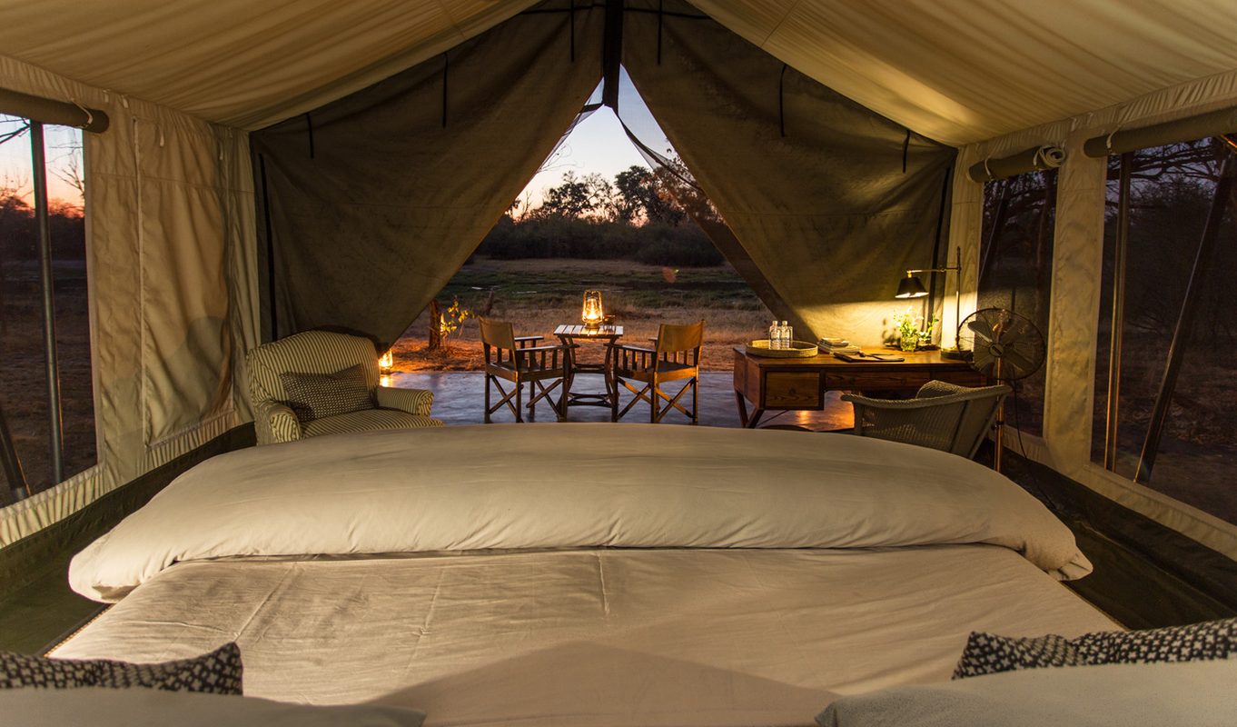 At Machaba, your nights will be spent in one of the 10 large luxury tents that overlook the Khwai River and Moremi Game Reserve. Far from basic, floor to ceiling windows allow you to be in the heart of the action as you spot game from the comfort of your bed, whilst plush sofas sit out on the terrace and decorative rugs and design pieces finish off this luxurious setting. The walk back to your tented oasis after dinner is a real highlight as you meander along candlelit pathways that scenically wind between riverine trees.