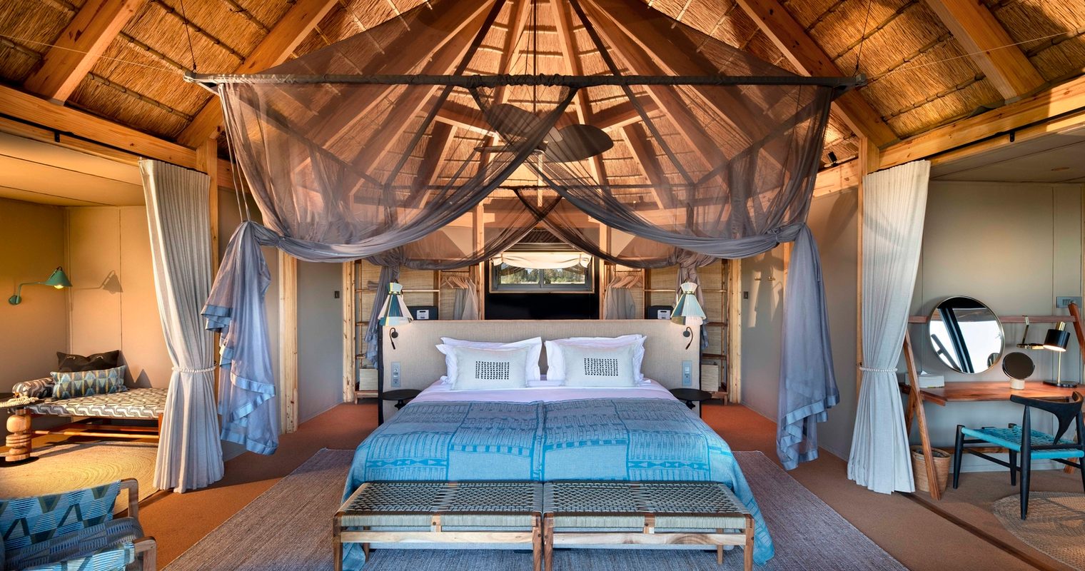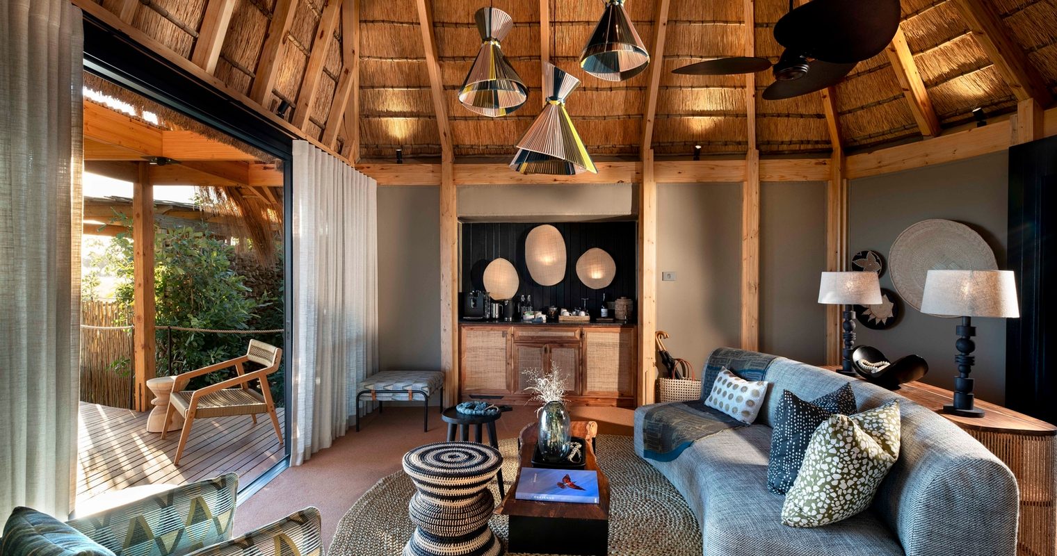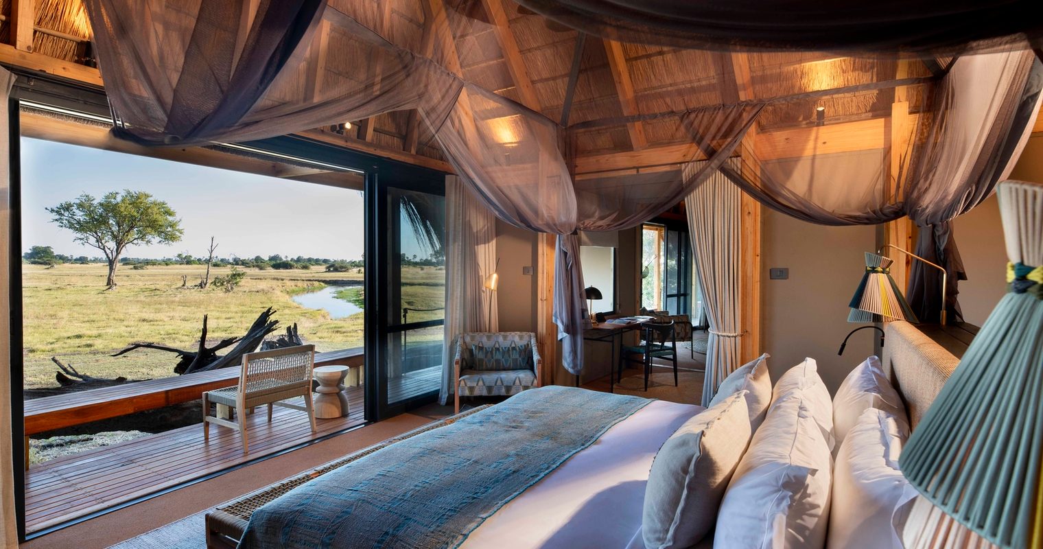 Privacy and exclusivity come as standard at Tawana – with each of its eight suites sitting on a raised deck, shaded by ebony trees and looking out across the grasslands. Inside, contemporary Africa meets tactile luxury: sleek wood, soft fabrics, and thoughtful touches make returning from game drives feel like a reward in itself. Floor to ceiling glass doors bring the outside in – with an outdoor shower, plunge pool, and outdoor pavilion for blissed out afternoons and floodplain gazing. We particularly like the river-facing suites, for perfect golden hour light and waking up to birdsong.