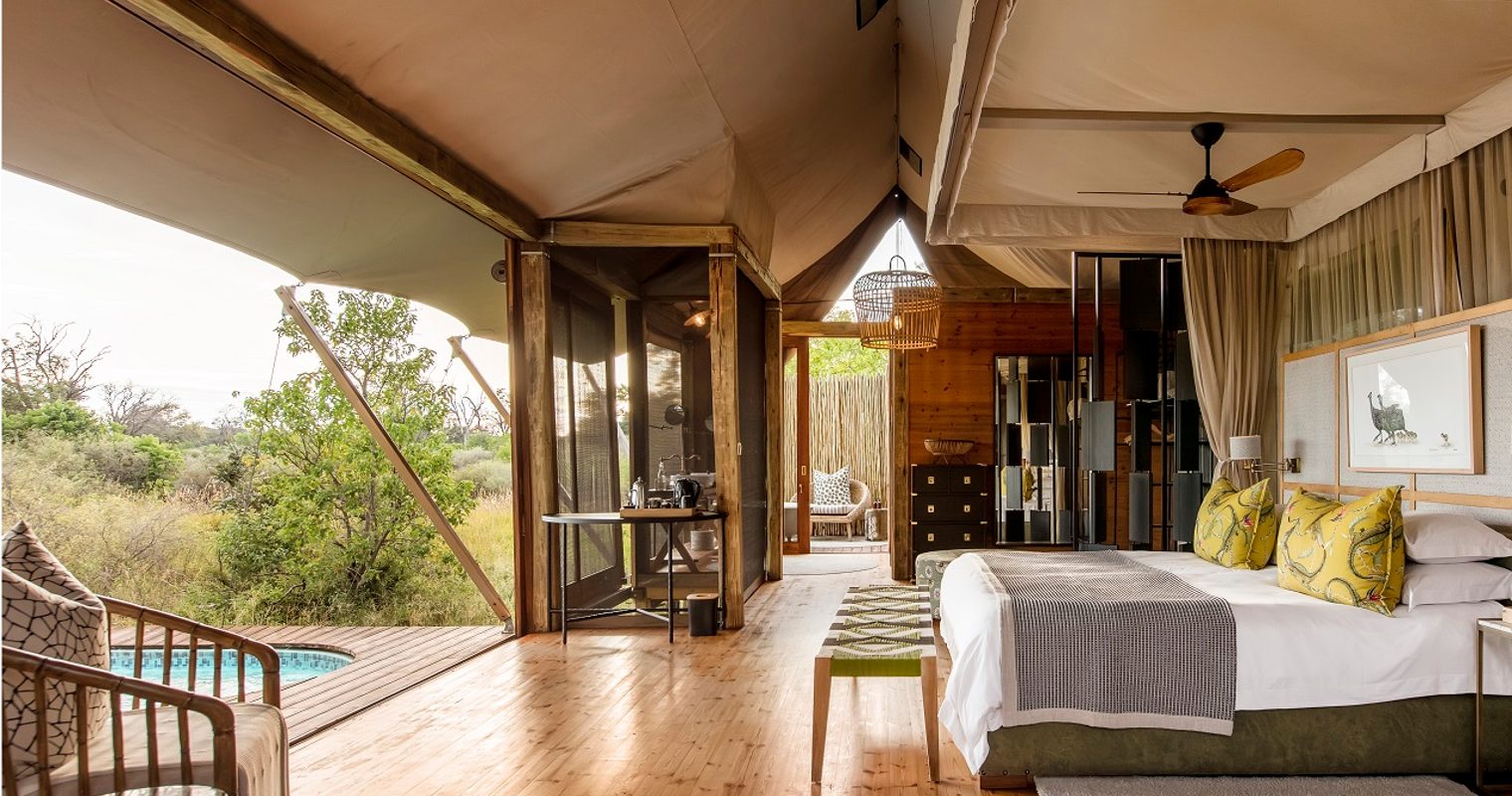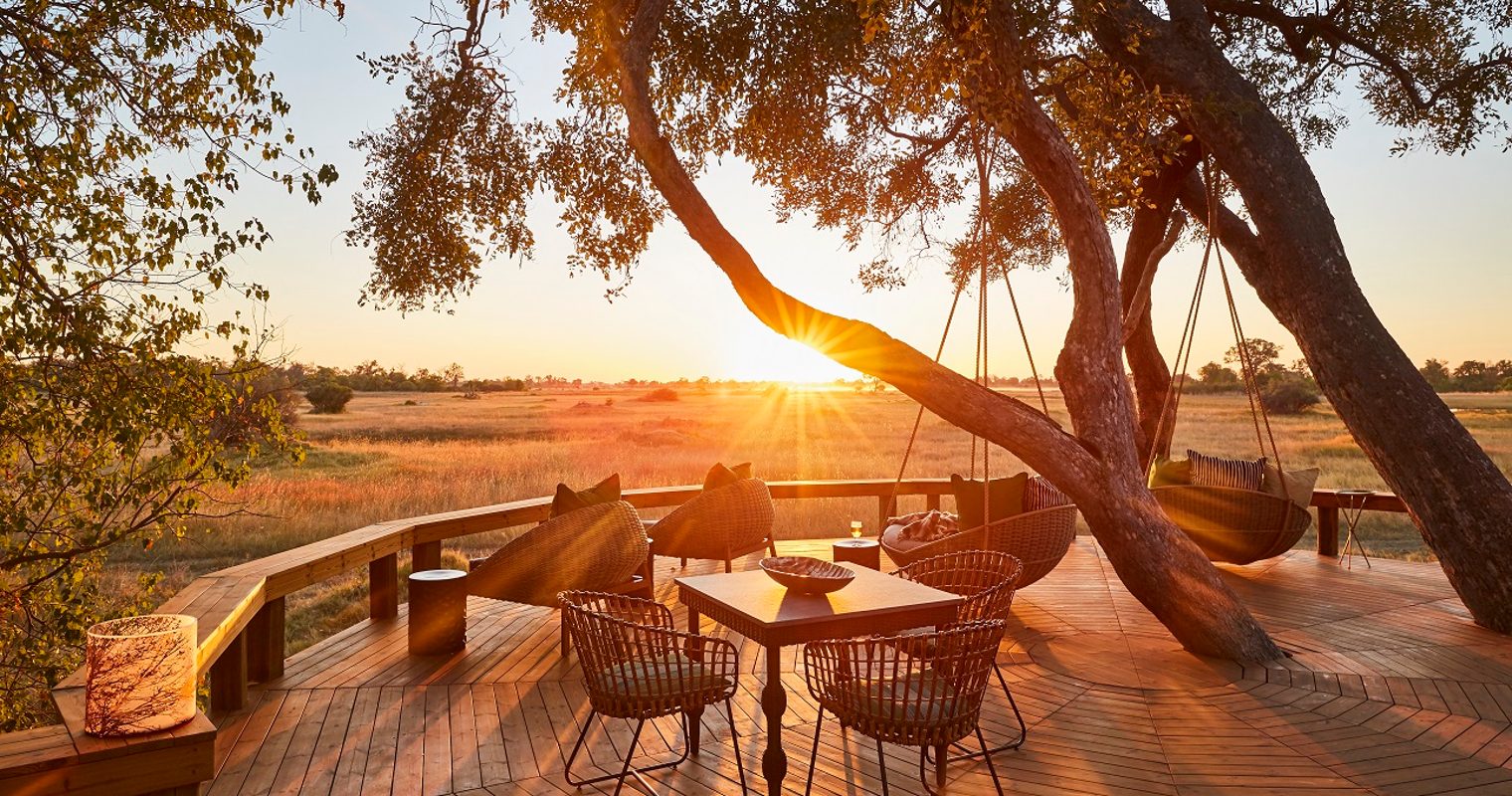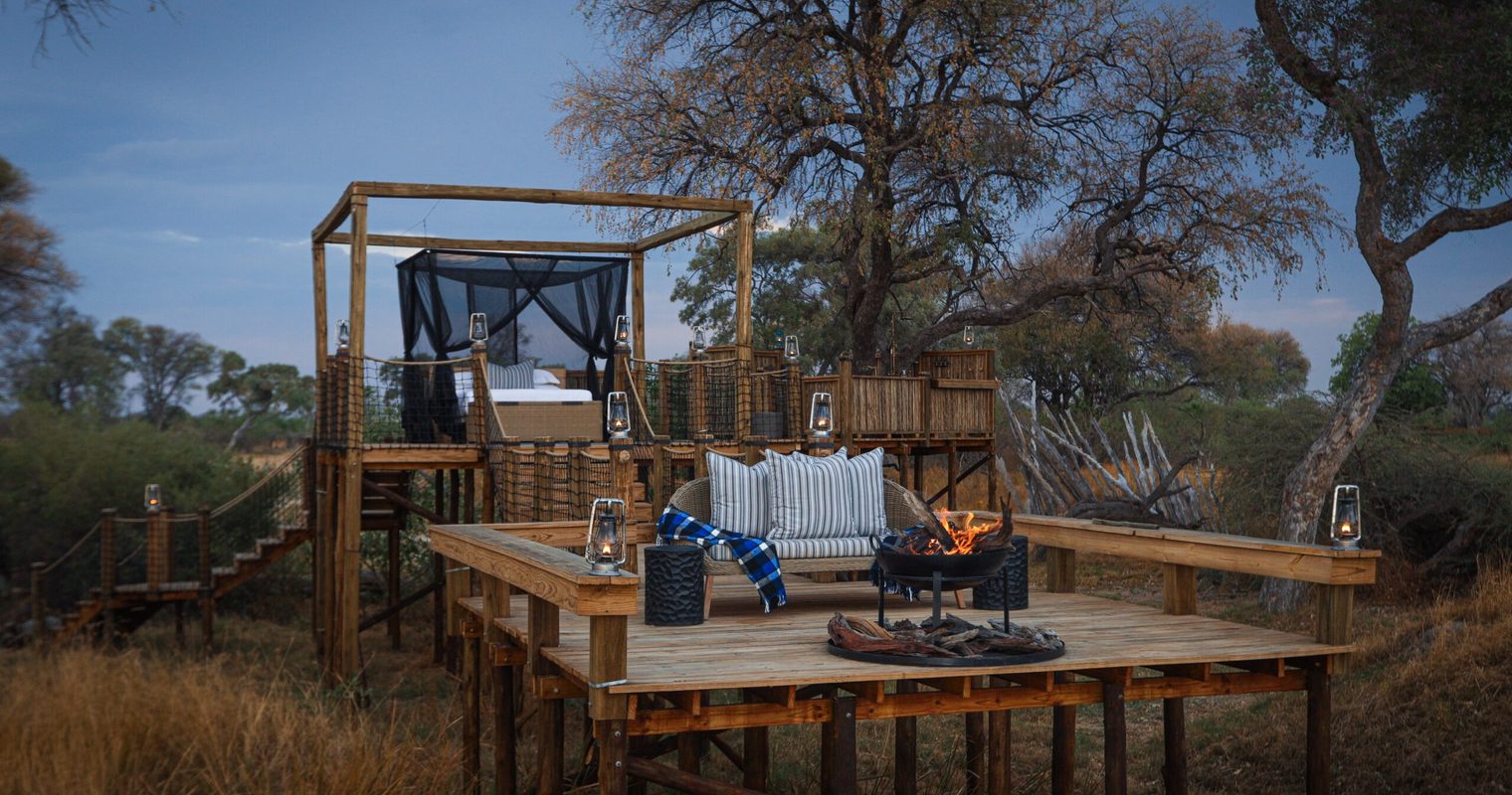 Connected by elevated wooden walkways, Tuludi’s 7 treehouse style rooms, including one two-bedroom family room, sit beneath the canopies of ancient leadwood trees. Already impressive in size, canvas tented roofs enhance the space further and help bring to life those all-important views across the Delta. Styled with a mix of contemporary and classic furnishings, earthy tones are contrasted by colourful prints and beautifully handcrafted art work. Large private verandas complete with plunge pools, sunken seating areas and hanging chairs make perfect spaces for kicking back after a morning game drive or mokoro adventure. For something extra special, we recommend booking a sleep out at their Sky Suite to truly experience the romance of Tuludi. Spend a night cozied up under a blanket of a billion stars, surrounded by uninterrupted wilderness, and listening to the sound of the open bush.