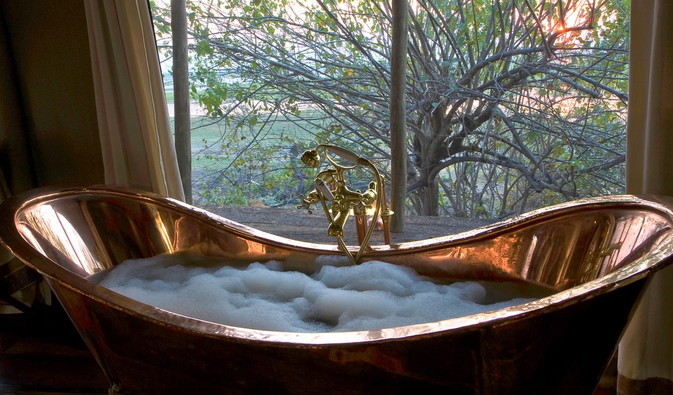 Each tent and veranda is enormous (100 square meters in size) and beautifully located along the edge of the forests to take advantage of the spectacular view over the floodplains and savannas. They have spacious bedrooms and en-suite bathrooms with a copper bath looking out over the lagoon. There is even an outdoor shower. If you want to sit outside and enjoy the fresh African air and stunning views then go and sit on the veranda shaded by giant broad-leafed trees. In the winter months, there is a perfectly handcrafted copper fireplace in your tent in case you are feeling a little bit chilly.