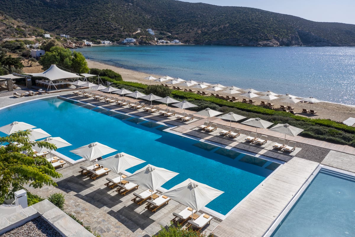 From Athens’ Piraeus port, you can take either a ferry or high-speed catamaran into Sifnos’ Kamares port – with journey times between 2.5-5 hours, depending on which vessel you choose. From there, Elies Resorts is a short 25-minute drive. Alternatively, you can arrive in style by helicopter, thanks to Sifnos’ own fully-functional heliport – located just 15 minutes from the hotel. Once you’re settled in, you’ll be ideally located on one of the island’s four sandy beaches, with the traditional tavernas of Vathi village just a short walk away.