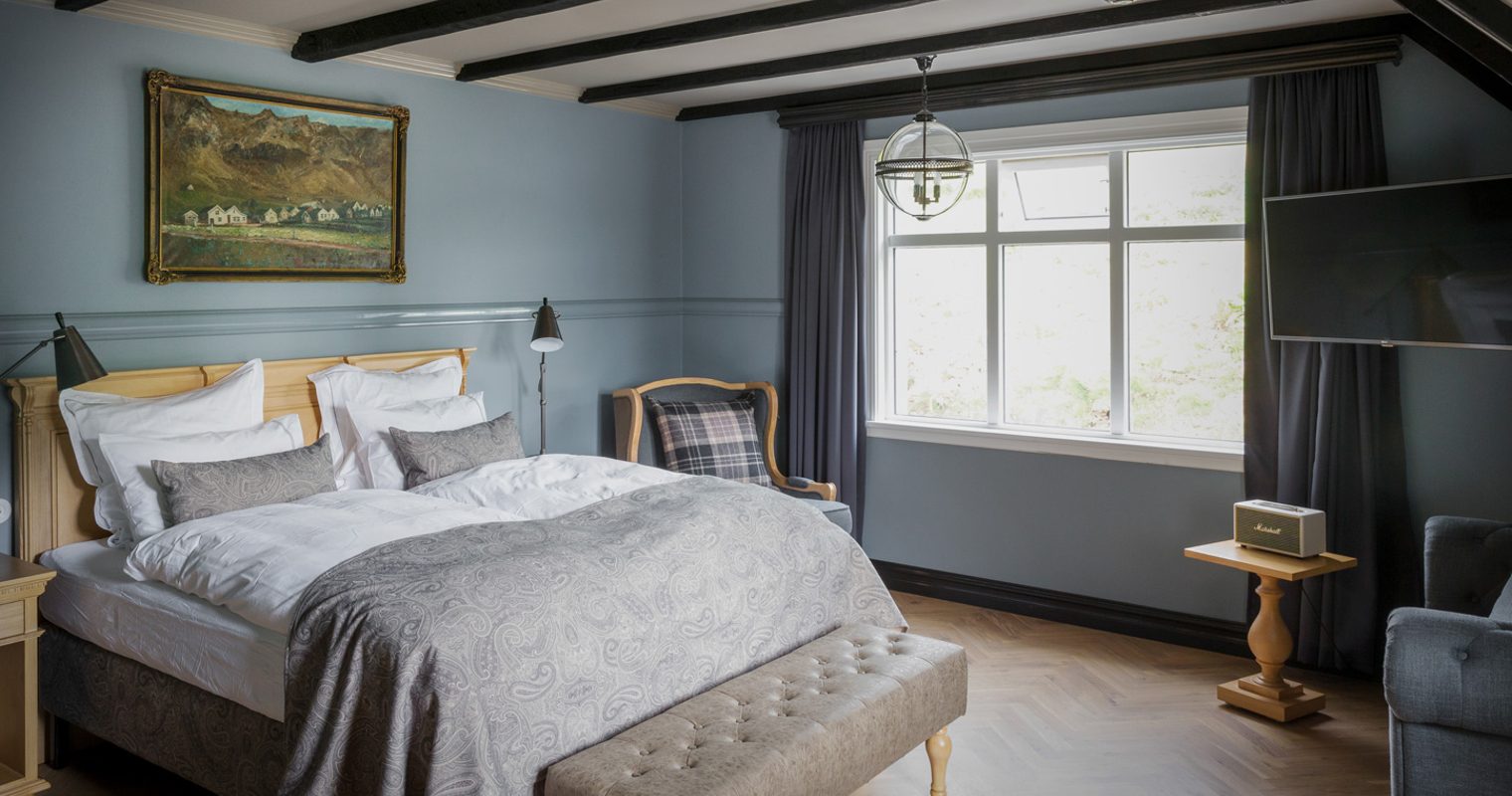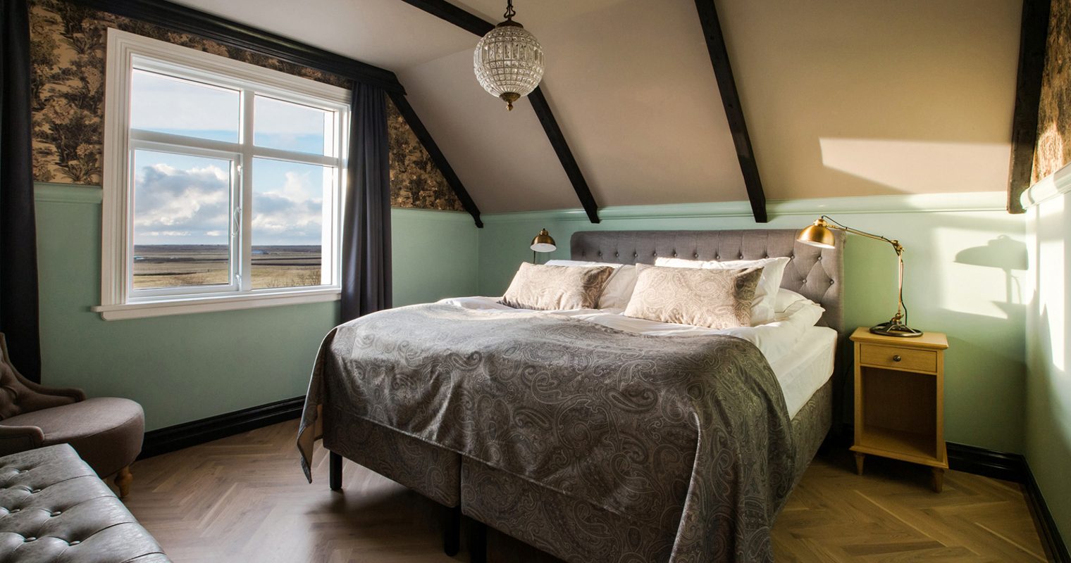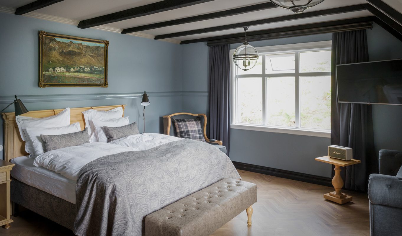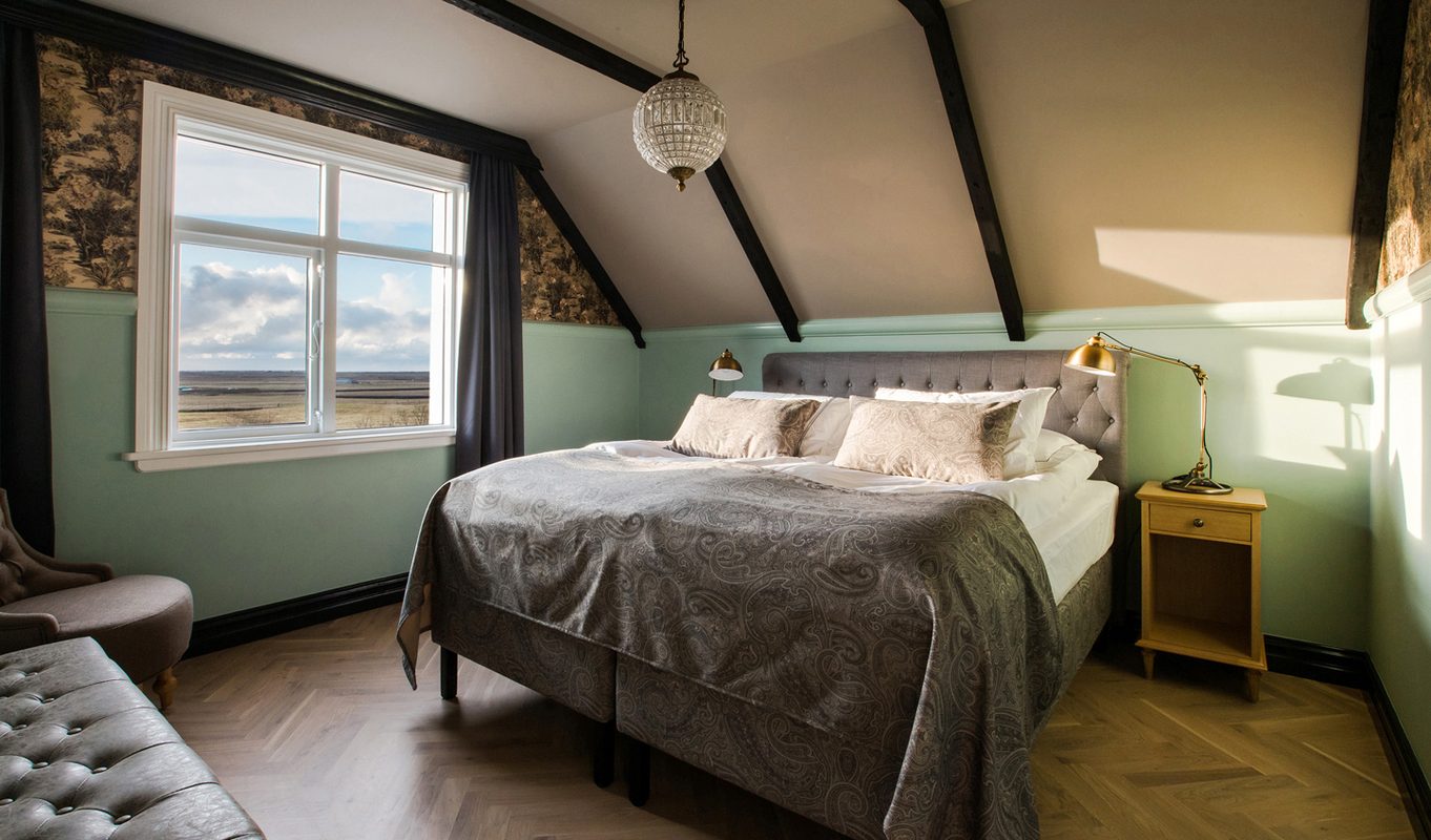 A boutique property through and through, each of the 14 rooms and suites at Skálakot is unique in design whilst consistently honouring a fusion of luxury and modernism. Soft checks and feature wallpaper give a cosy feeling, while Marshall stereos and anglepoise lamps bring that unexpected edge. We love the Master Suite with its views out to the Vestmann Islands, the cosy fireplace in the corner and the statement bathtub in the centre of the room; it feels like a real home from home.