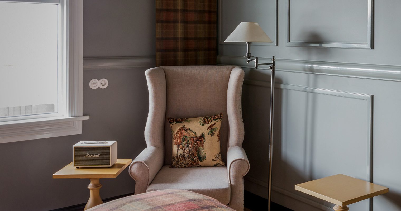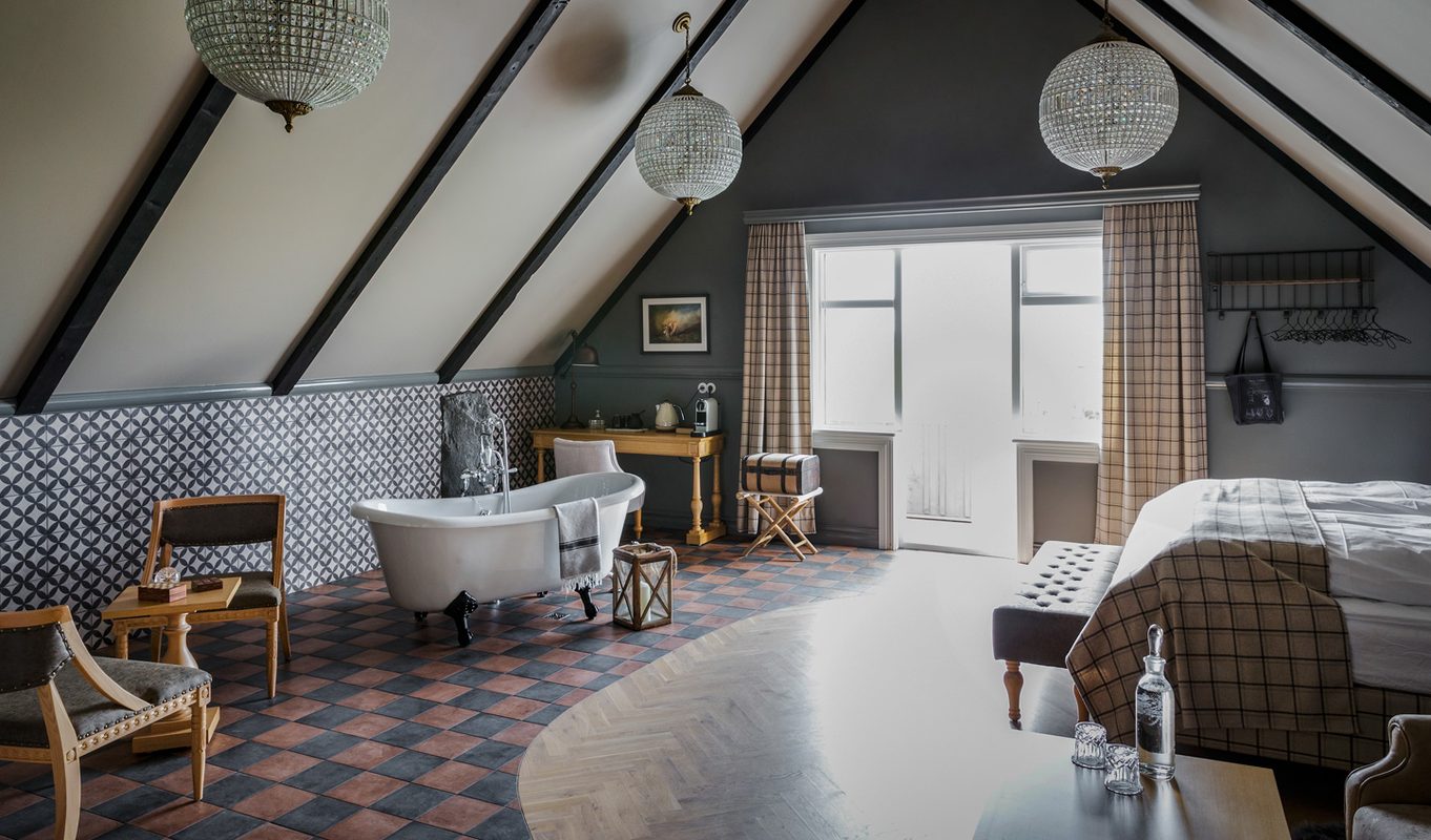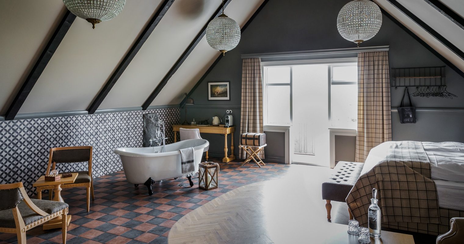 A boutique property through and through, each of the 14 rooms and suites at Skálakot is unique in design whilst consistently honouring a fusion of luxury and modernism. Soft checks and feature wallpaper give a cosy feeling, while Marshall stereos and anglepoise lamps bring that unexpected edge. We love the Master Suite with its views out to the Vestmann Islands, the cosy fireplace in the corner and the statement bathtub in the centre of the room; it feels like a real home from home.