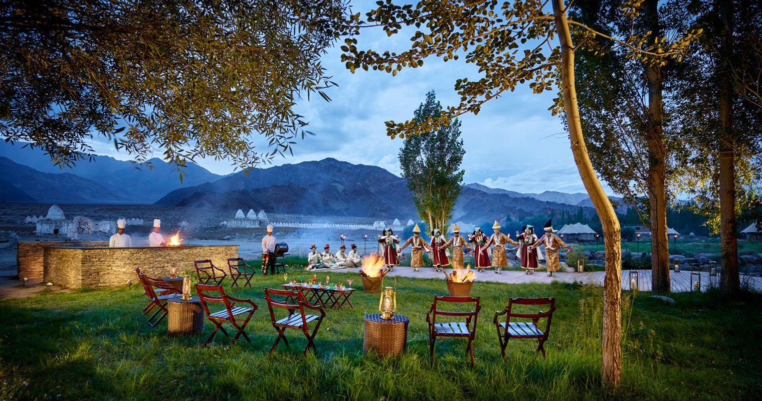 In the afternoon, delve into nature with a gentle rafting excursion down the ancient Indus River. You’ll bob past traditional Ladakhi villages and savour the enchanting views. The contrast between the emerald shades of the Minoo village on one bank and the stark barren landscape on the other has to be seen to be believed. As the sun sets over the mist-shrouded mountains by your camp, you’ll be entertained by a traditional dance performance, Zyabro, into the night.
