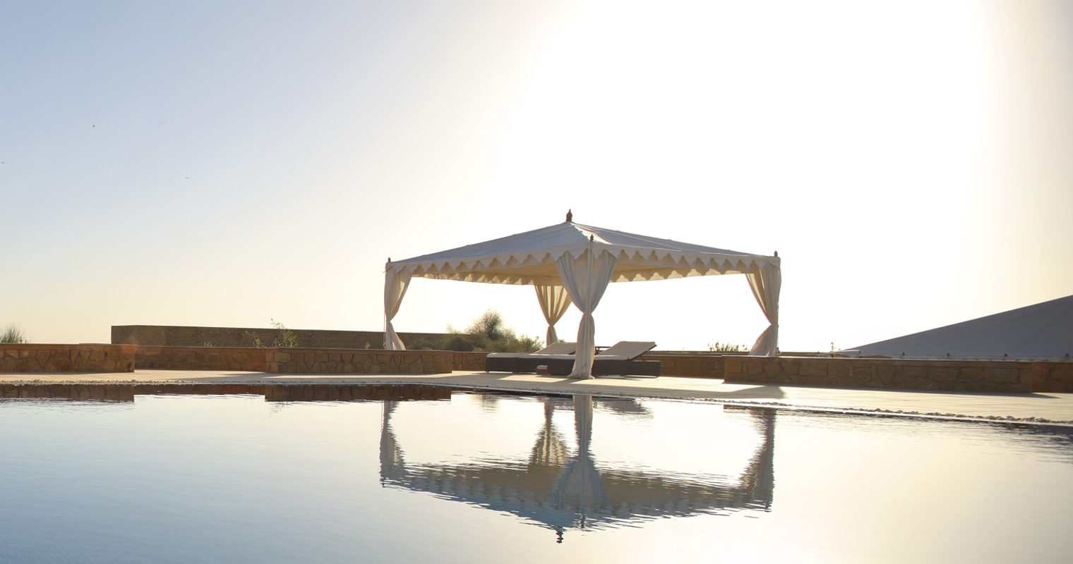 All suites are canvased sheltering you with a thousand square feet of space and the interiors are individually styled. With 14 tented suites and 6 luxury suites lining in perfect symmetry of 10 either side of the pool leading down by a candle-lit path to the Royal tented suite at the foot of the camp. Centred on sandstone and formally following the reputation of The Golden City that Jaisalmer has, each suite is decorated in traditional Victorian-safari-style furnishing turning everyone’s Indiana Jones dream into a reality. Filled with honey candle lit brass lanterns, each cream canvass tent includes typically Indian features from woven jute to decorative wooden bowls and a stone bathroom finish.