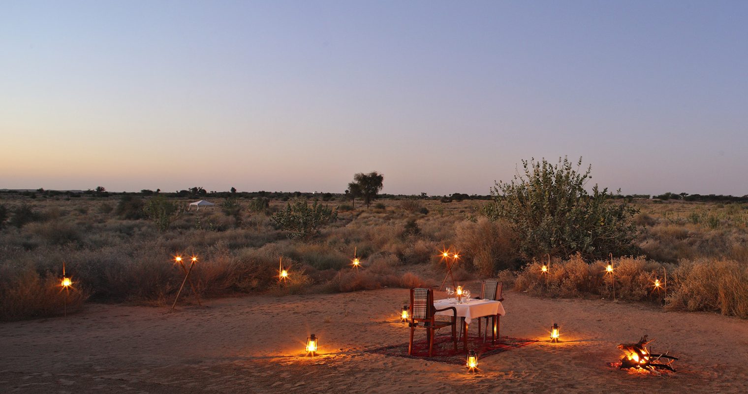 Fly into Jodhpur and relax on as you embark on a scenic drive to camp. You can also depart by helicopter if you wanted to view the hundred-acre private estate by air before touching down in your desert sanctuary. From the grounds of your tented terrace in the centre of The Thor, shepherds and local villagers can be observed as they go about their day.