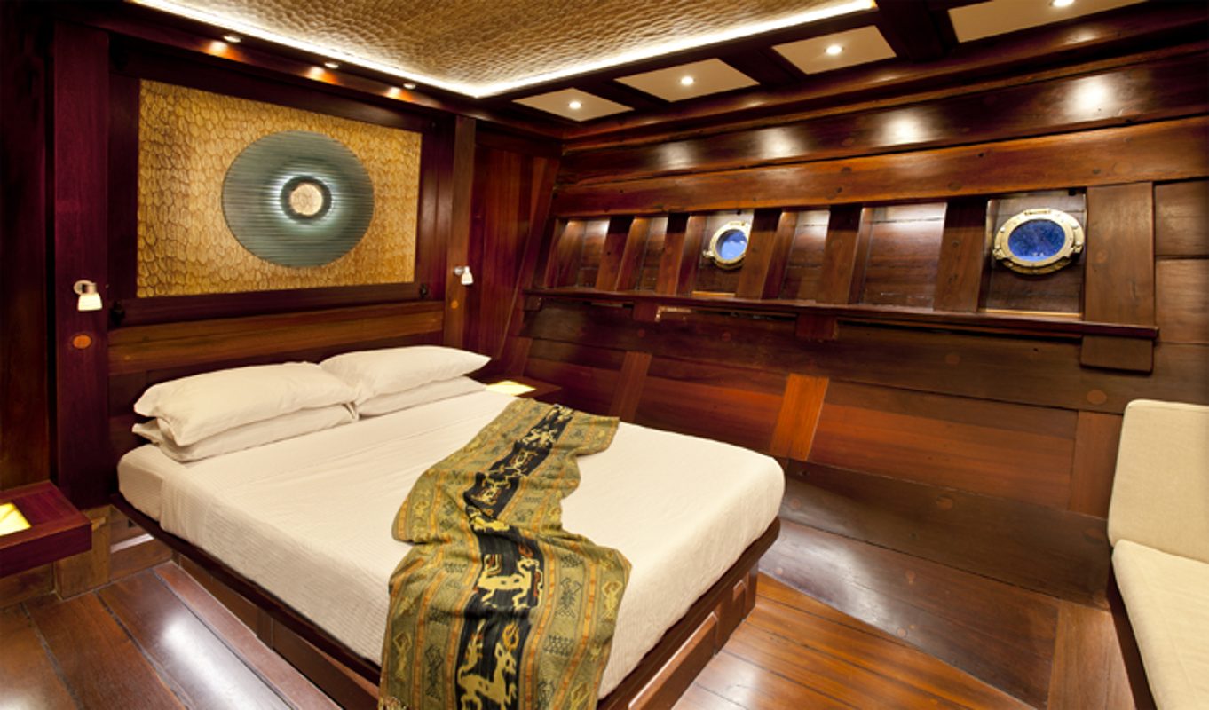Adventures with family and friends are no doubt the best adventures – so why not bring them along? Everyone is welcome on-board Dunia Baru, your exclusive home-from-home, with seven exquisite en-suite cabins and ample space to relax over the three decks. The master suite on the upper aft deck is particularly luxurious, with wrap-around windows treating you to 270 degree views over lush landscapes and endless seas. With iPad controllers and a Sonos sound system hooked up throughout, Dunia Baru effortlessly combines traditional techniques with modern technology for a truly luxurious getaway.