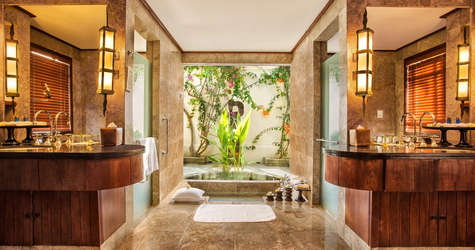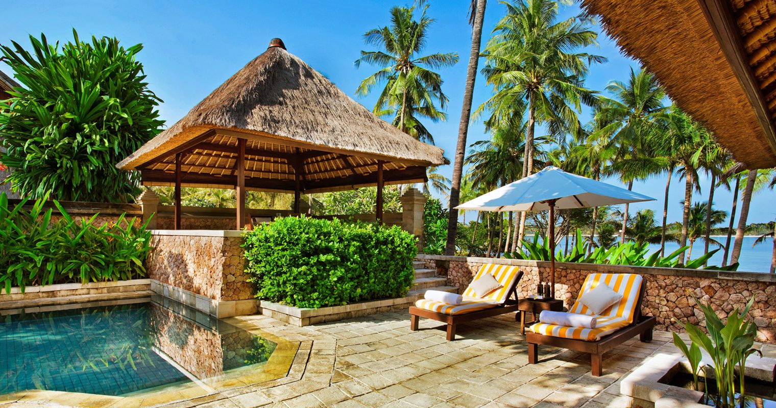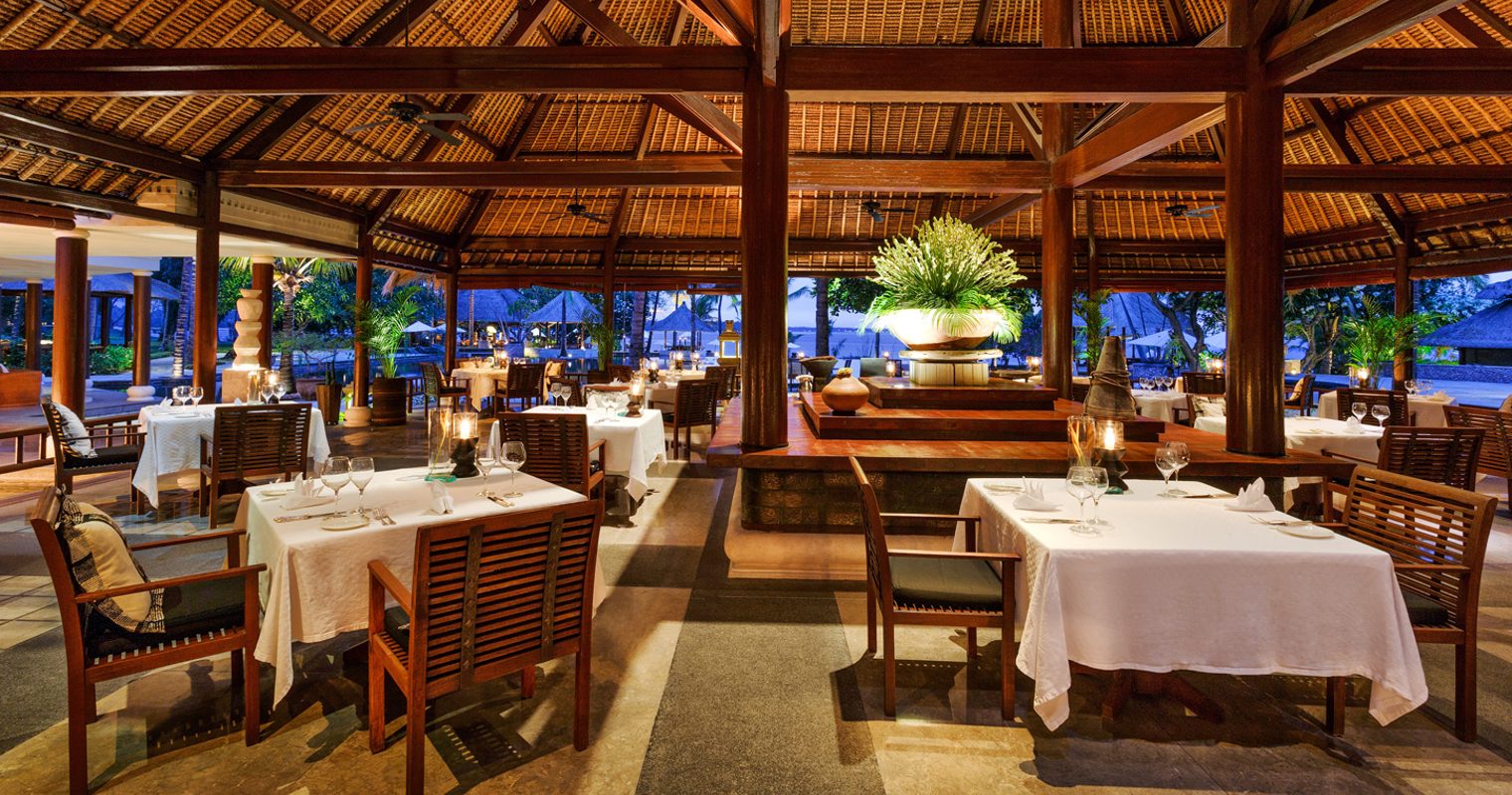Thatched roof villas and terraced pavilions are scattered around the gardens and have traditional Indonesian crafted furniture and artwork. Soak in the sunken bathtub, snooze on the large four-poster bed or chill-out in your private courtyard with rock pond. The villas and pavilions have expansive, shaded terraces to relax in, while you peer out at beautiful gardens or beaches. All the villas and terrace pavilions offer spacious bedrooms.