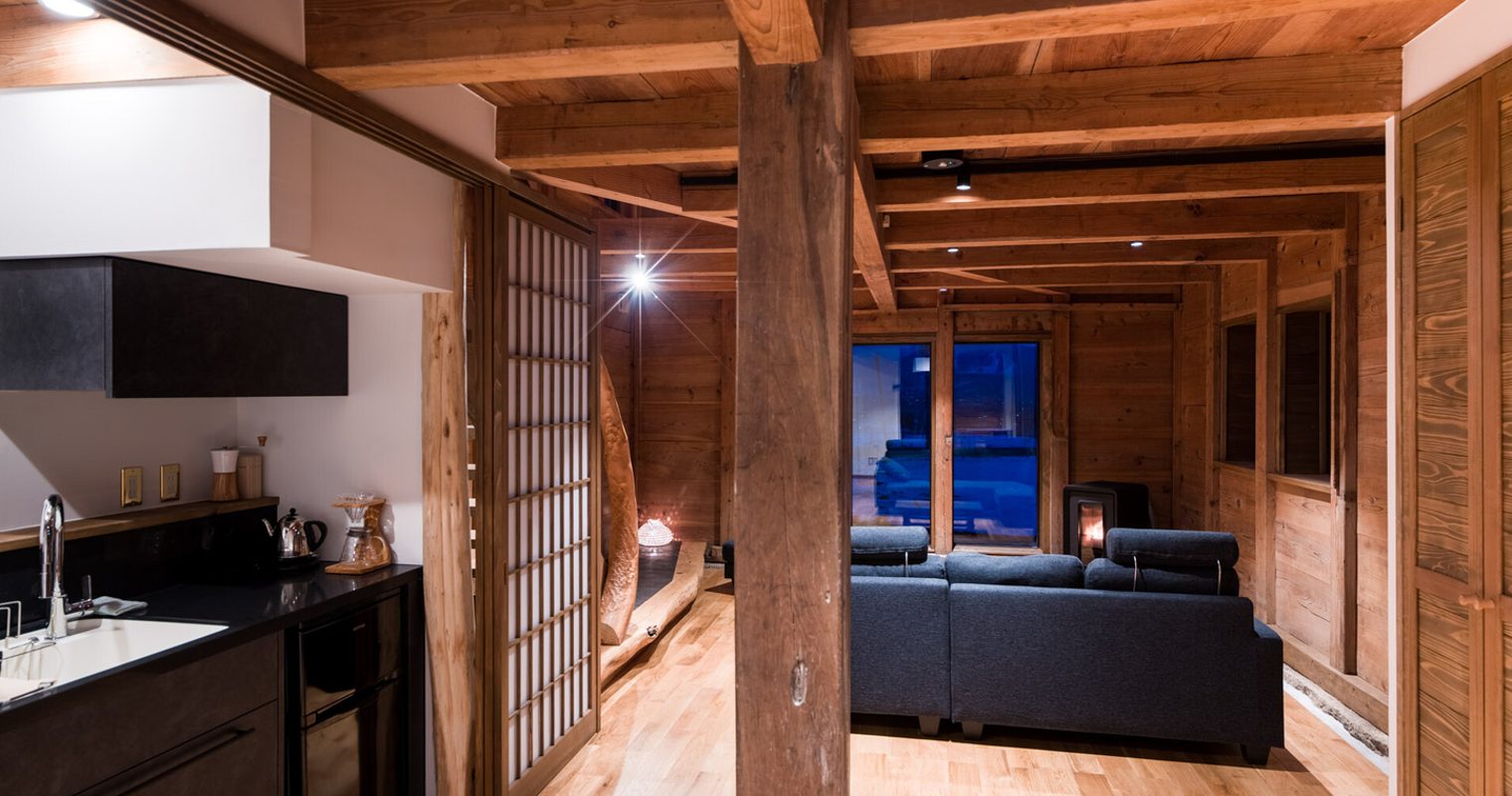 The Omoya is the thoughtfully restored 260-year-old kominka farmhouse. The set up – with two ensuite bathrooms and an additional connecting room – makes it great choice for families. After a day exploring the countryside, you can unwind in the onsen-style bathroom, where a grand hinoki bath leads out to a peaceful Japanese garden. There’s a spacious living area with comfy couches, or for a more traditional relaxation stop, there’s a washitsu, a Japanese-style room with a classic irori hearth.