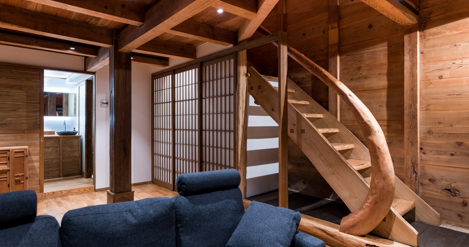 The Tonari No Ie is a renovated minka farmhouse, with a rust-red roof, original beams, and large windows to make the most of the view. Wood-burning stoves and underfloor heating keep it cozy, while there are some fun touches – including a drum kit and guitar. Climb the ladder to the raised platform where you’ll find the bedrooms, tucked beneath the pitched roof.