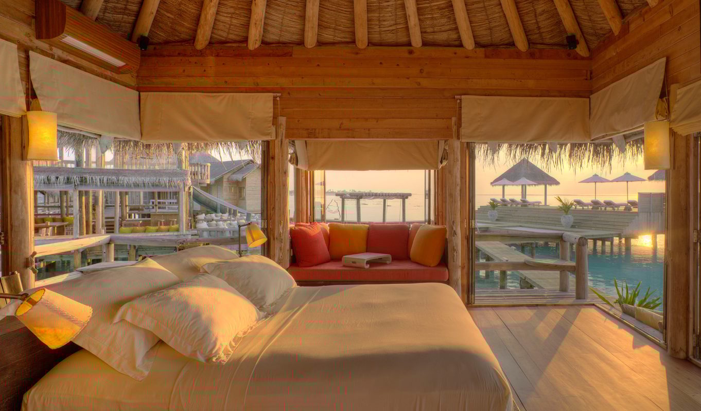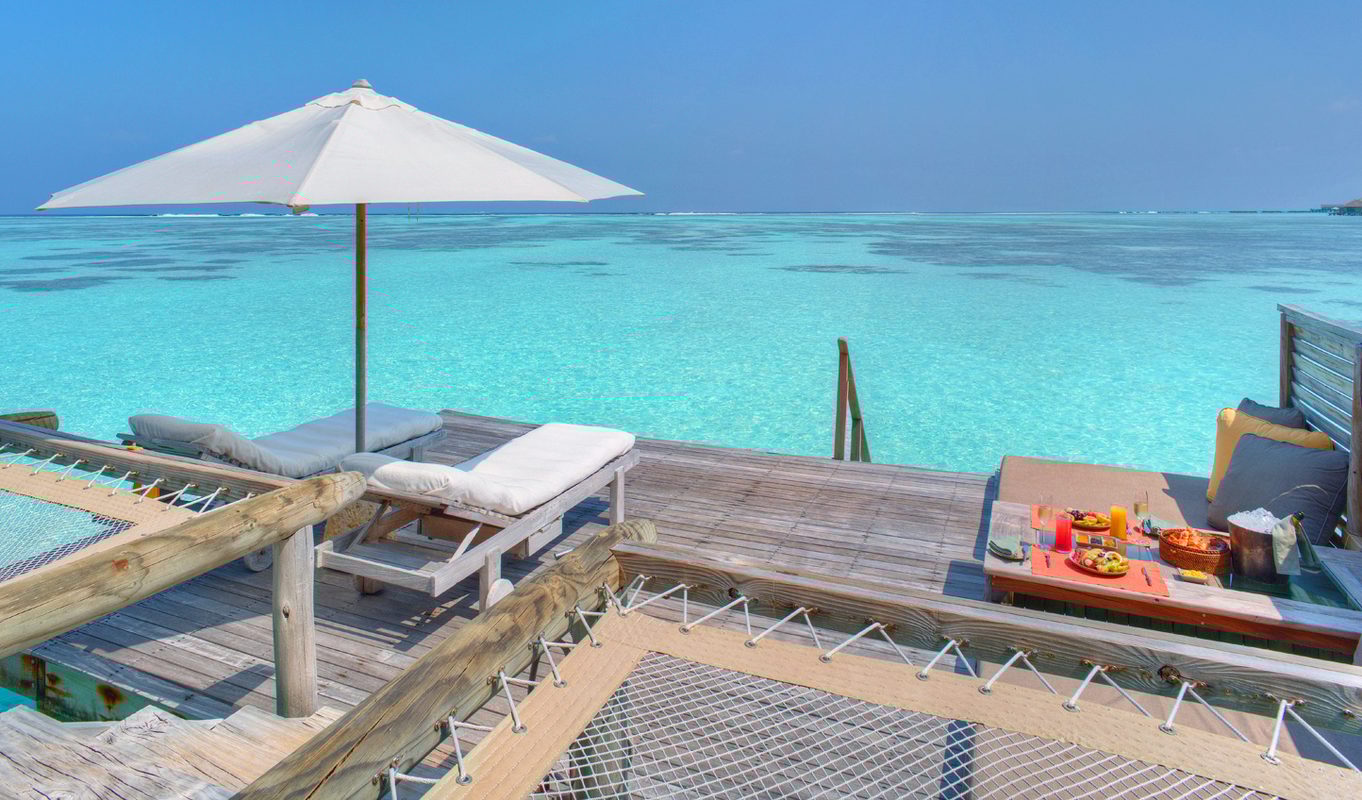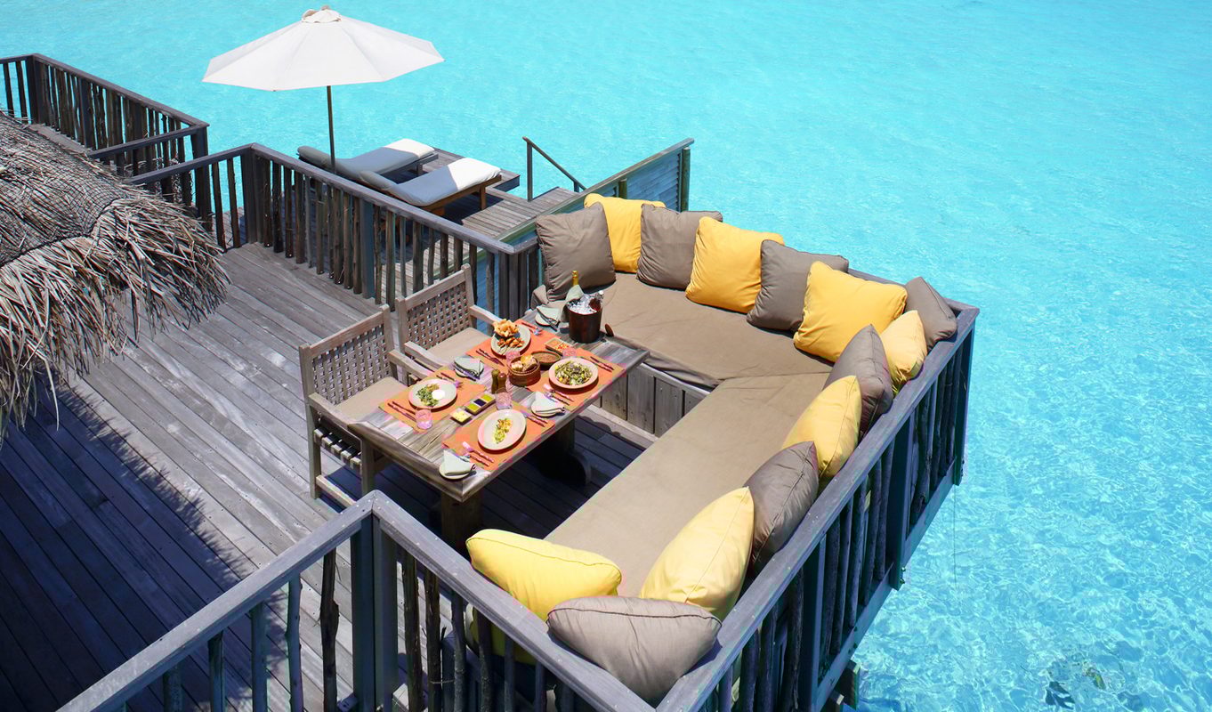 Each villa is designed to be environmentally friendly and to include its own water garden, sun deck, open-air living room and separate shower linked to the bathroom by an open-air walkway. The decor of each villa is impeccable, embracing a true Robinson Crusoe, barefoot shabby-chic style. Without losing any quality or comforts. From the incredibly spacious bathroom and roof deck, you can hear your Bose sound system throughout – but nothing beats turning off the music and watching the night sky from the privacy of your overwater hammocks. For that extra bit of indulgence, there’s always the five-room retreat, tucked away 300 meters from the closest villa, with two master suites, a guest room, a private spa and gym, as well as a central open plan living area with sea garden, natural coral pool, sun decks and daybeds. Oh and a slide into the crystal waters. Naturally.