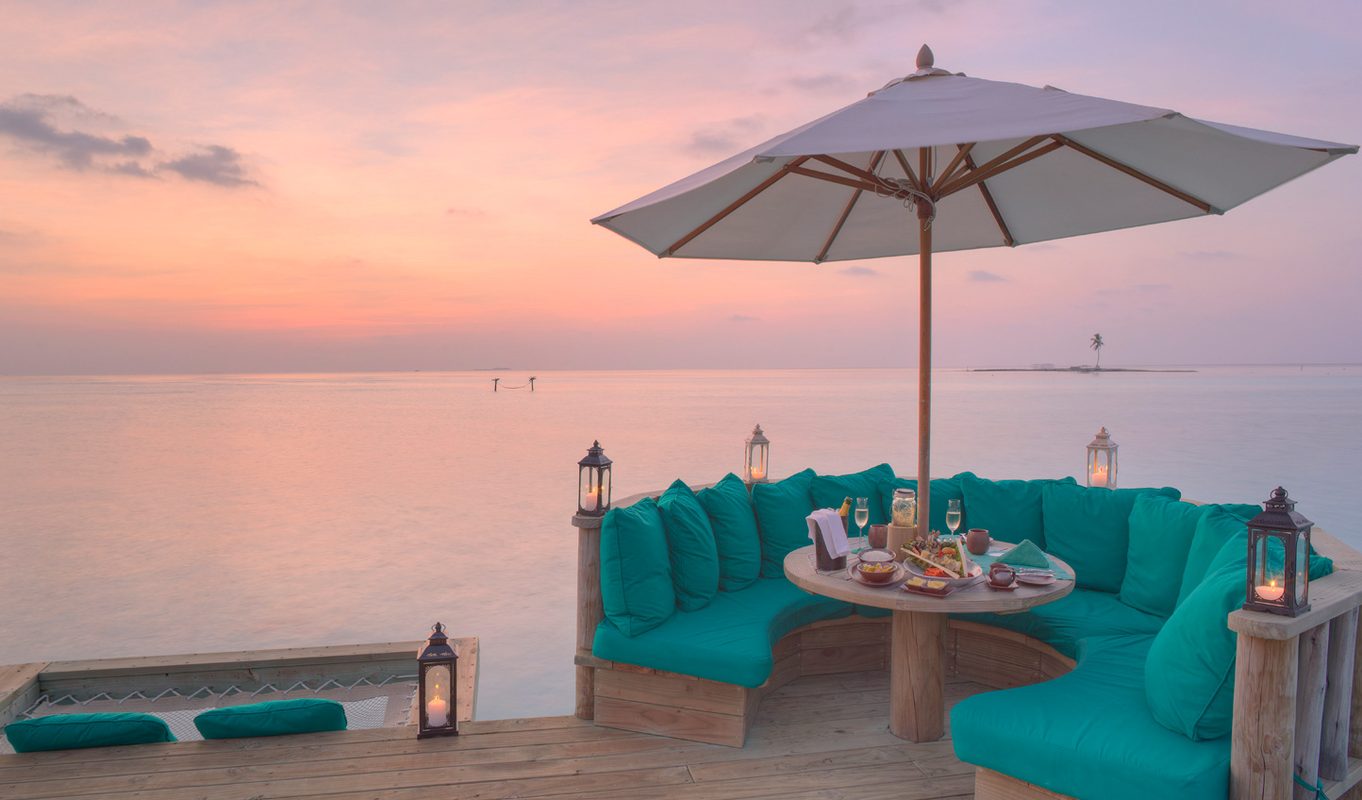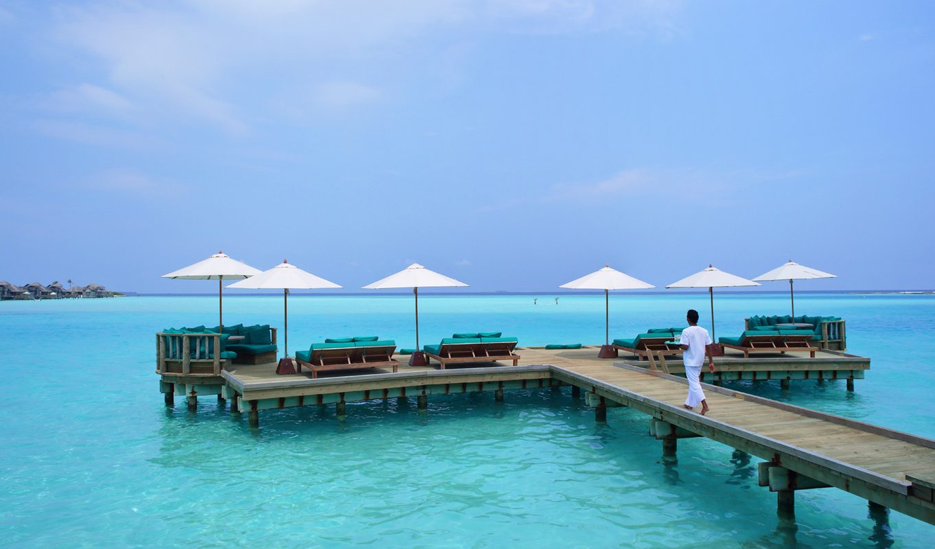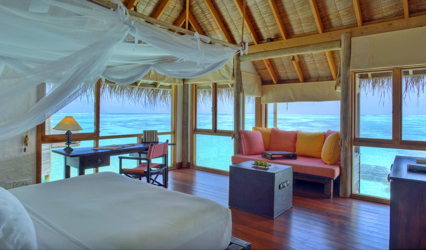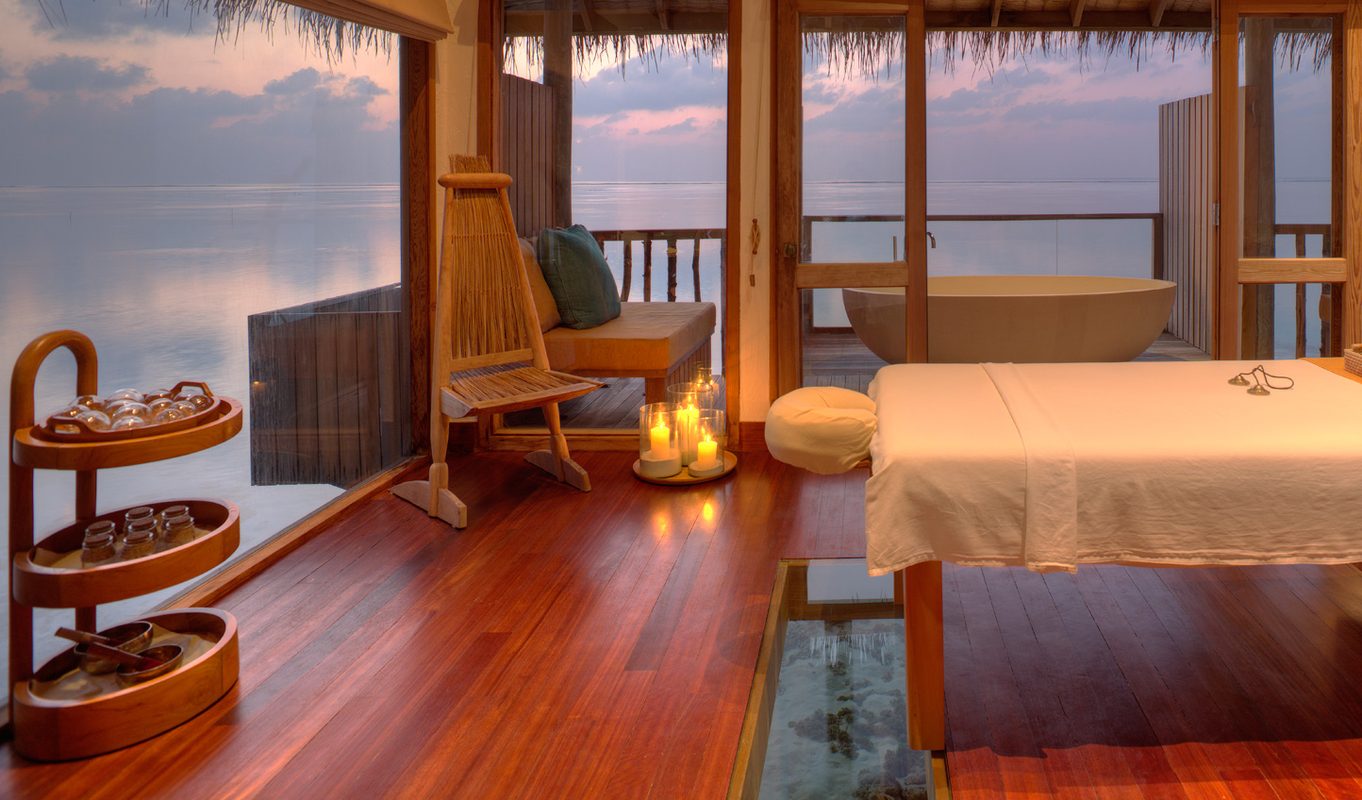 Each villa is designed to be environmentally friendly and to include its own water garden, sun deck, open-air living room and separate shower linked to the bathroom by an open-air walkway. The decor of each villa is impeccable, embracing a true Robinson Crusoe, barefoot shabby-chic style. Without losing any quality or comforts. From the incredibly spacious bathroom and roof deck, you can hear your Bose sound system throughout – but nothing beats turning off the music and watching the night sky from the privacy of your overwater hammocks. For that extra bit of indulgence, there’s always the five-room retreat, tucked away 300 meters from the closest villa, with two master suites, a guest room, a private spa and gym, as well as a central open plan living area with sea garden, natural coral pool, sun decks and daybeds. Oh and a slide into the crystal waters. Naturally.