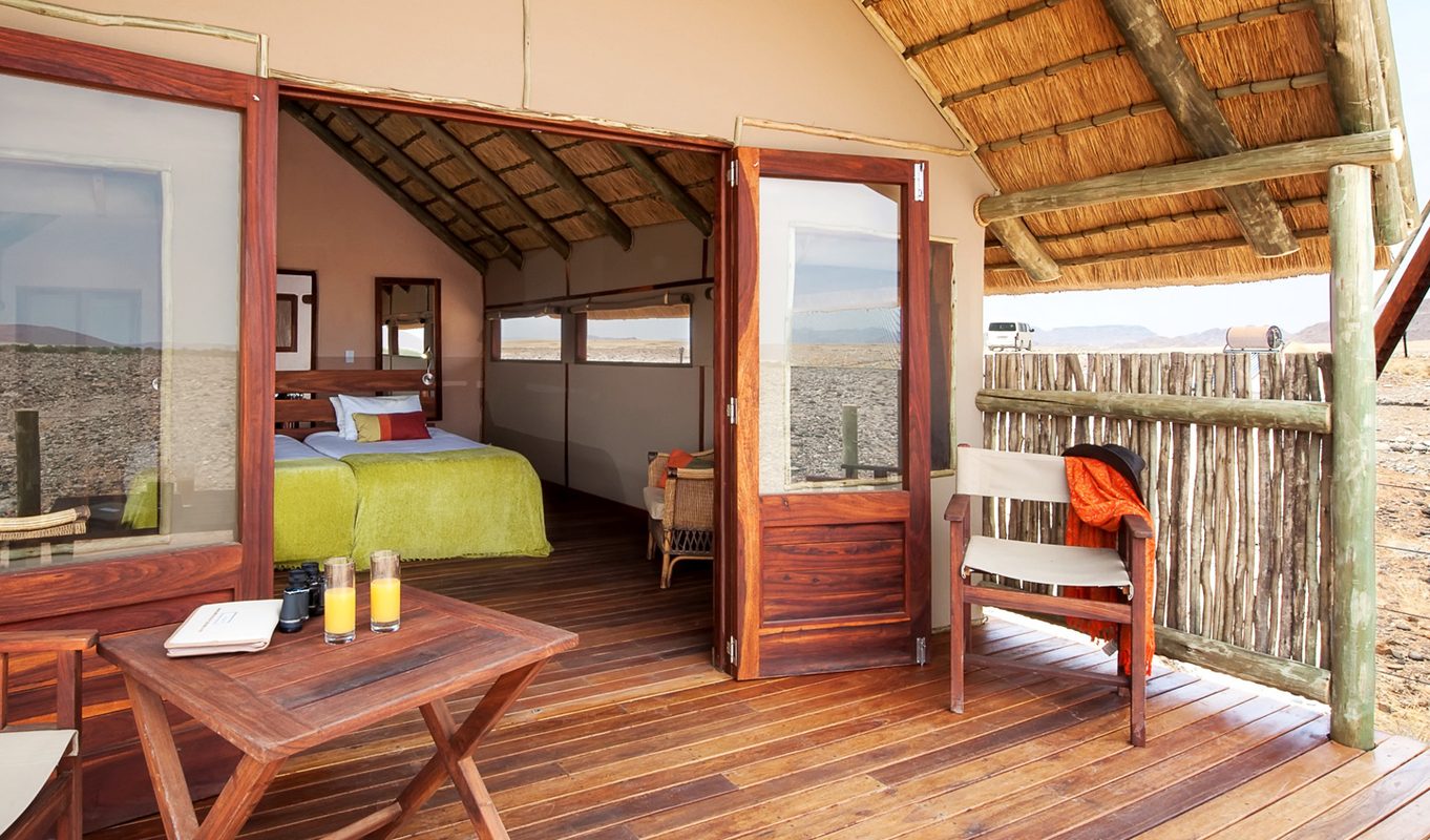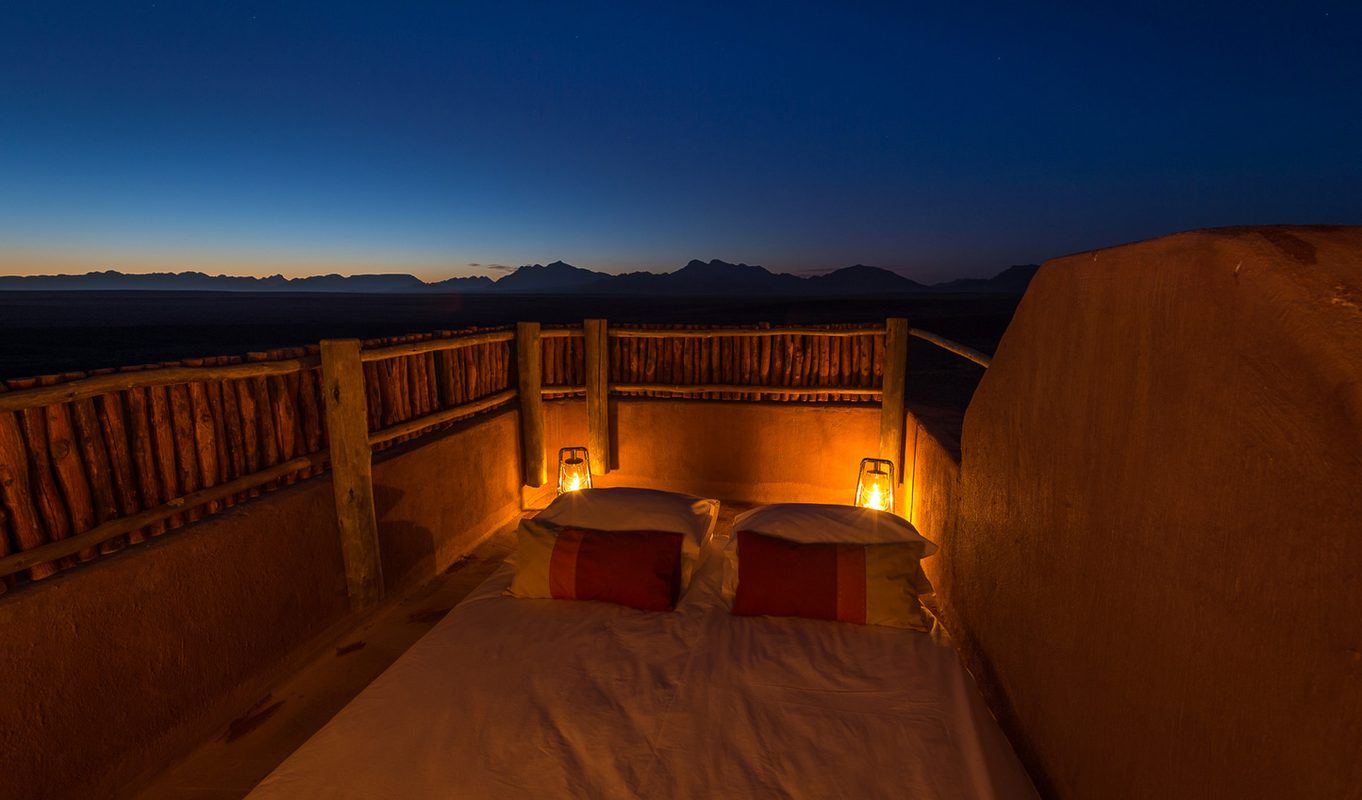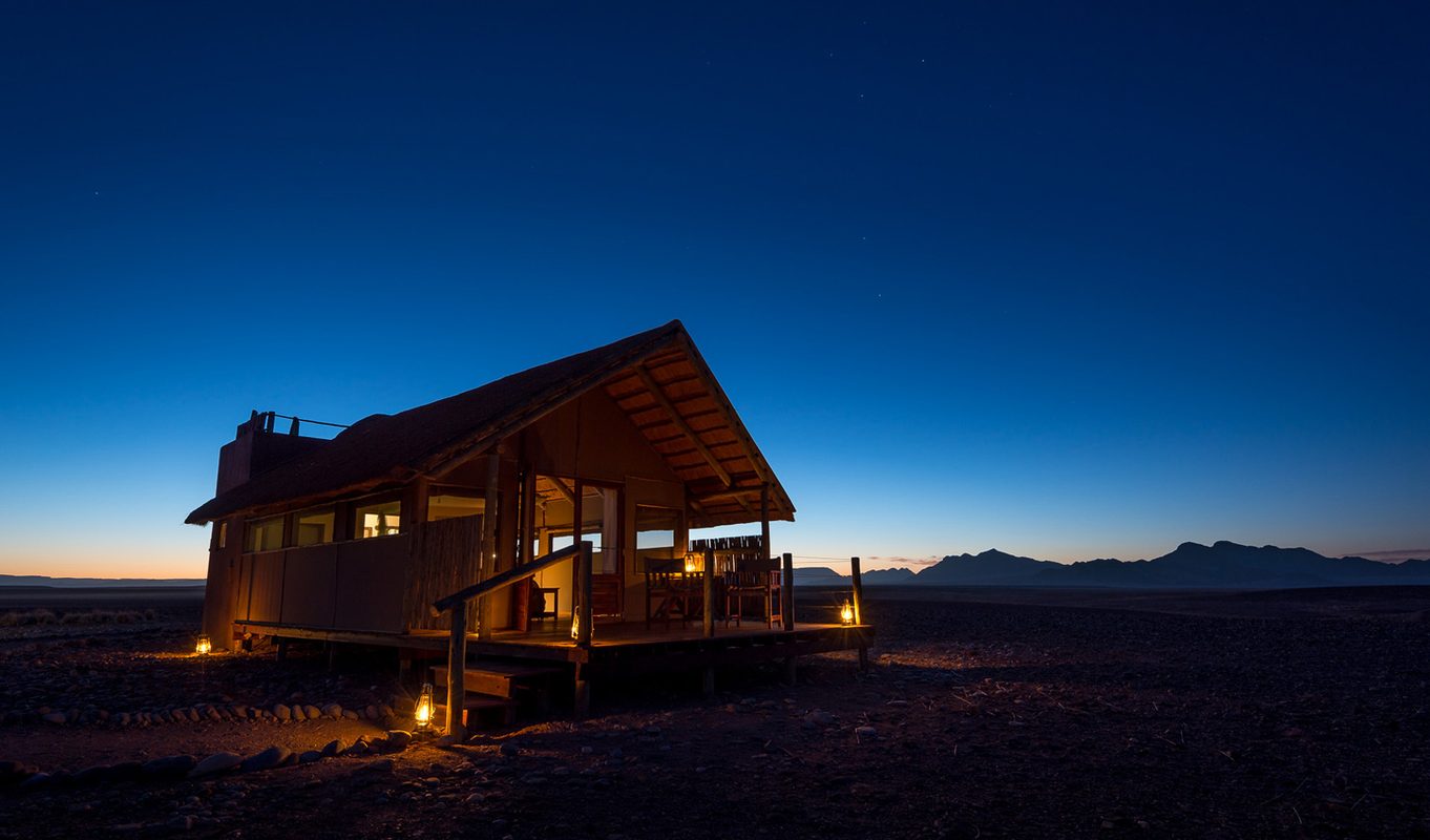 With just 23 thatched and canvas ‘kulalas’ purpose-built on wooden platforms to catch the cooling desert breeze and completed with rooftop decks for starlit sleepovers, it is clear that Kulala Desert Lodge is no ordinary safari experience. With larger tents to accommodate families and a beautifully furnished communal area with a cosy lounge, cooling plunge pool and wrap-around veranda overlooking the riverbed, Kulala is a ruby in the rose-gold Namib wilderness.