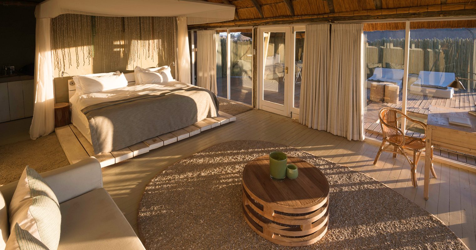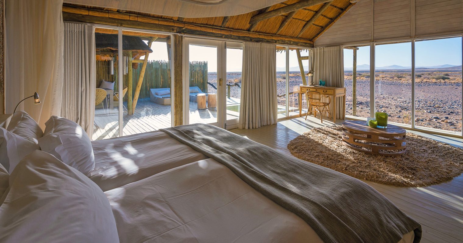 All of the 11 spacious desert villas blend in effortlessly with the surroundings thanks to gorgeous earthy tones and textures used all over Little Kulala (which also includes a wine cellar and its own library). Two sides of each room are covered with floor-to-ceiling glass, ensuring you don’t miss a second of Namibia’s wilderness; bamboo fences also provide complete privacy as you relax in the luxurious rooms complete with en-suite and private plunge pool and veranda. If this doesn’t cut it, head upstairs to your private outdoor terrace and sleep directly under the stars of Namibia’s impossibly clear night skies.