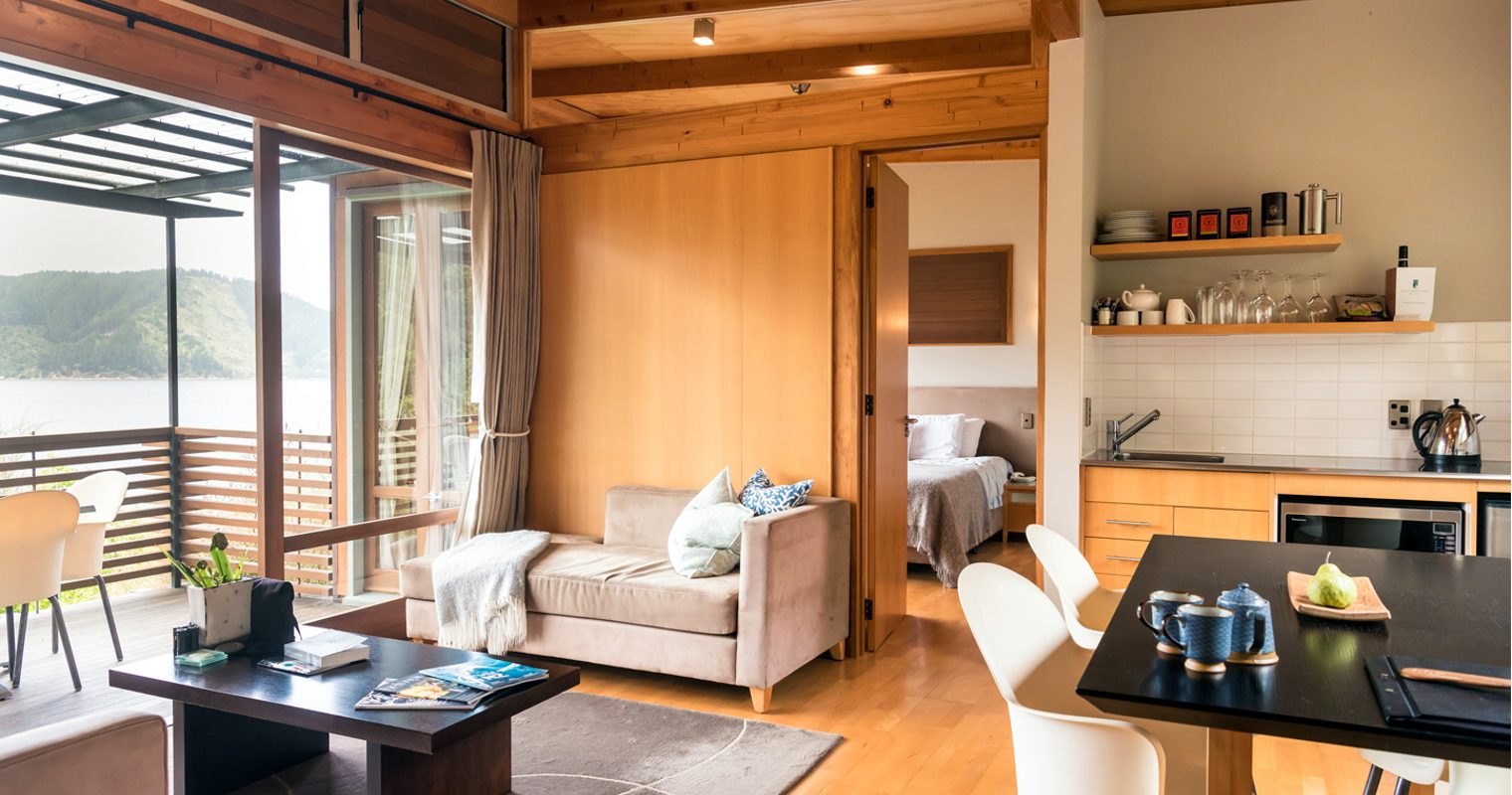 A selection of 1, 2 and 3-bedroom apartments designed with architectural finesse and huddled in amongst the bush provide spectacular natural views across Arthur’s Bay, with the shoreline just a stone’s throw beneath you. Hear nothing but the sound of water lapping the cove below and local birdlife whilst you unwind in luxurious home comforts and natural wood interiors. We love the Kereru Suite, an intimate experience that includes a spacious and secluded spa deck with sunken Jacuzzi. After all, nothing beats the feeling of being completely surrounded by nature – and the Kereru Suite achieves this so effortlessly.