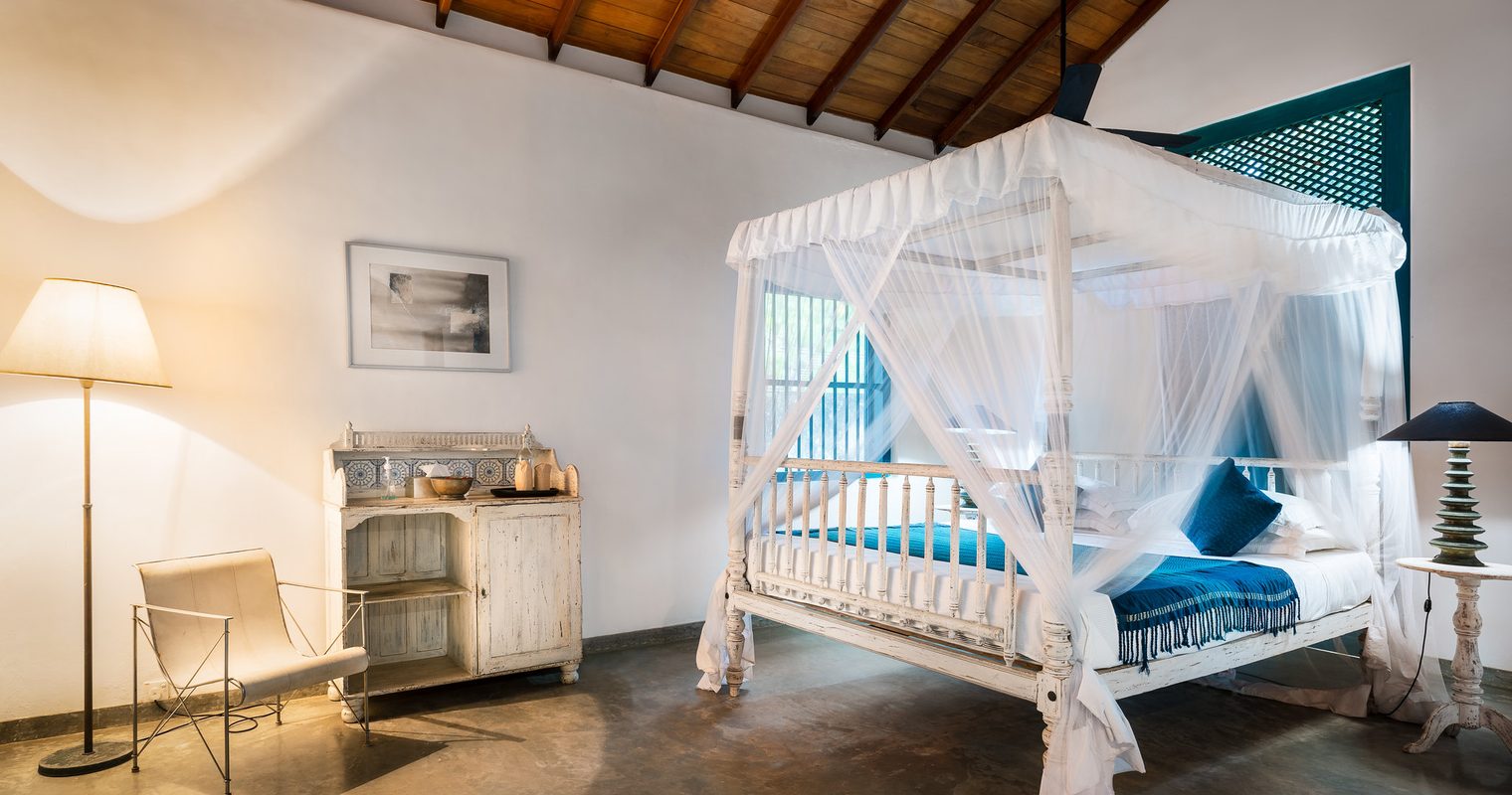 Each of the six rooms at The Last House showcases their own unique personality, with names such as Atteriya and Moonamal. Fresh white walls and polished floors serve as a backdrop to antique furnishings such as netted four-poster beds, whilst splashes of bright colour bring that signature Bawa touch. Downstairs bedrooms open up onto the gardens whilst the expansive Cinnamon Hill suite upstairs looks out over the vastness of the Indian Ocean with a gentle breeze drifting in through the shutters.