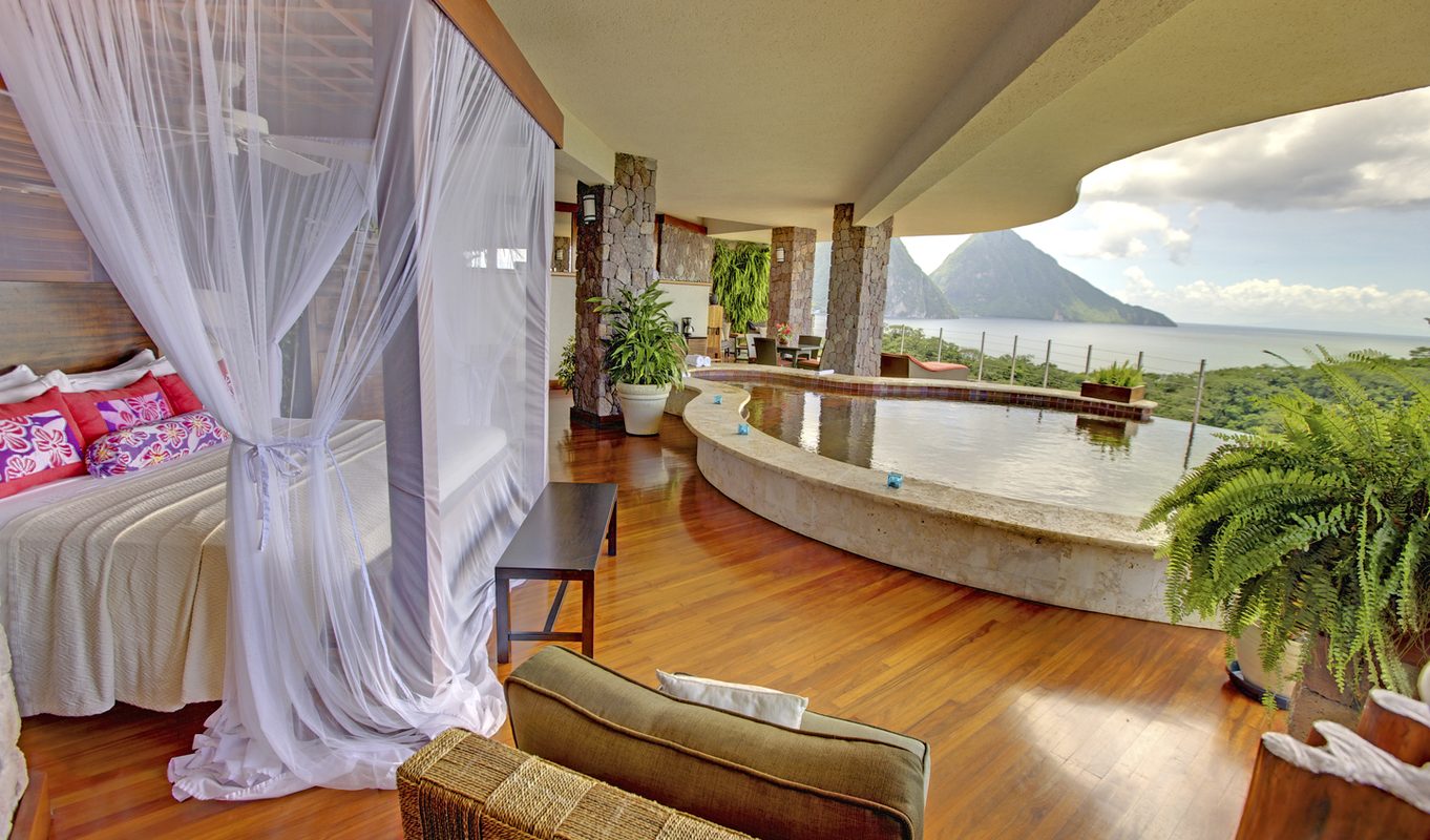 What better way to take advantage of the greatest view in the world than with a private hilltop suite where one wall is completely open to a panoramic view of the serene bay and the lush landscapes, highlighted by the Piton’s jagged twin peaks. Your 1,500+sq ft room, or sanctuary, as the hotel has labelled them, houses a 650 sq ft private infinity pool that magically hovers above the majestic view. A private stone walkway leads to your mountain sanctuary and your room’s location, perched on the side of a mountain, guarantees your complete seclusion and absolute privacy even with a completely open fourth wall.