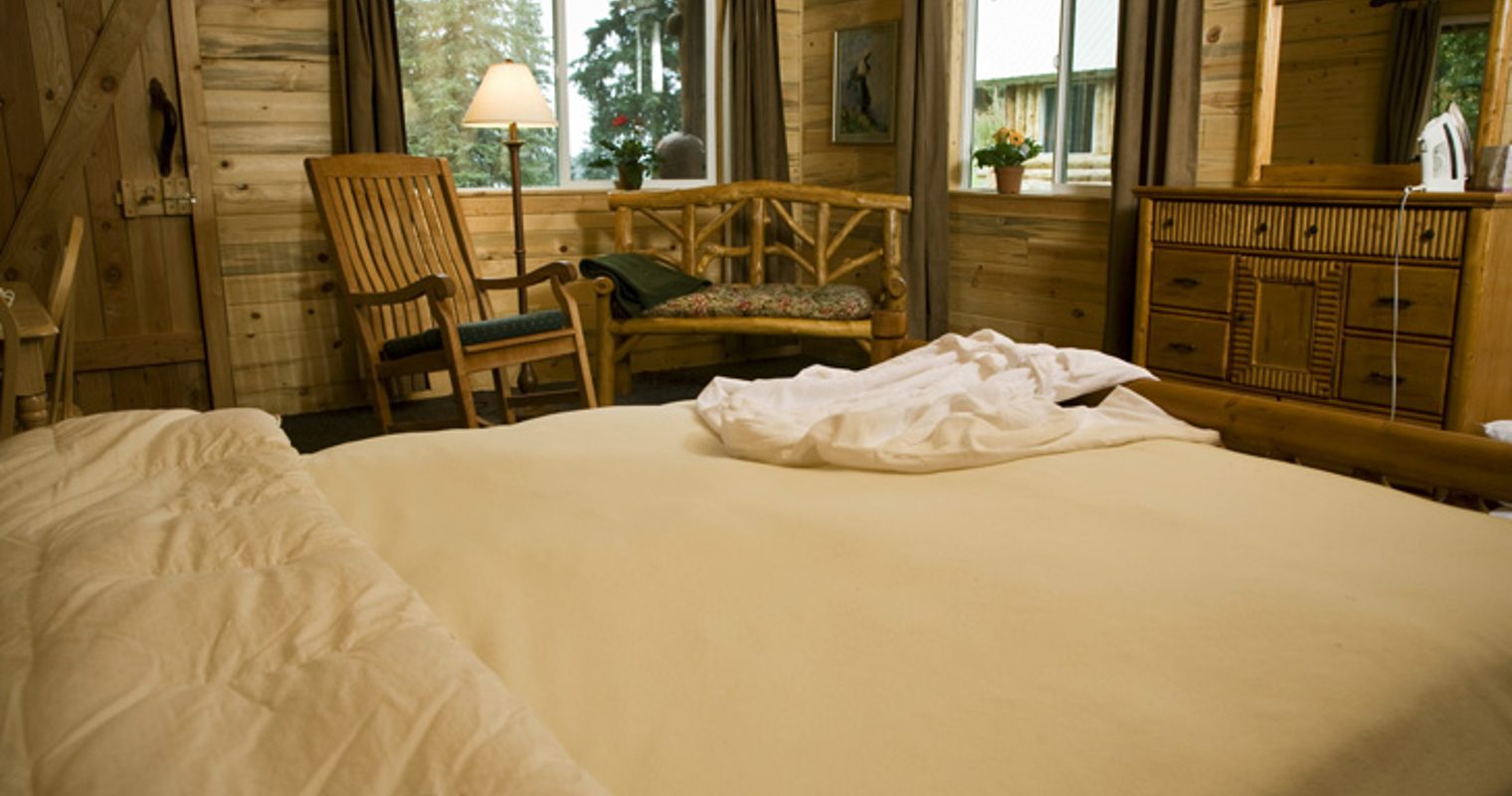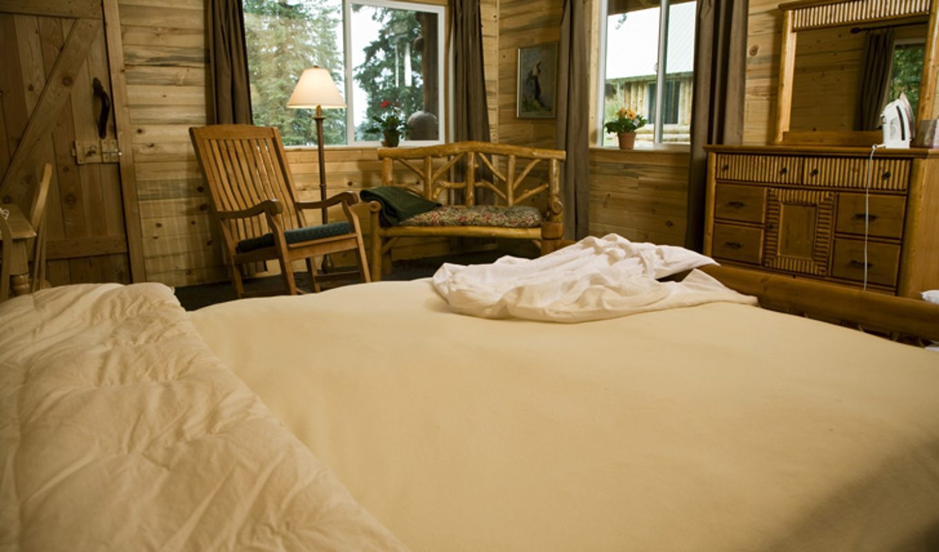 The lodge’s five cabins offer warm, rustic comfort in the heart of this extraordinary landscape. Varying in size, the smaller cabins; The Mountain Pass and Happy River cabins, sleep two, while the largest; The Red Lake Trail Cabin accommodates up to seven guests. They are each built in the handmade Alaskan style, with exposed log construction and steep, sloping roofs. Inside, there is handmade wooden furniture, rustic queen size log beds, porches to sit out on for a early evening glass of wine, and of course, incredible views over the lake and surrounding scenery