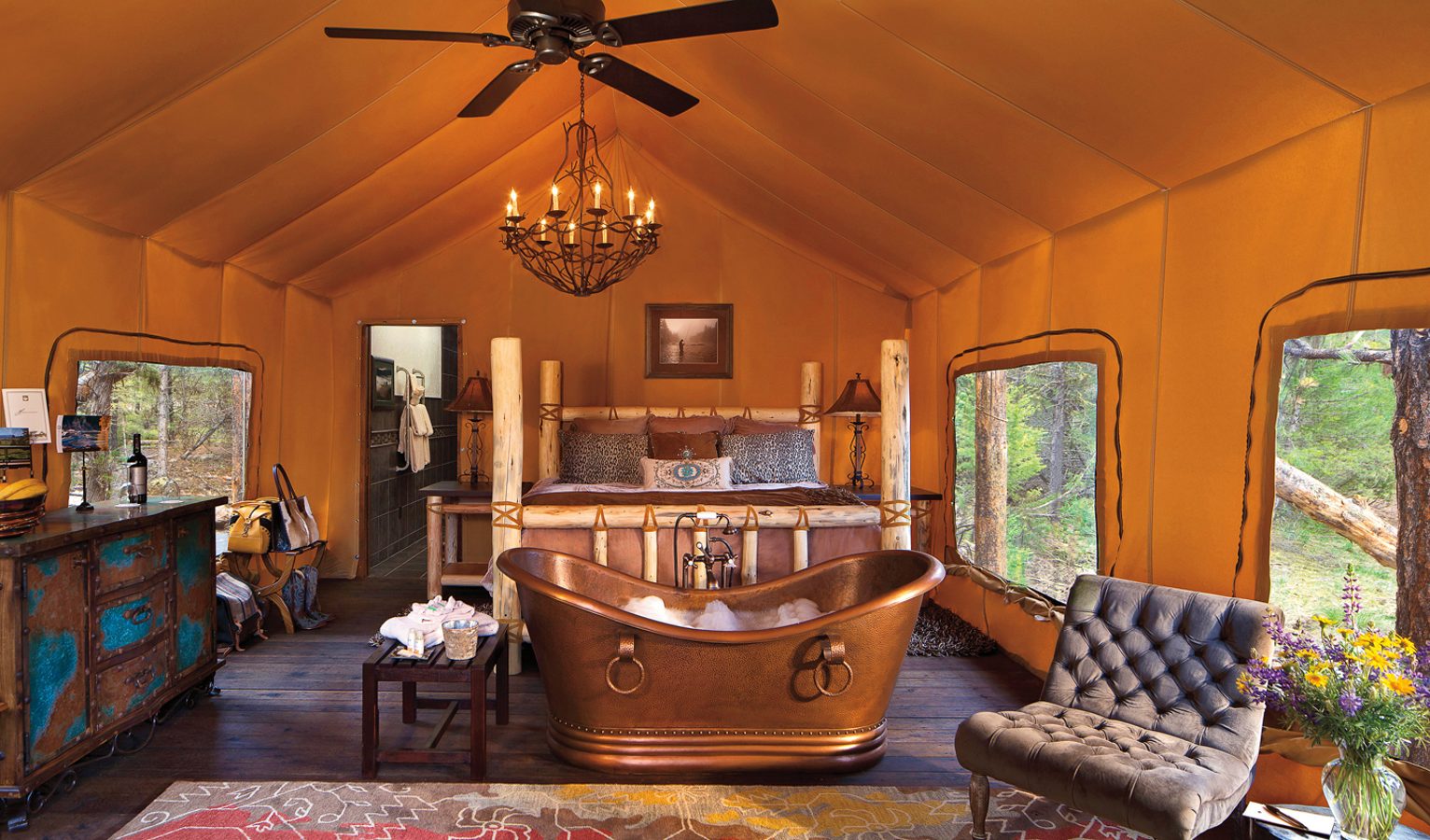 Located in the heart of South-western Montana, the Ranch at Rock Creek is a traditionally styled ultra-luxurious ranch that’s part of the esteemed Relais & Châteaux group. There’s as much to enjoy outside as there is inside here, with acres of mountains, meadows, lakes, and streams to explore on horseback or foot. Roll-top baths, leather arm chairs, antiques, and open fires feature in many of the cabin rooms, or for a more relaxed stay, try one of the teen-favourite Luxury Canvas Cabins, which line the banks of Rock Creek. After a day exploring, gather up the gang and live out your Wild West fantasies in the Silver Dog Saloon, with its seriously cool four-lane bowling alley, or leave them to it, while you indulge in a Saddle Sore Soak treatment in the spa.