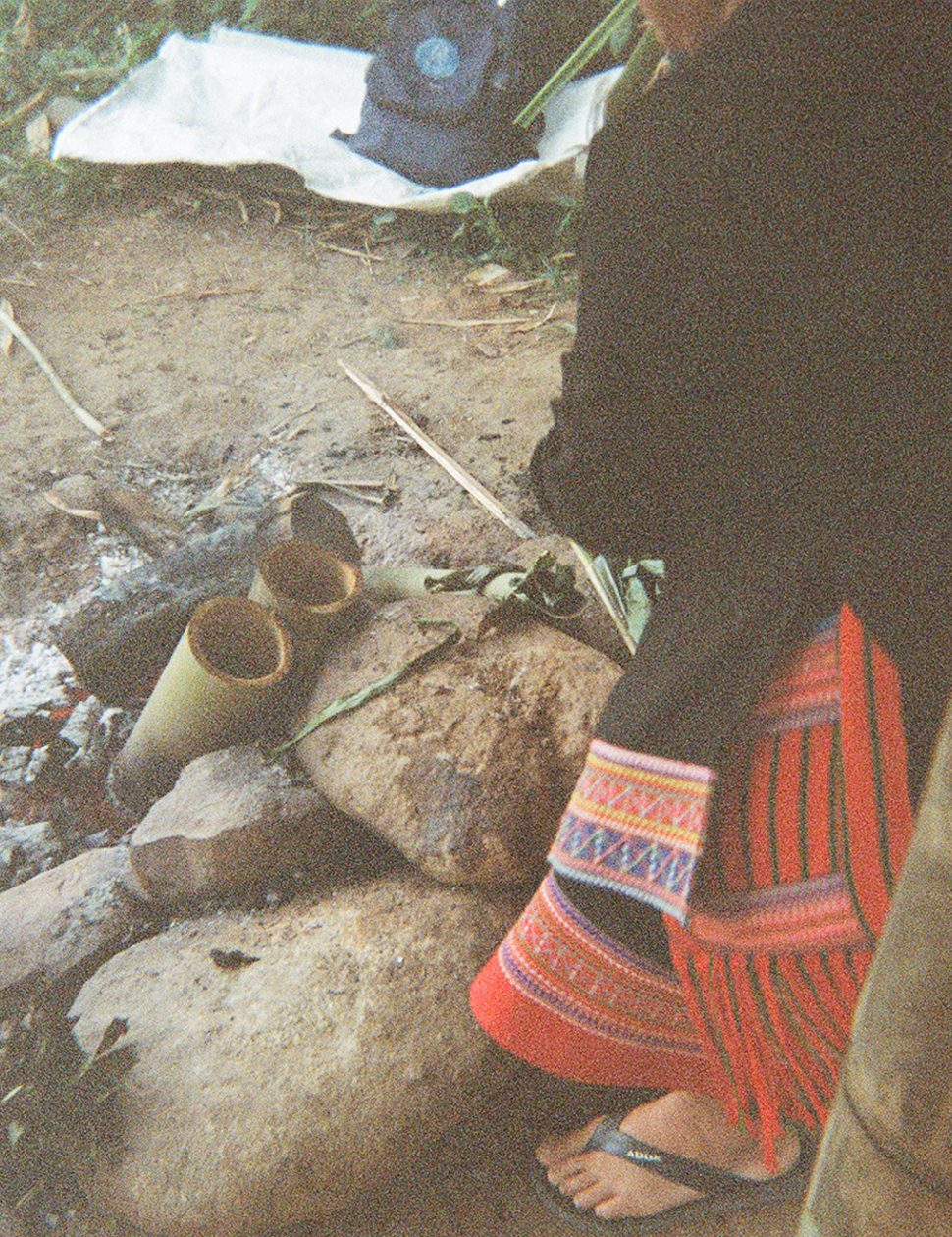 We had time to stop, to break the journey – making a detour to Chiang Rai, and to spend time in a Lahu hill-tribe village. With them we broke bread (actually – broth, noodles, vegetables) – a meal that was served on the banks of a river, the entire feast cooked right in front of us. Red chilli paste. Flicks of flame and smoke rising through the trees, across the water. Bamboo vessels, bamboo utensils. Sam, our local guide, taught my son how to make a flute from the grass and palm stems that shaded the waters.