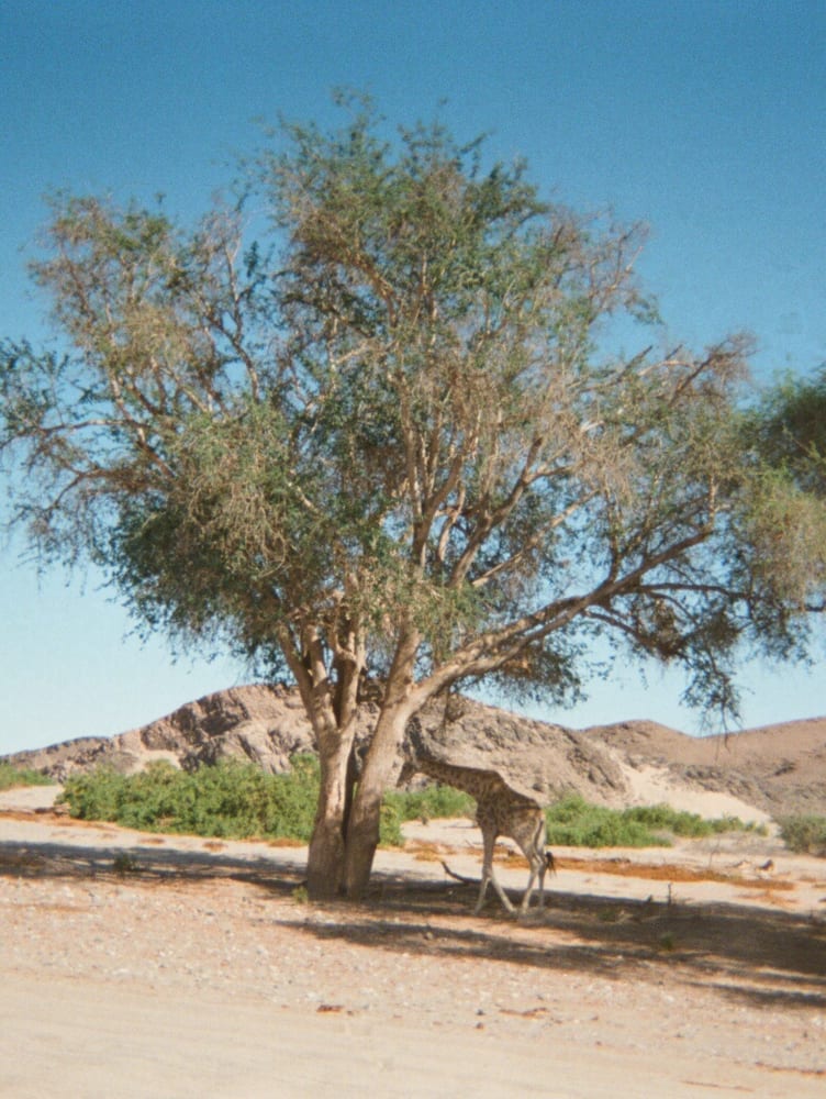 While we linger here a while, Mike clocks fresh lion tracks. The quest continues. The next hour passes in a stop-start whirlwind, following the lion’s tracks only to lose them, then finding them again before losing them again. But with Mike’s excellent tracking skills – which he developed from his previous work at the renowned Kruger National Park (South Africa’s largest game reserve) – our (his) tracking is successful. Tucked away from the midday heat, we discover a pride of three lions bathing beneath the shade of camel thorn trees. They are still, almost statuesque, as they lie and slumber in their cool, resting spot. The first to see them in months, we are lucky to have spotted them. This was also my first time seeing lions in the wild, let alone tracking them, so it’s safe to say I was very happy with our success. Thanks, Mike.