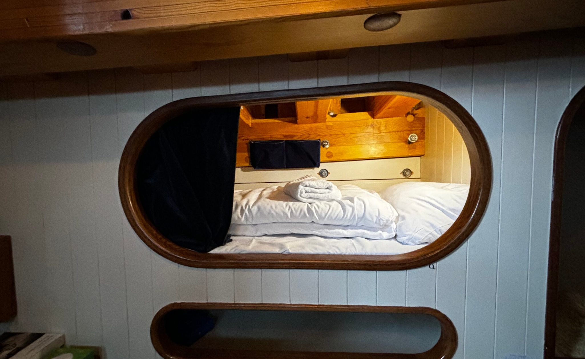 Taking twelve years to build by hand, the Alma is a faithful replica of the Gjøa, Amundsen’s legendary vessel. Berthing a crew of up to twelve, you’ll eat and sleep in a large, shared cabin. We say “crew” because there are no passengers. Sailing the Alma is a satisfyingly hands-on experience. You need commitment, grit, and a sense of adventure. Everyone chips in.