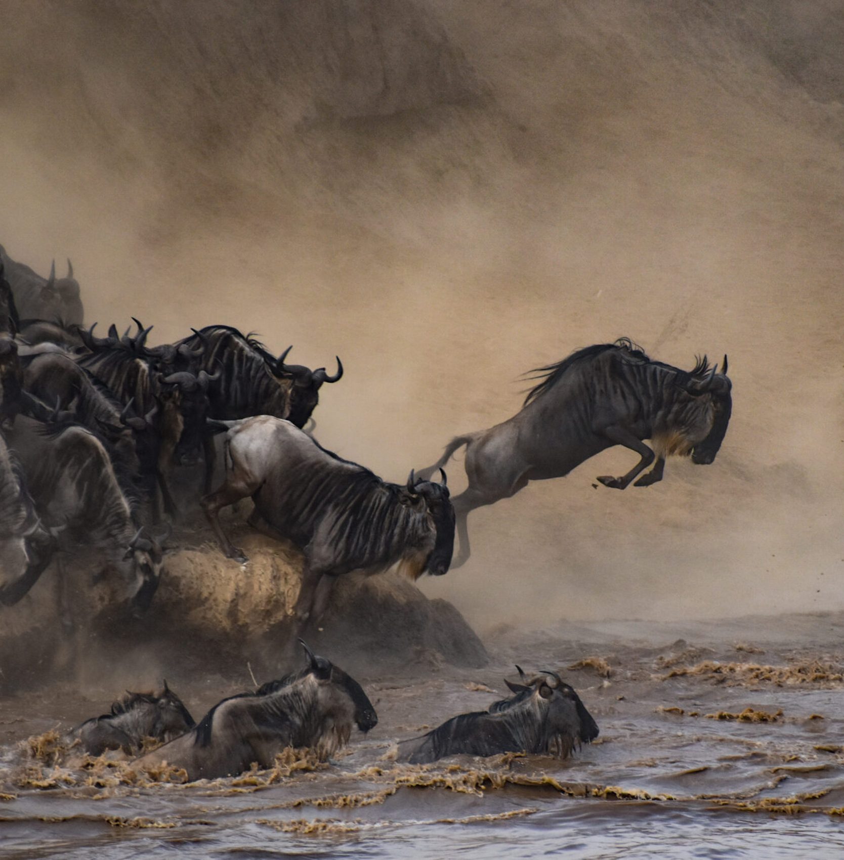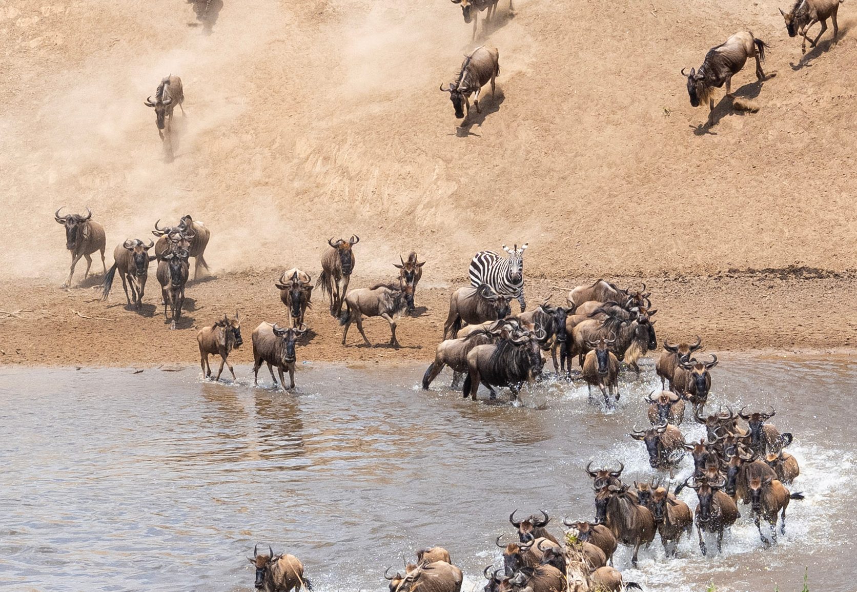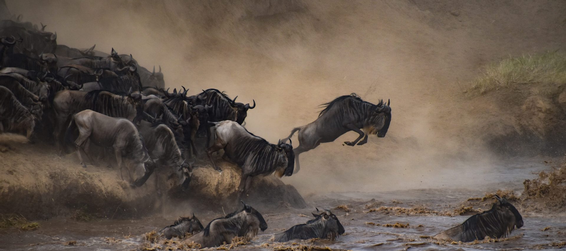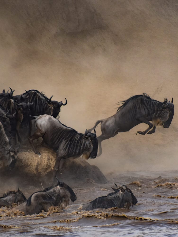 And then, suddenly, the first wildebeest crossed. Then the second, then the third, then hundreds flooded into the banks, crossing straight toward us. Even after they made it to the other side—each and every one of them, safely—adrenaline kept them frantically in motion, bucking and grunting, still fighting for their lives. Damn, these creatures are brave, I thought.