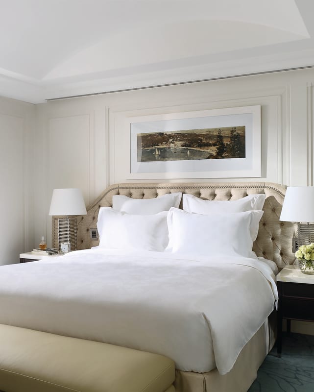Beneath high ceilings and within soft panelled walls, the 98 rooms and suites are bound in soft leathers and accented with silks of aquamarine, peach and chartreuse, with large windows bathing the rooms in sunlight with their views out towards the city or harbour. Mirrored surfaces topped with delicate roses and king-sized beds backed by buttoned headboards in a subtle dove grey, give a sense of homeliness as you settle in for a few nights. To make the most of it though, opt for a terrace room or suite and simply step out and soak it all in.