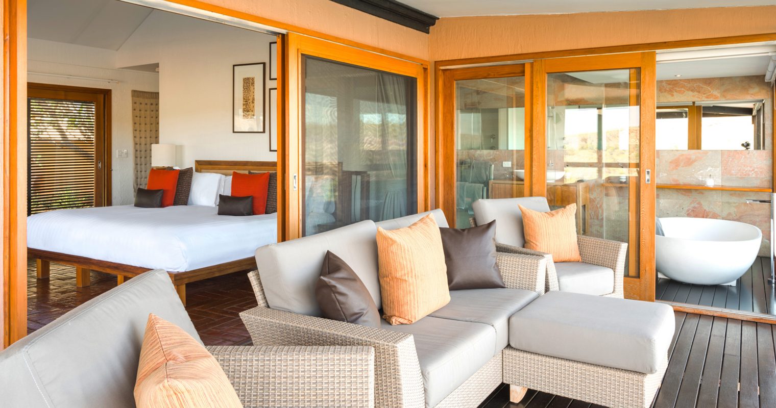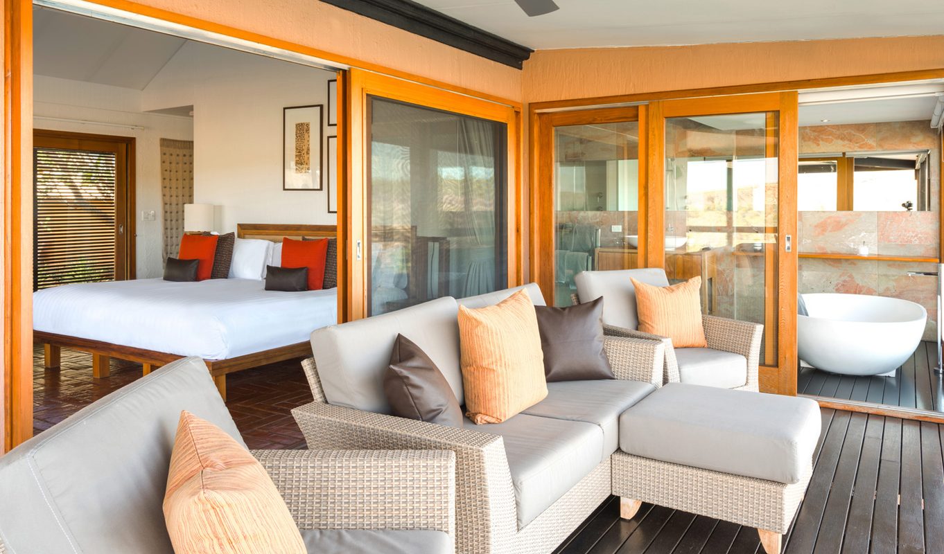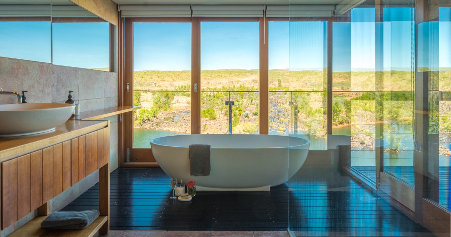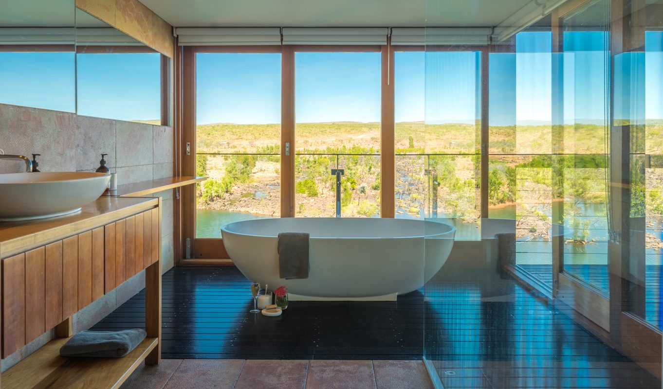 The massive Chamberlain gorge rooms, surrounded by lush gardens and ancient baobab trees, are all decked out with chic lounging areas and outdoor stone bathtubs; perfect for letting those stresses and strains melt away under the stars. Inside your comfy bedroom, the décor is an eclectic mix of modern meets rustic Australian. The gorgeous Chamberlain suite extends way out over the gorge and offers panoramic vistas from the bedroom and surrounding verandas.