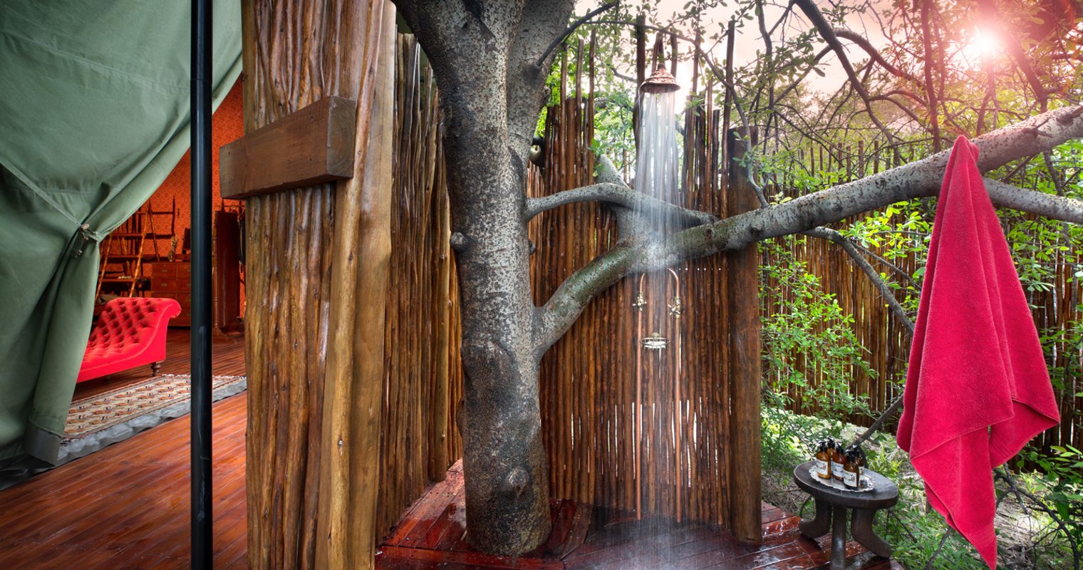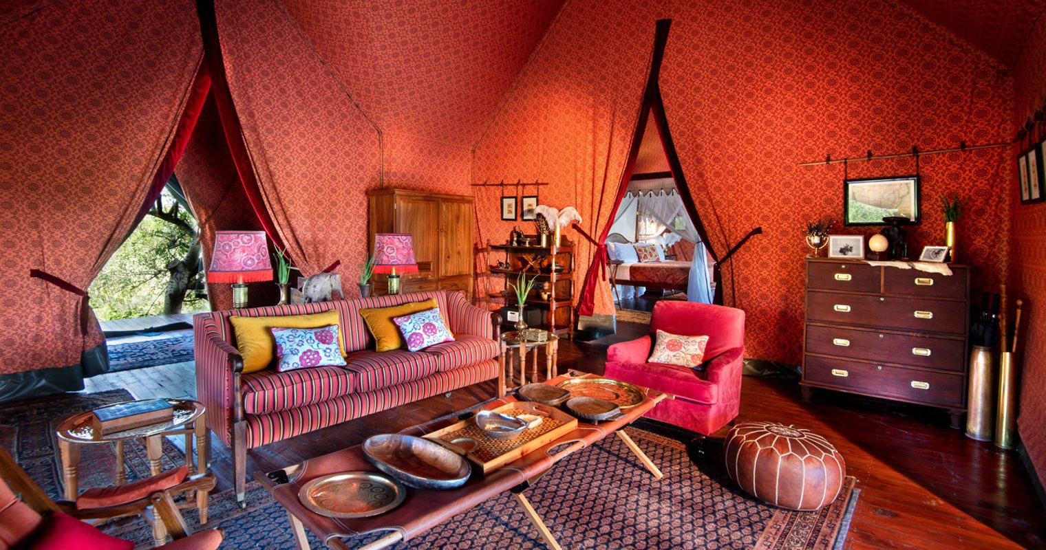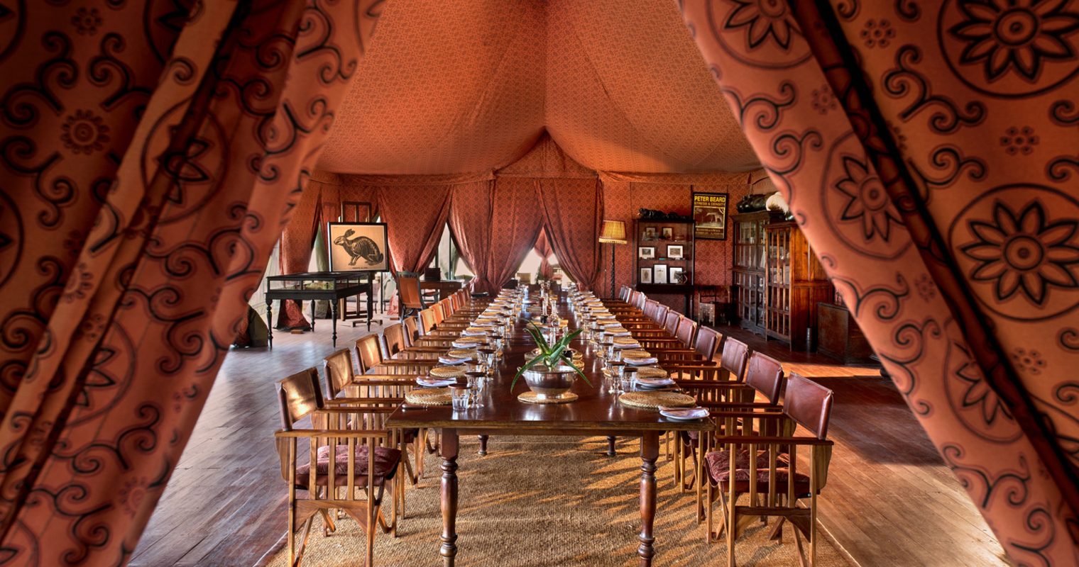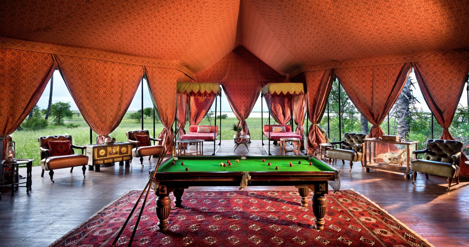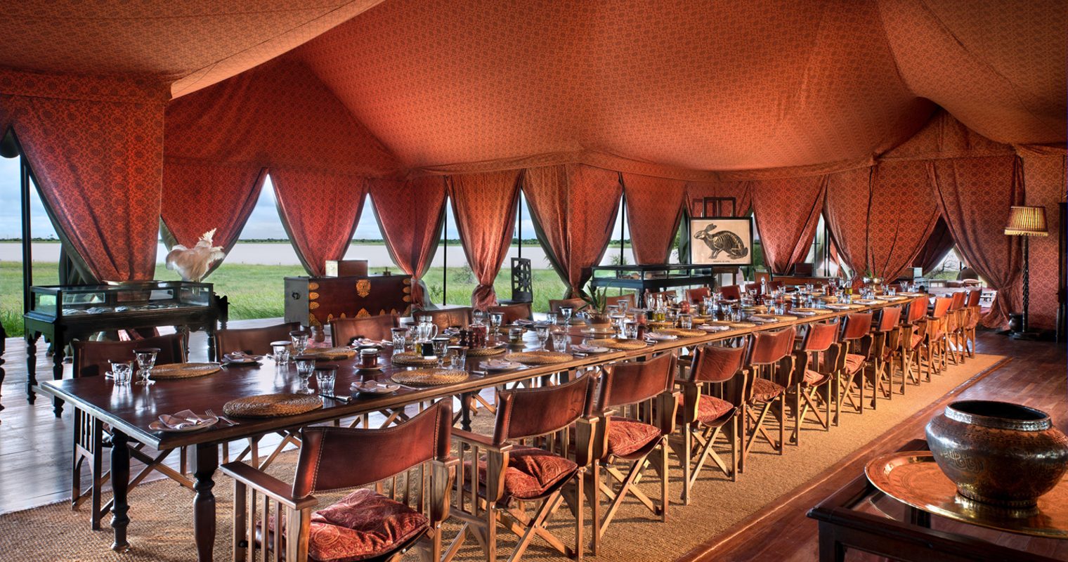 Jack’s camp consists of ten green roomy and stylish canvas tents with en-suite bathrooms and indoor and outdoor showers (for those who want to feel the Kalahari breeze on their skin). They have been fashioned in classical 1940’s style with Persian rugs underfoot, cool cotton sheets and mahogany and brass campaign-style kit from old family safari stores. These form a striking contrast with the rugged wilderness viewed from the comfort of one’s own veranda.