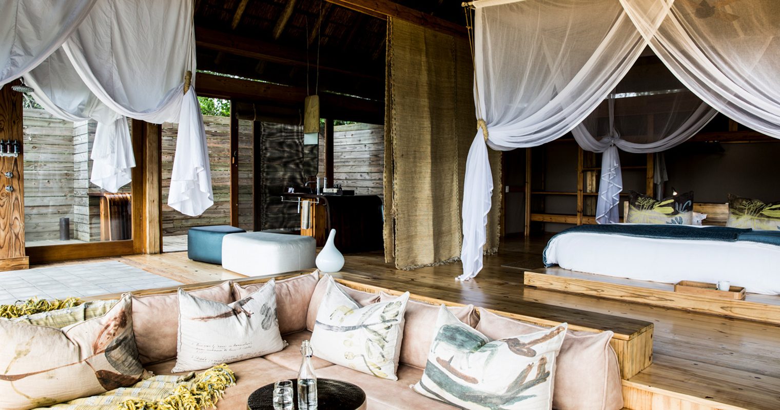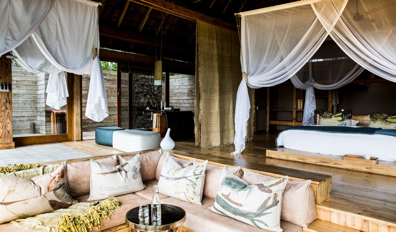 Split between a north and south camp, each camp is made up of seven luxurious tents, elevated off the ground on wooden platforms. Each tented suite boasts large, open-plan living spaces with contemporary designs, plush fabrics and traditional thatched roofs. Indoor and outdoor showers allow you to get in touch with nature should you so choose whilst large private verandas and plunge pools create a dreamlike setting in the wilderness to unwind and cool off after exhilarating game drives.