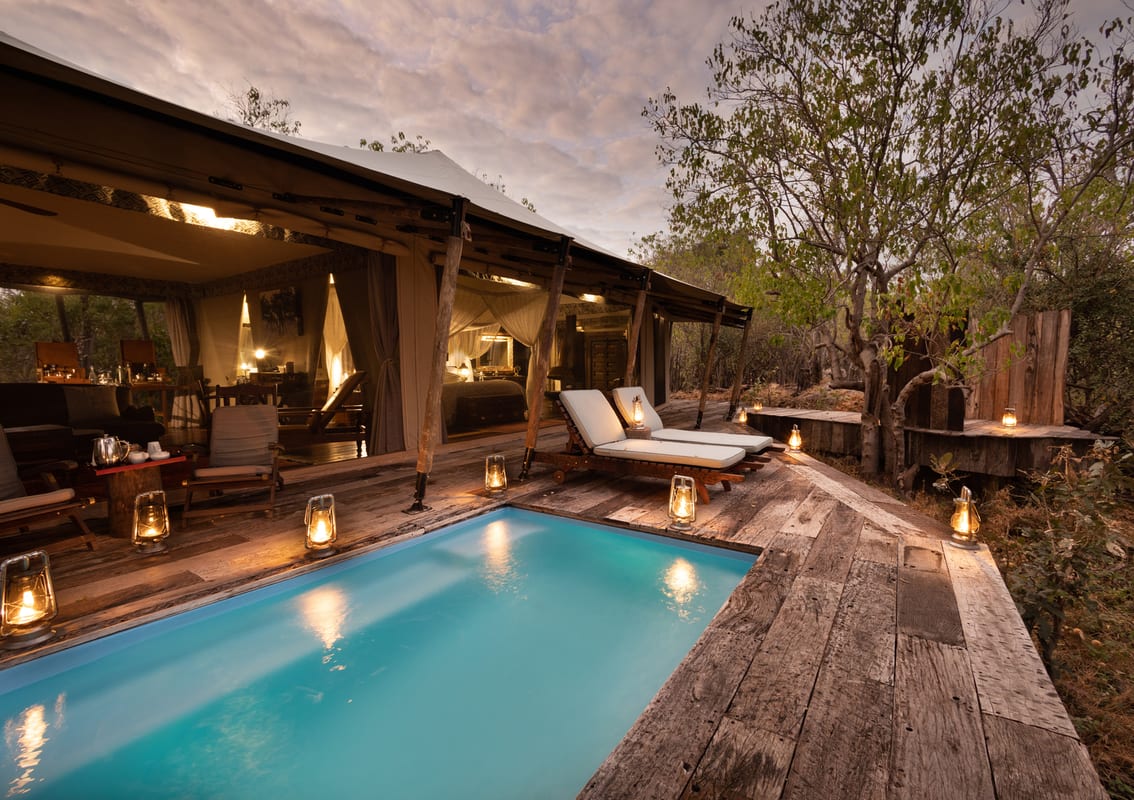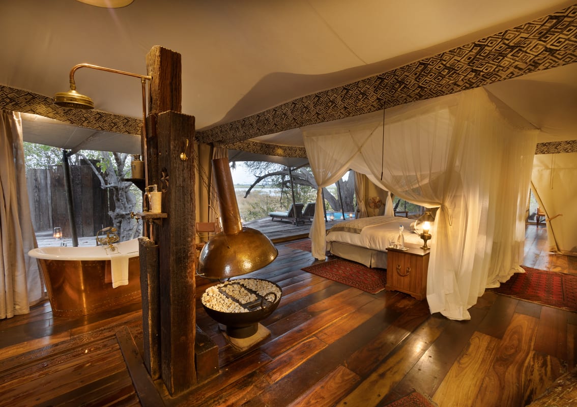Each tent and veranda is enormous (100 square meters in size) and beautifully located along the edge of the forests to take advantage of the spectacular view over the floodplains and savannas. They have spacious bedrooms and en-suite bathrooms with a copper bath looking out over the lagoon. There is even an outdoor shower. If you want to sit outside and enjoy the fresh African air and stunning views then go and sit on the veranda shaded by giant broad-leafed trees. In the winter months, there is a perfectly handcrafted copper fireplace in your tent for added warmth.