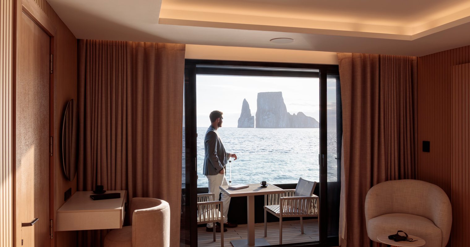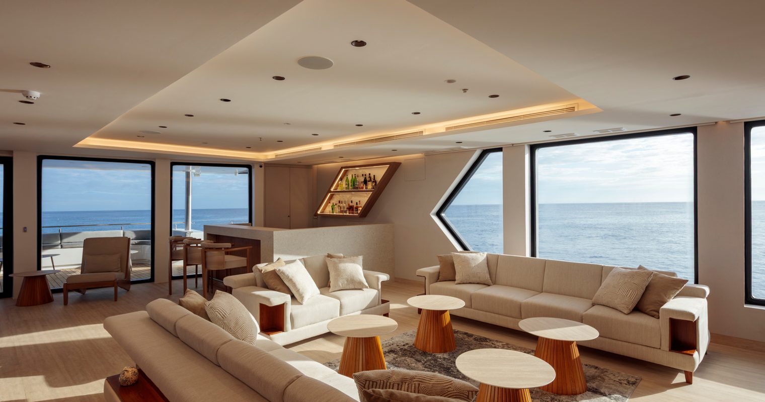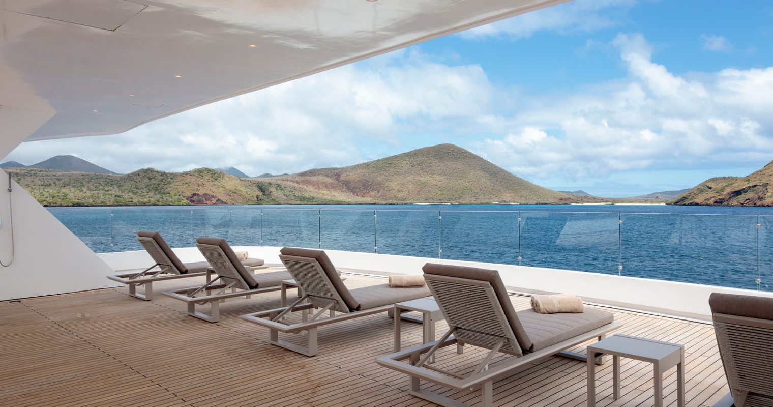 Twelve generously sized suites occupy the main and upper decks, each one providing a private sanctuary of contemporary luxury. Floor-to-ceiling windows frame the ocean. Your private balcony extends your living space. And the crowning feature: your own ocean-facing jacuzzi. Inside, elegant neutral tones blend with natural textures, while smart touches include blackout curtains, keyless entry, walk-in closets, minibars, air conditioning, and frosted bathroom glass. Our preferred option is one of the convertible double suites with flexible king or twin bed configuration—soak in your jacuzzi as the sun rises over volcanic peaks, or unwind on your balcony with a glass of wine while sea lions play in the waves below. Select suites interconnect, ideal for families or groups who want both togetherness and privacy.