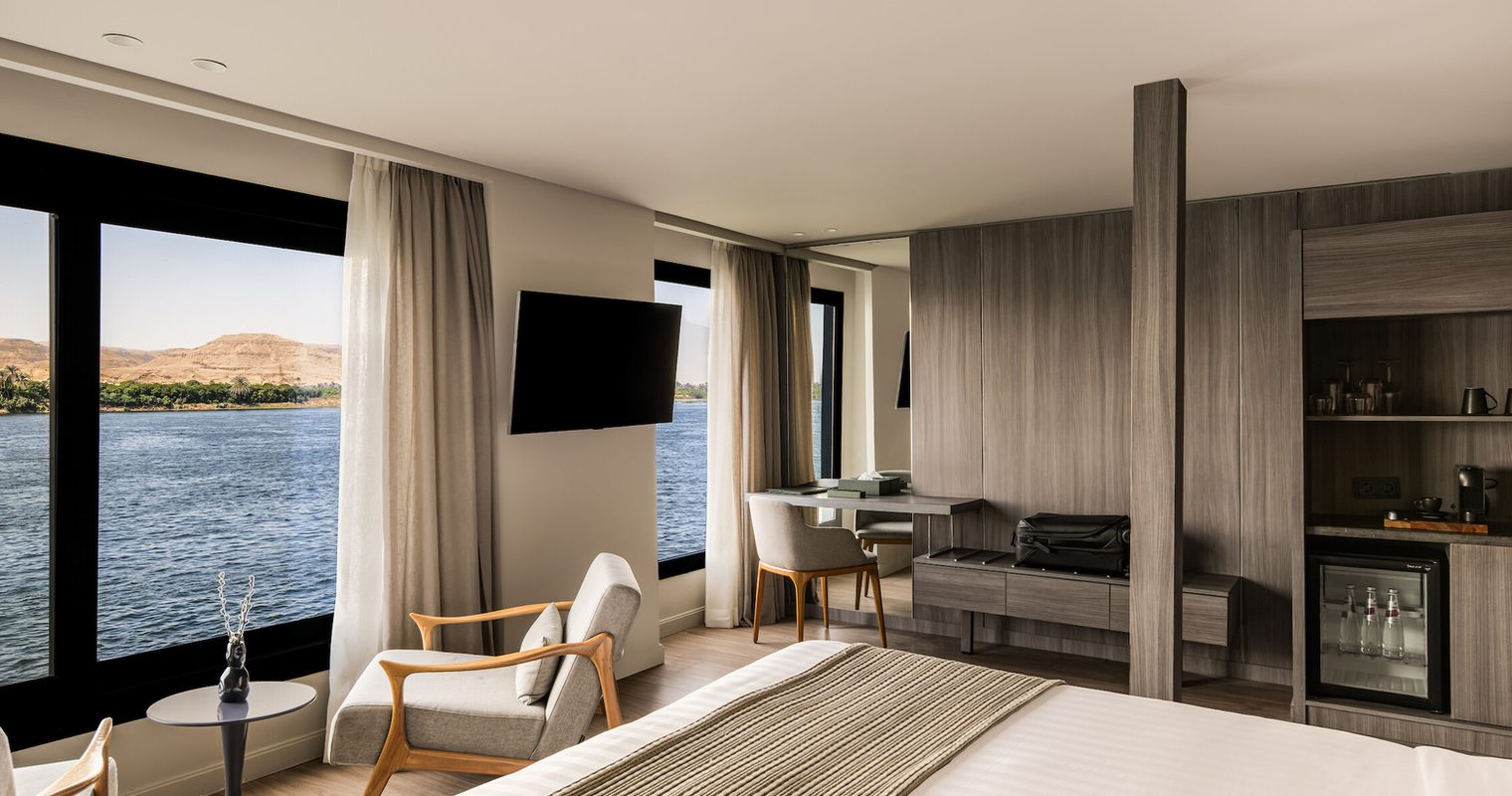 Cabins are furnished in a calm palette of neutral grays and stone, with oversized picture windows pulling the Nile into every room. Egyptian-inspired furniture and perforated rattan screens add texture without clutter. Eight Historia Suites, two presidential suites, and two Royal Suites step things up considerably. The presidential suites pay tribute to iconic figures of Egyptian cultural heritage — each one distinct, each with its own character and river views to match. The Royal Suites add a Jacuzzi bathtub, rainfall shower, and floor-to-ceiling windows that frame the Nile at its most expansive. If you can stretch to one, do.
