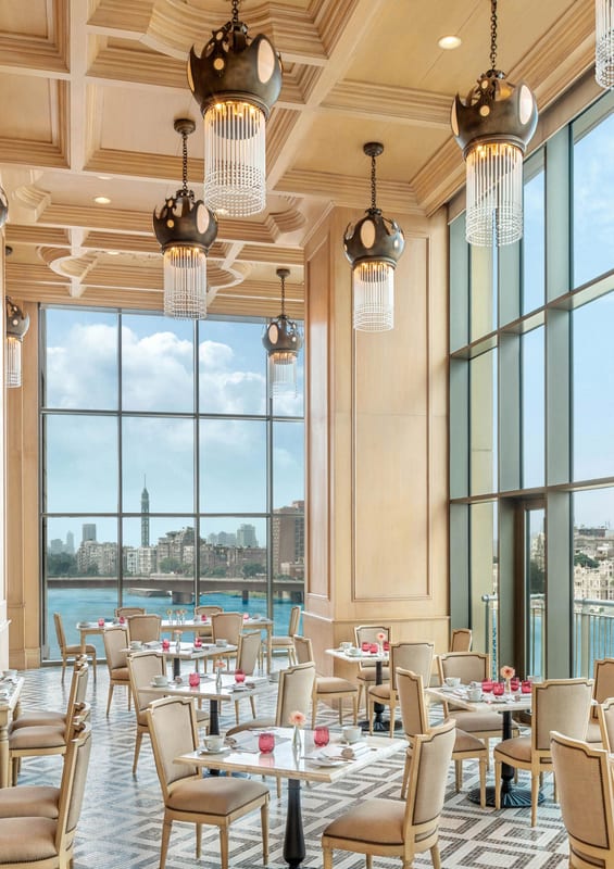Neutral shades of peach, grey and maroon tastefully run throughout the hotel’s 362 rooms and suites, all designed according to classical décor. On the walls, Egyptian murals depict papyrus flowers and bathrooms are a luxurious affair of marbled flooring and mosaic tiles. The Nile View rooms are some of our favorites – allowing you to admire the sun as it sets over the city’s iconic skyline from the comfort of your own bed.