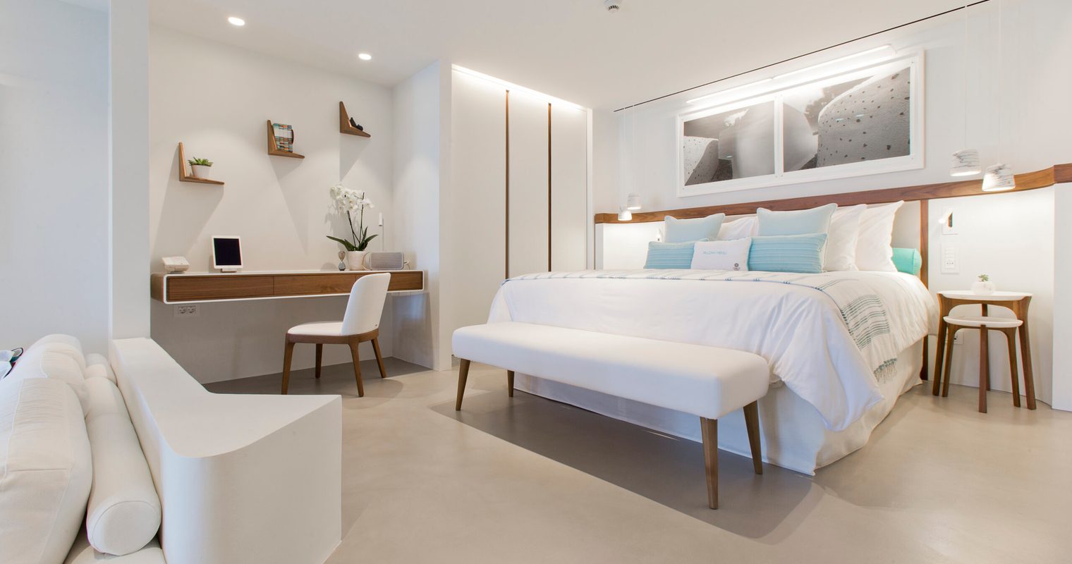 A fresh white theme runs throughout all the rooms and communal areas. It manages to be minimalist and sophisticated but still soft and inviting. Several of the suites enjoy a personal plunge pool and terrace, but if you’d rather have a little longer in bed, choose to have your champagne breakfast while lying on your king-sized coco-mat mattress.