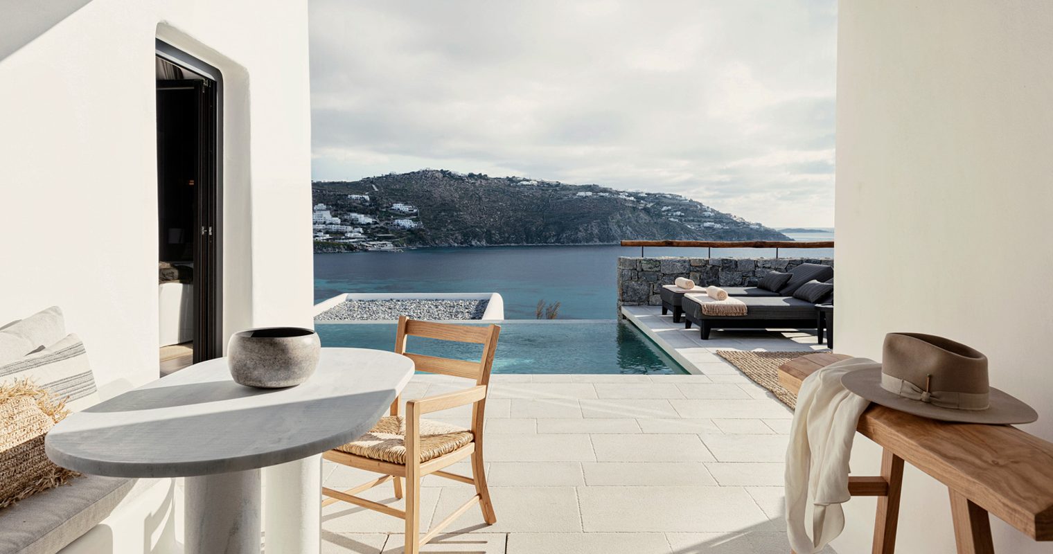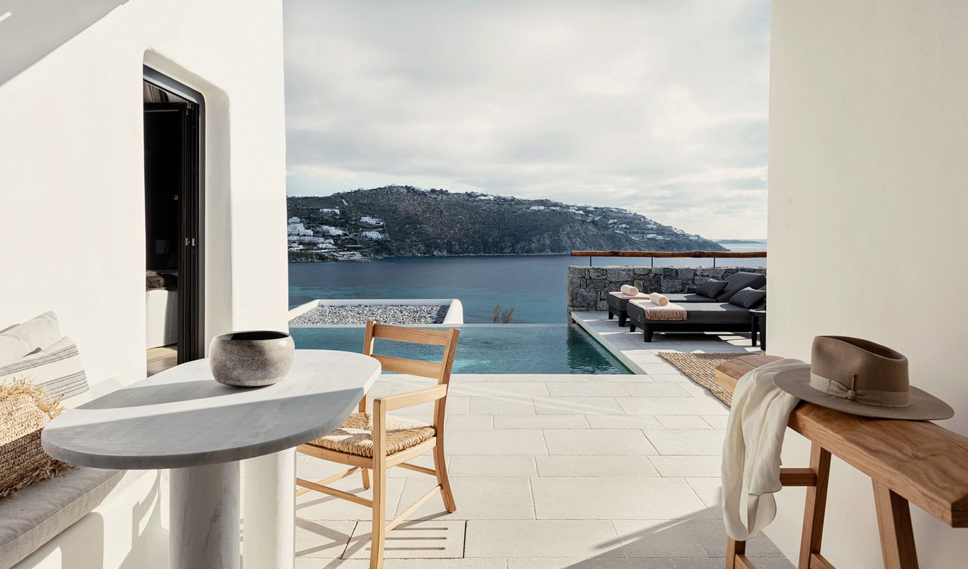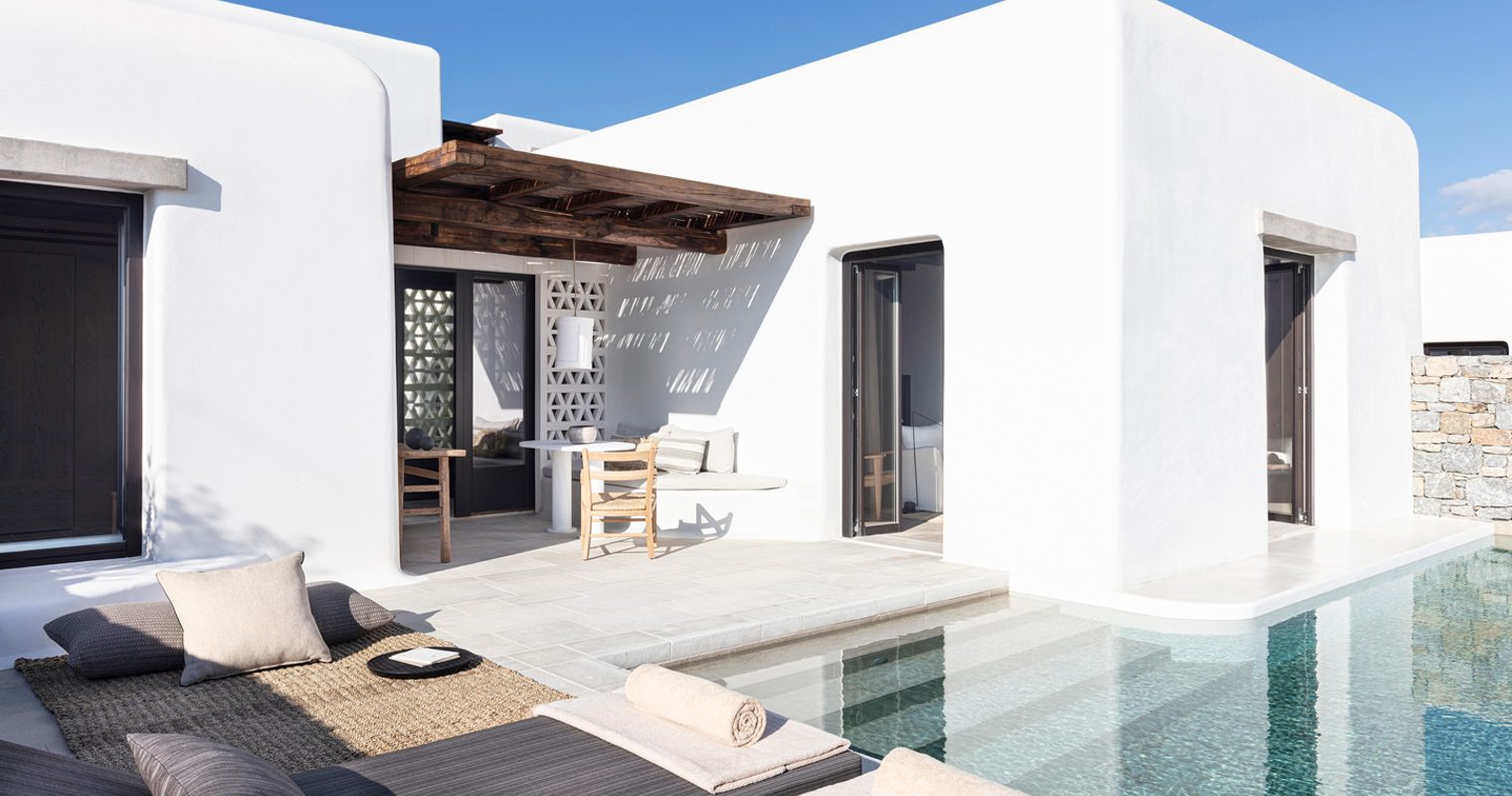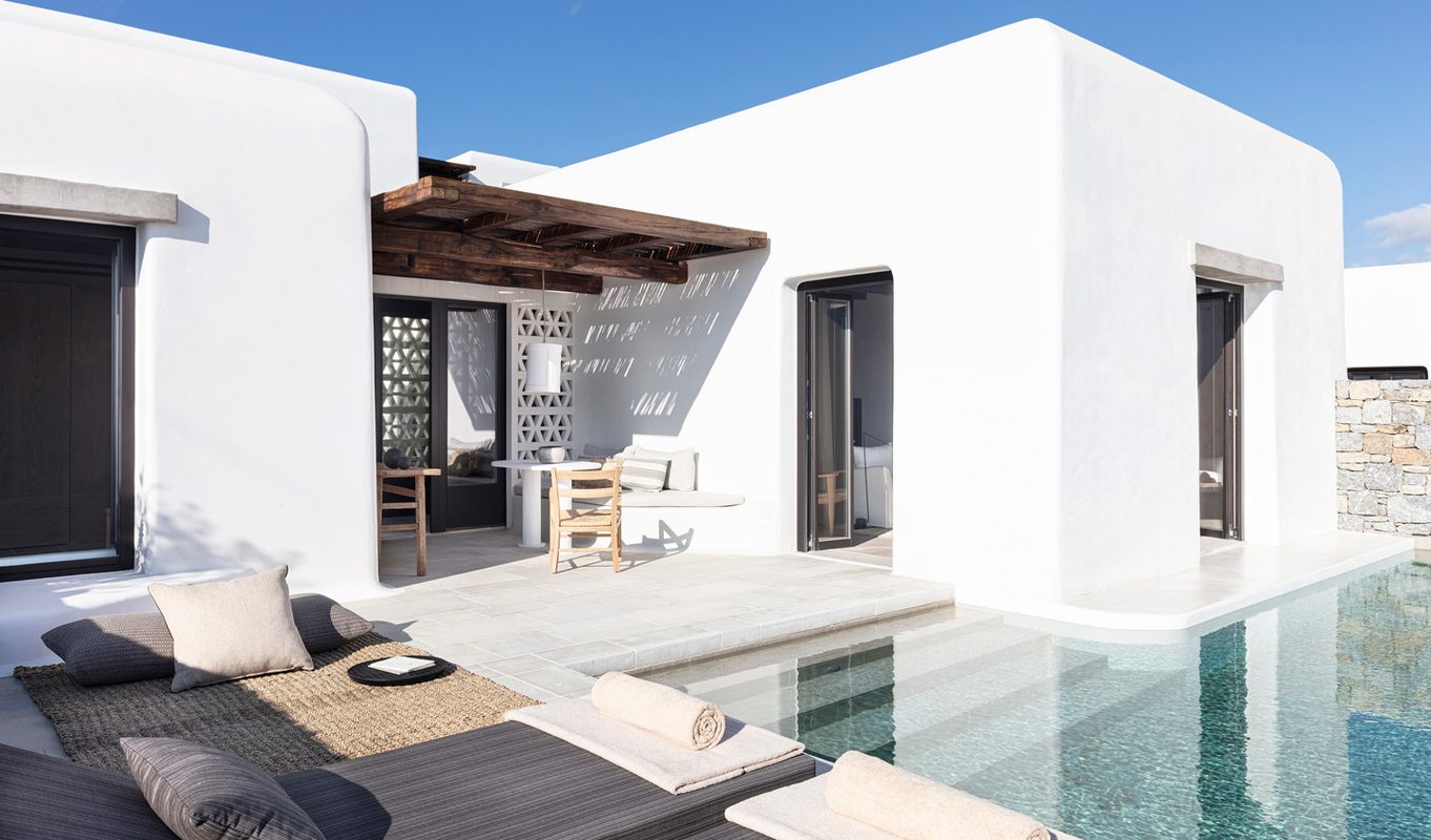 Children are welcome to share with you, but the two Grand Villas are perfect for those looking for a bit more space. Offering three or four bedrooms (and the option to connect the two), the scale is grander here with a larger pool and sunset views over neighboring Delos.