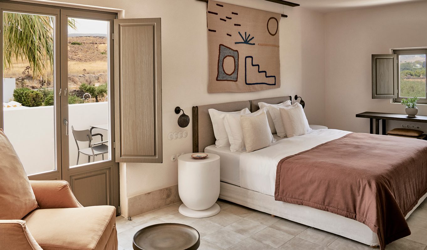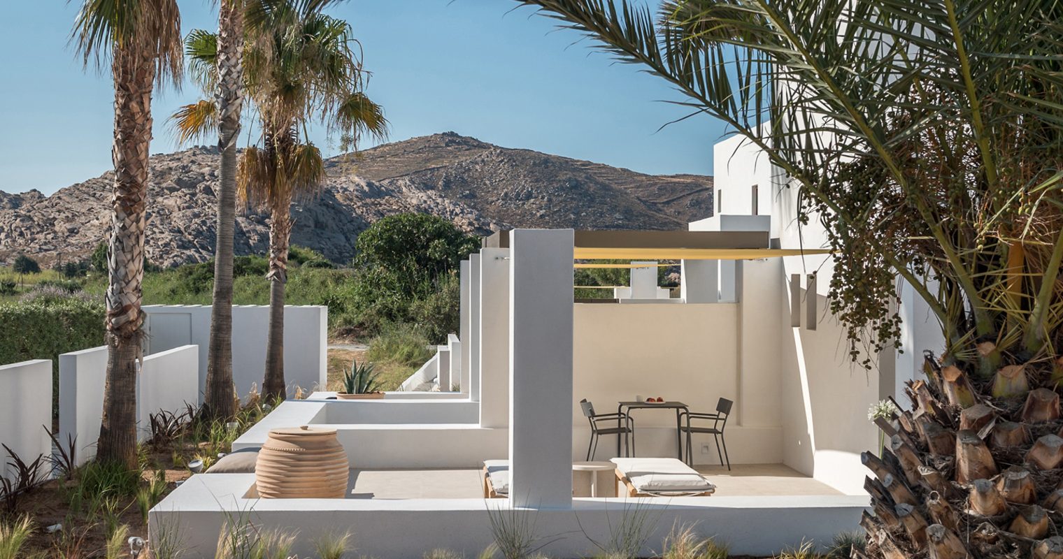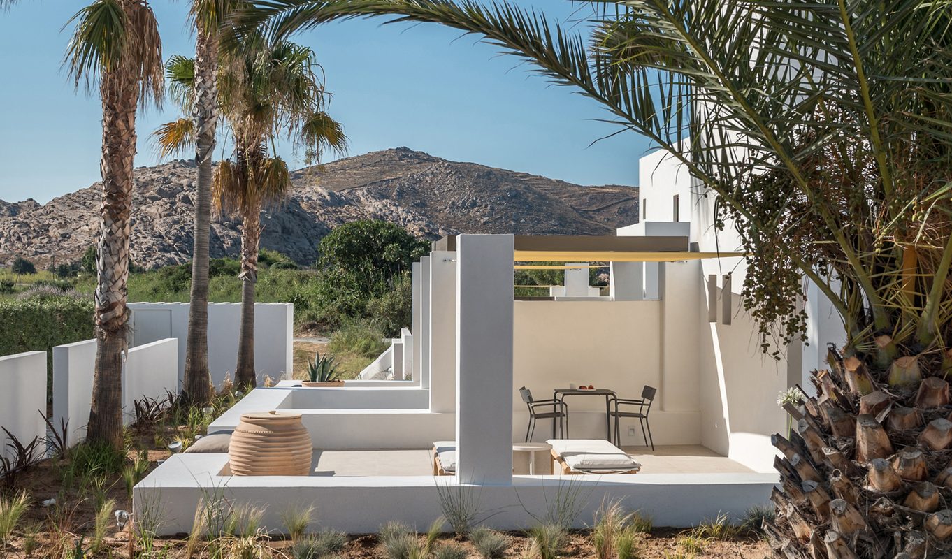 Sunshine penetrates every aspect of life at Parilio and the 33 suites are no exception. Each features private outdoor space, ranging from terraces and jacuzzis to plunge pools, and each takes its name from a celestial being. Beyond the bold exterior, a neutral color palette warmed by earthen tones of russet and ochre and pieces of modernist Greek art sets the tone. Flooded with light and opening up onto views of the gardens, or Kolympithres Bay in the case of the Uranus Suites, we love starting the day with breakfast out on the private terrace, breathing in the gentle scent of pine.