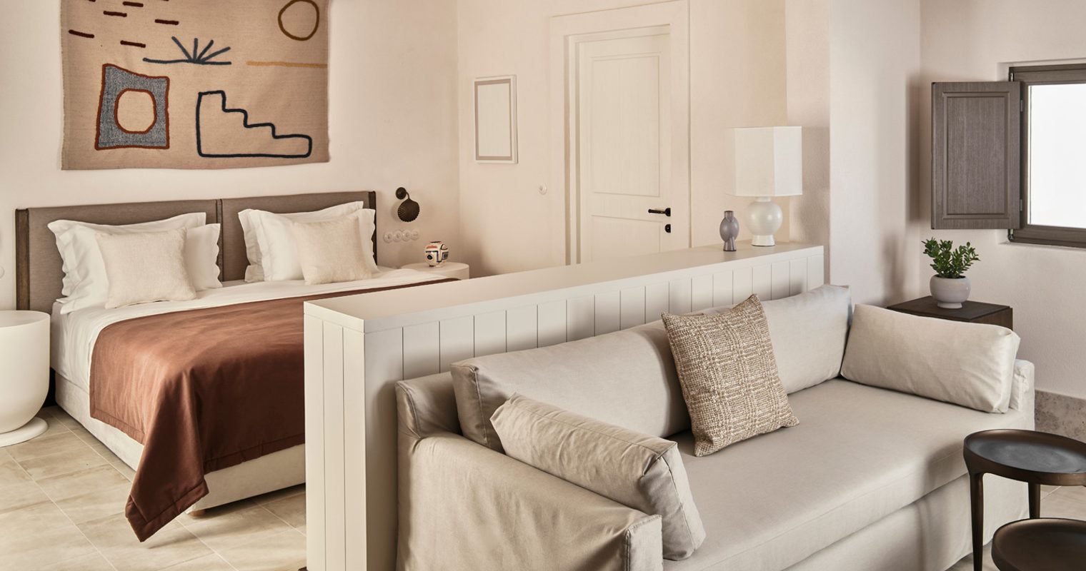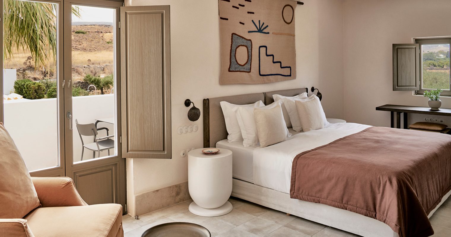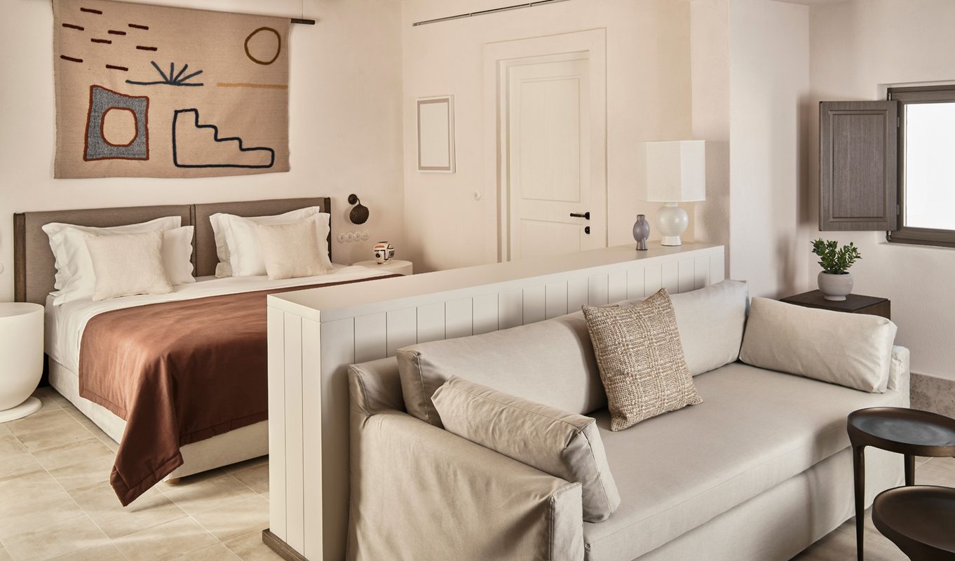 Sunshine penetrates every aspect of life at Parilio and the 33 suites are no exception. Each features private outdoor space, ranging from terraces and jacuzzis to plunge pools, and each takes its name from a celestial being. Beyond the bold exterior, a neutral color palette warmed by earthen tones of russet and ochre and pieces of modernist Greek art sets the tone. Flooded with light and opening up onto views of the gardens, or Kolympithres Bay in the case of the Uranus Suites, we love starting the day with breakfast out on the private terrace, breathing in the gentle scent of pine.