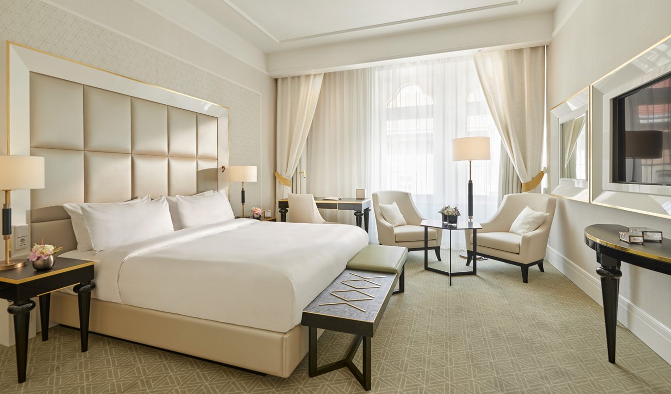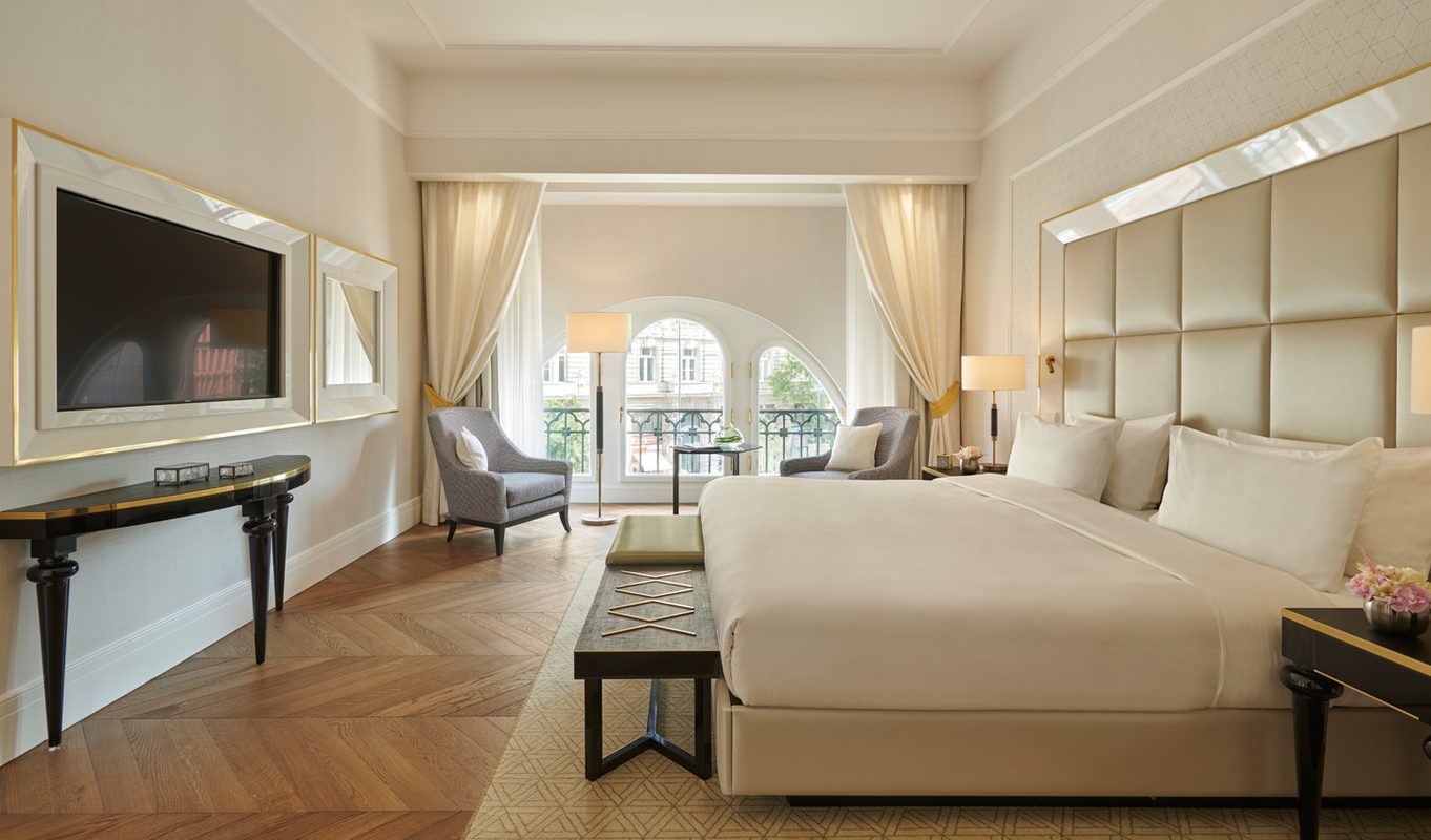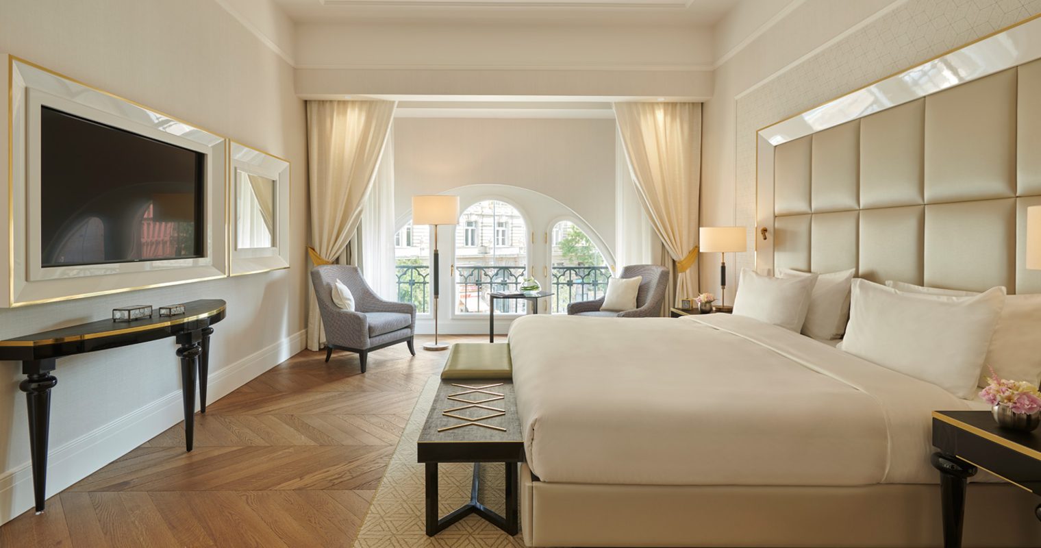Experience the luxury comfort of Párisi Udvar’s elegant rooms and suites. These light and airy spaces present a stylish use of white interiors, embellished with a subtle gold finish. Comfort is at the forefront, from the plush pillows to the ultra-soft linen. Skilled Hungarian craftsmanship is showcased throughout, from the statement headboards that shimmer with a silvery gloss, to the rose-gold mosaic tiling that surrounds the grand bathroom mirror.