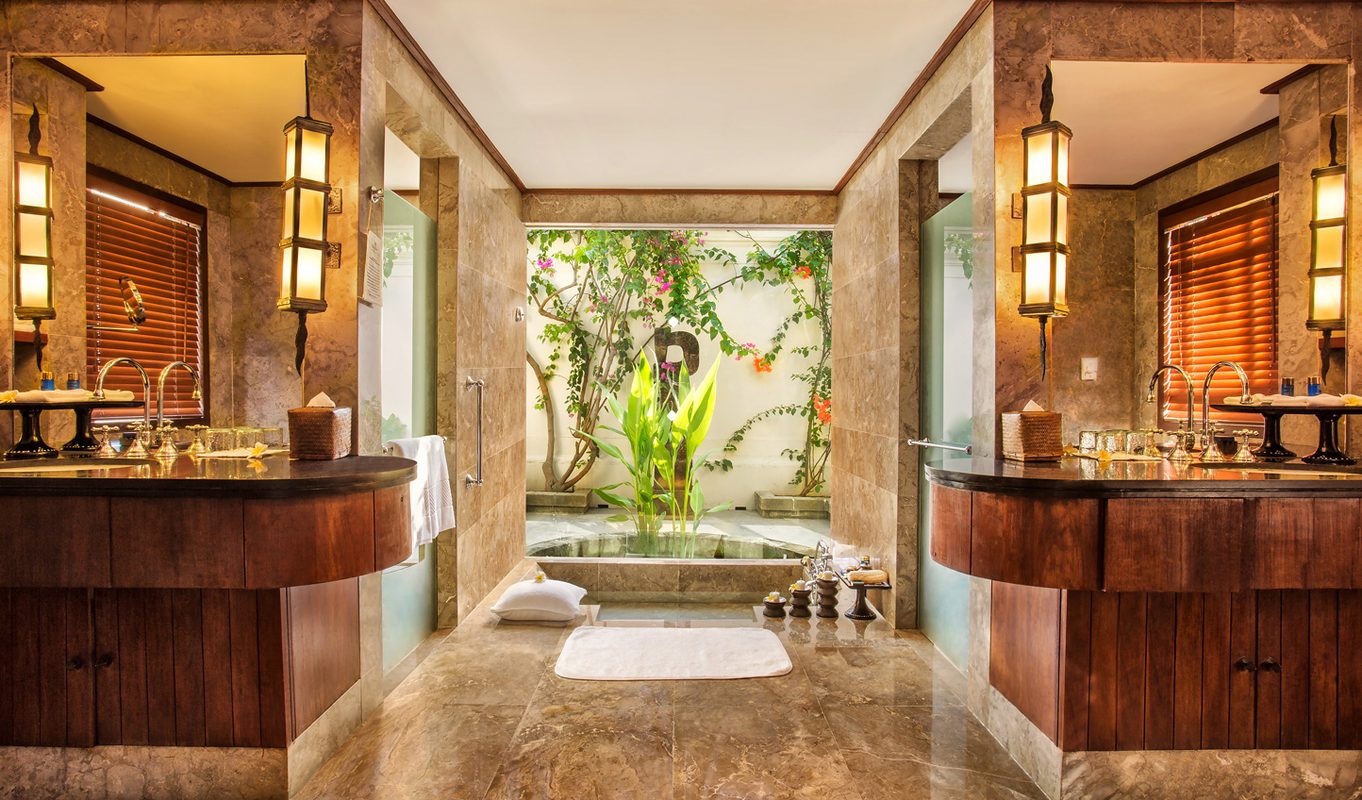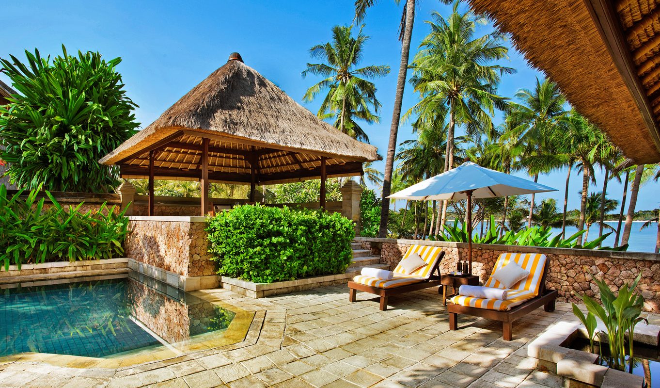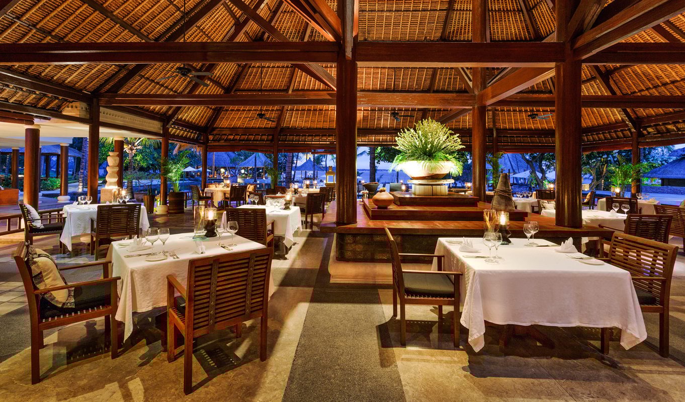 Thatched roof villas and terraced pavilions are scattered around the gardens and have traditional Indonesian crafted furniture and artwork. Soak in the sunken bathtub, snooze on the large four-poster bed or chill-out in your private courtyard with rock pond. The villas and pavilions have expansive, shaded terraces to relax in, while you peer out at beautiful gardens or beaches. All the villas and terrace pavilions offer spacious bedrooms.