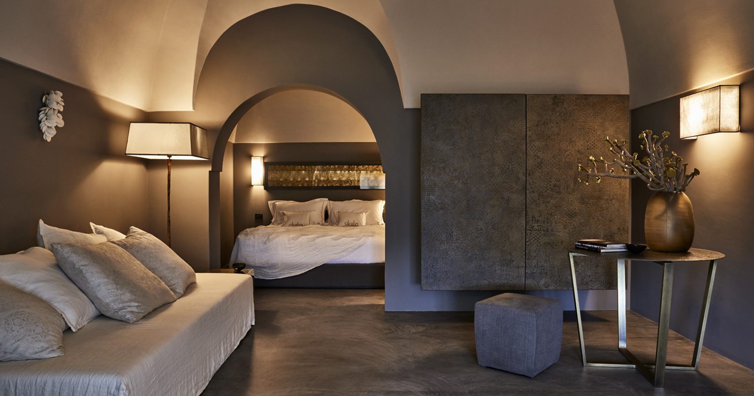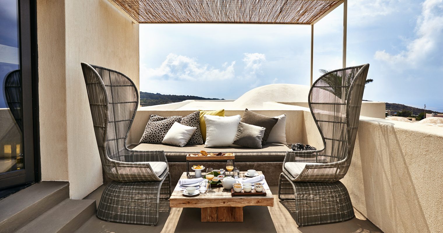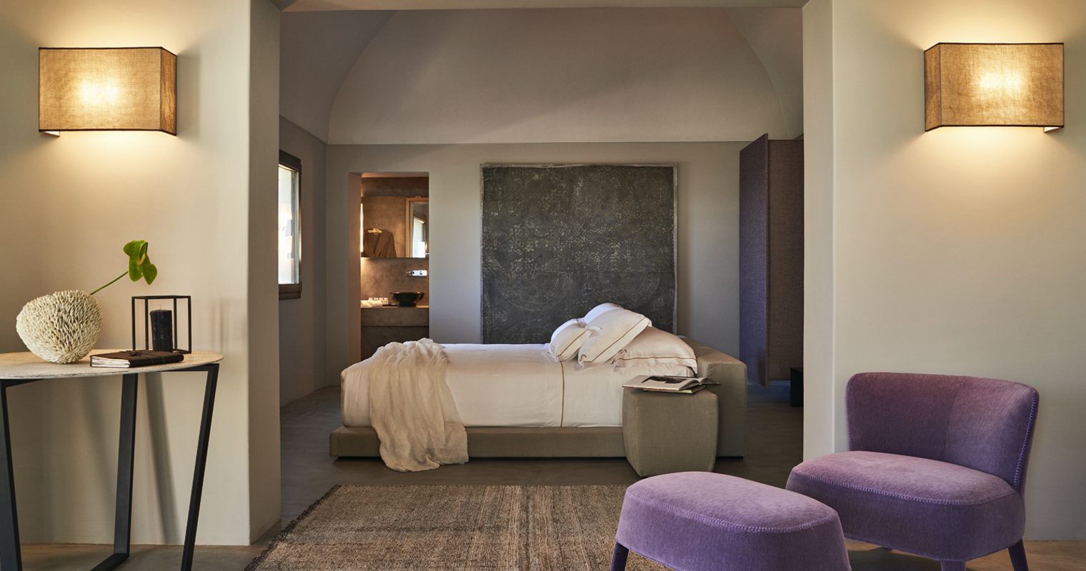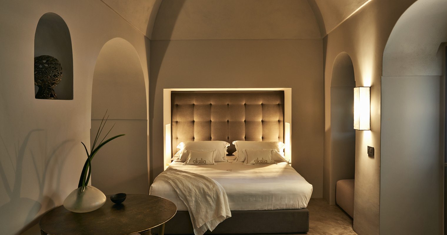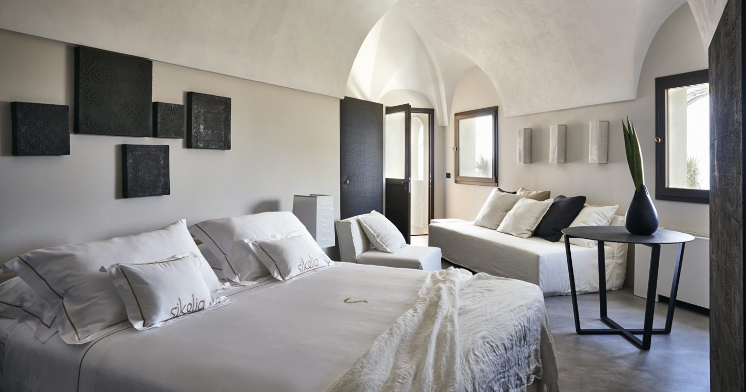 Sikelia has only 20 rooms in total, all of which are individual suites with their own private bathroom and outdoor terrace. All of the suites are carefully built into the landscape using locally sourced stone, and although they all share the same stylish, minimalist design, they are all different in their own right. Every room is comfortable but elegant, with luxurious detailing, fresh fabrics and contemporary interiors. Half of the suites overlook the hotel’s tranquil courtyard and pool, whilst the other half enjoy stunning ocean views. All of the suites have been designed specifically so guests can enjoy a unique sunset view from the privacy of their own terrace.