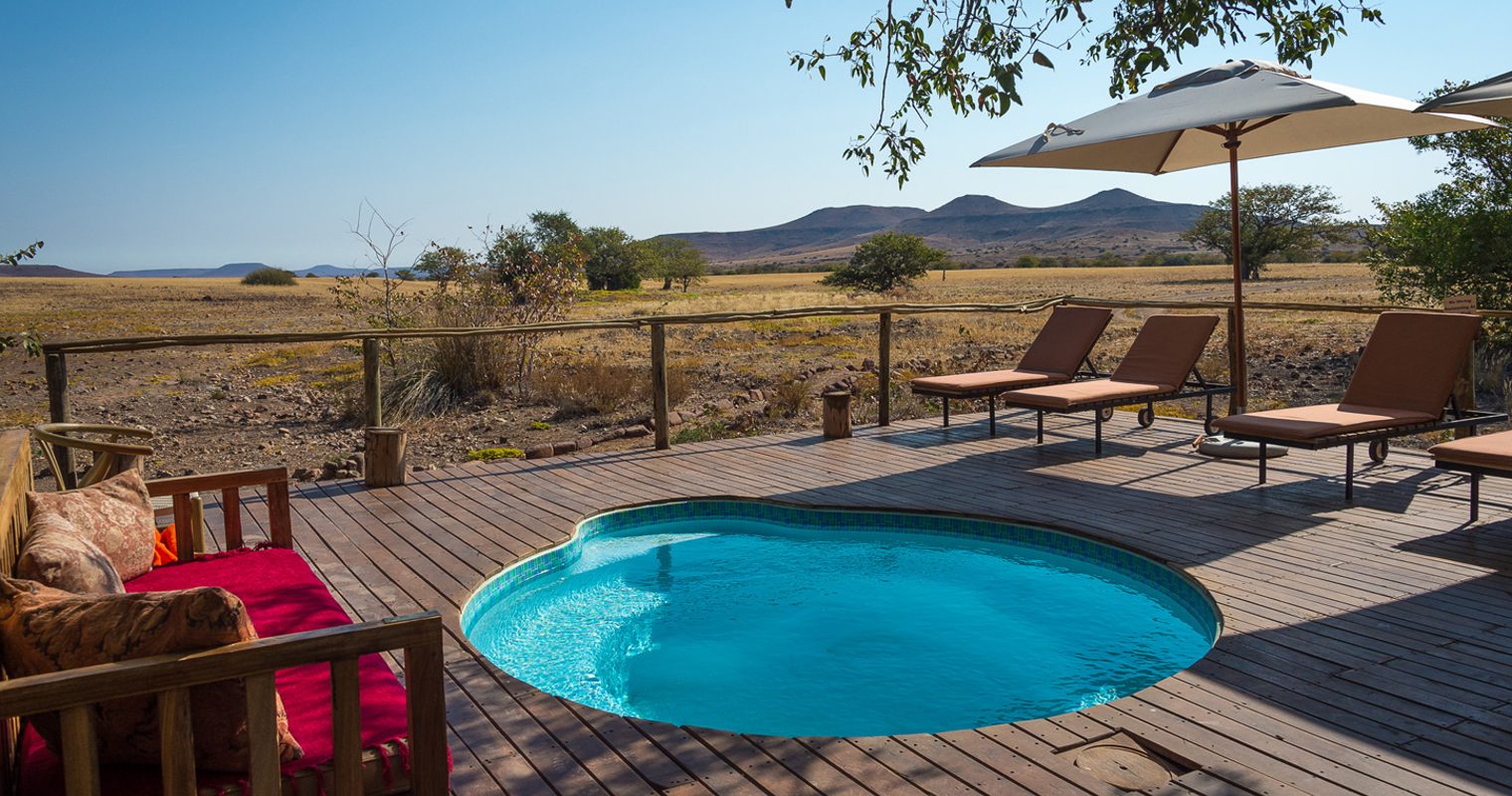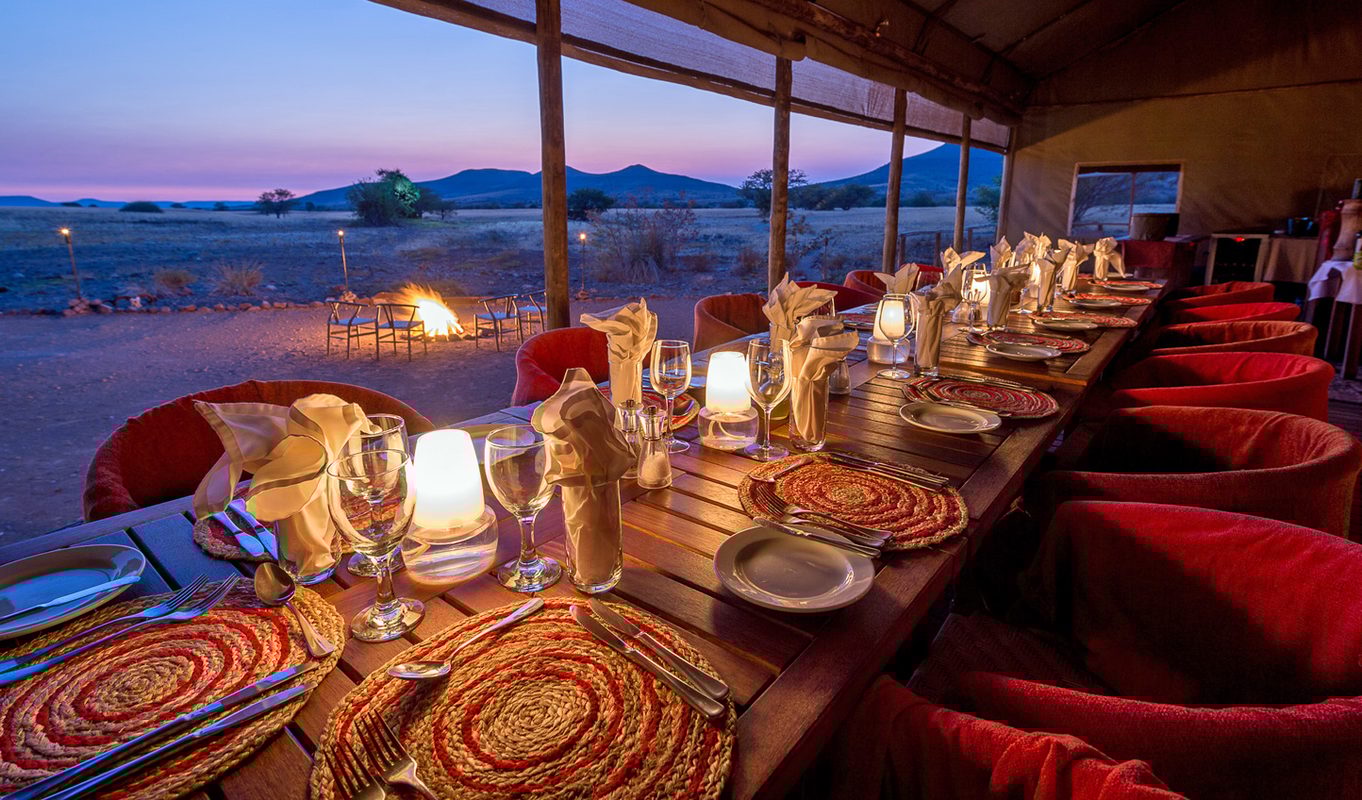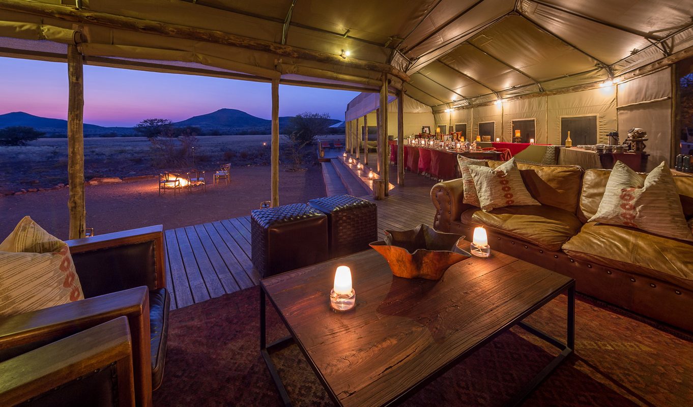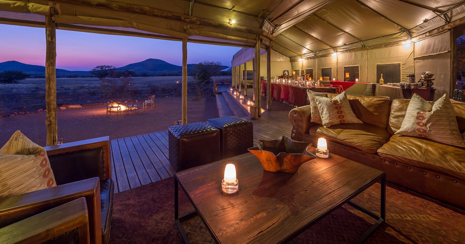 Desert Rhino Camp consists of eight raised Meru-style canvas tents with large verandas at the front, perfect for enjoying an evening cocktail while admiring the sweeping vistas of euphorbia and ancient welwitschia plants against the backdrop of the Etendeka Mountains. Dark local wood is used throughout the tent, making a dramatic contrast with the crisp white linen sheets of your sumptuous double bed. The tented dining and lounge areas are elevated and partially cut away at the sides to ensure you benefit from panoramic views all the time. An azure swimming pool provides a perfect respite from the midday sun, while evening meals are often taken around the fire pit under the starry skies.