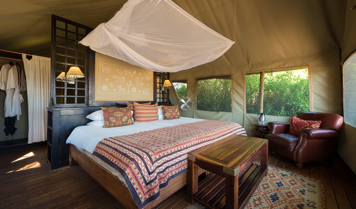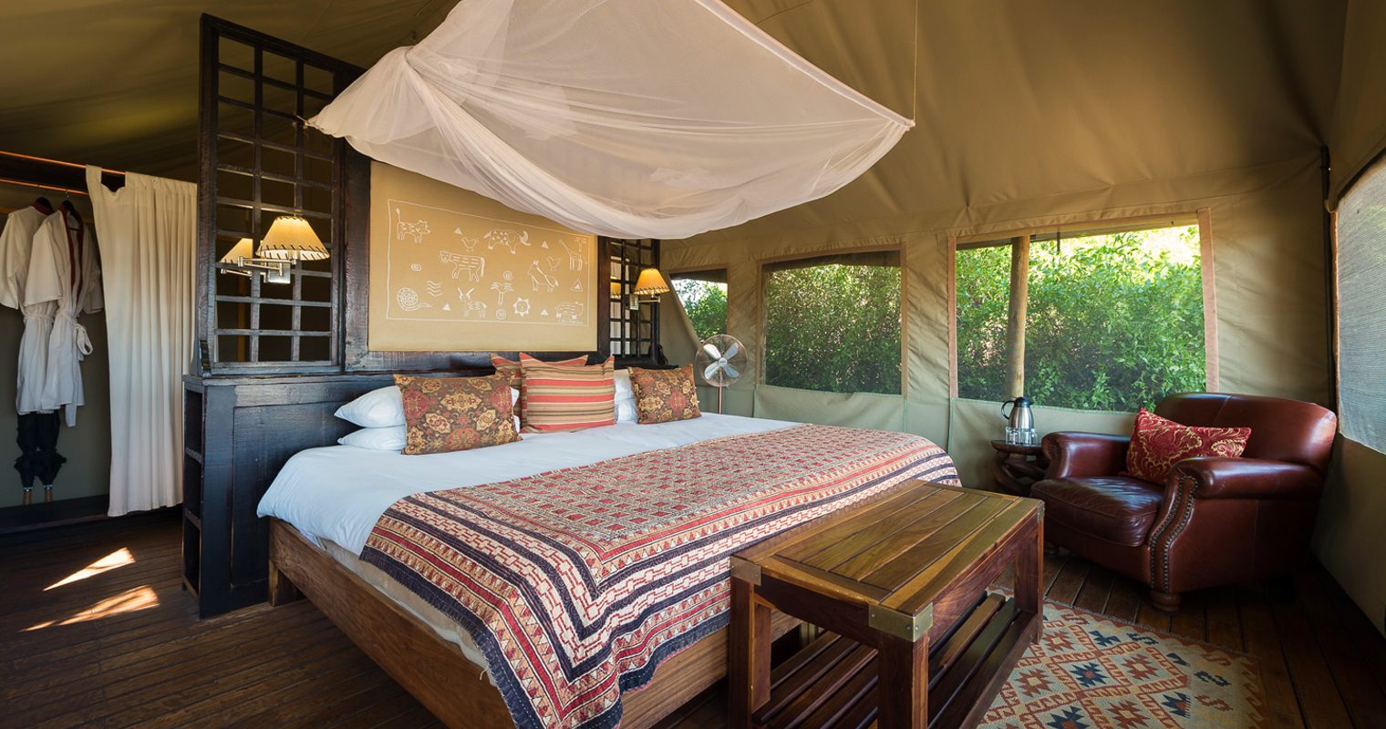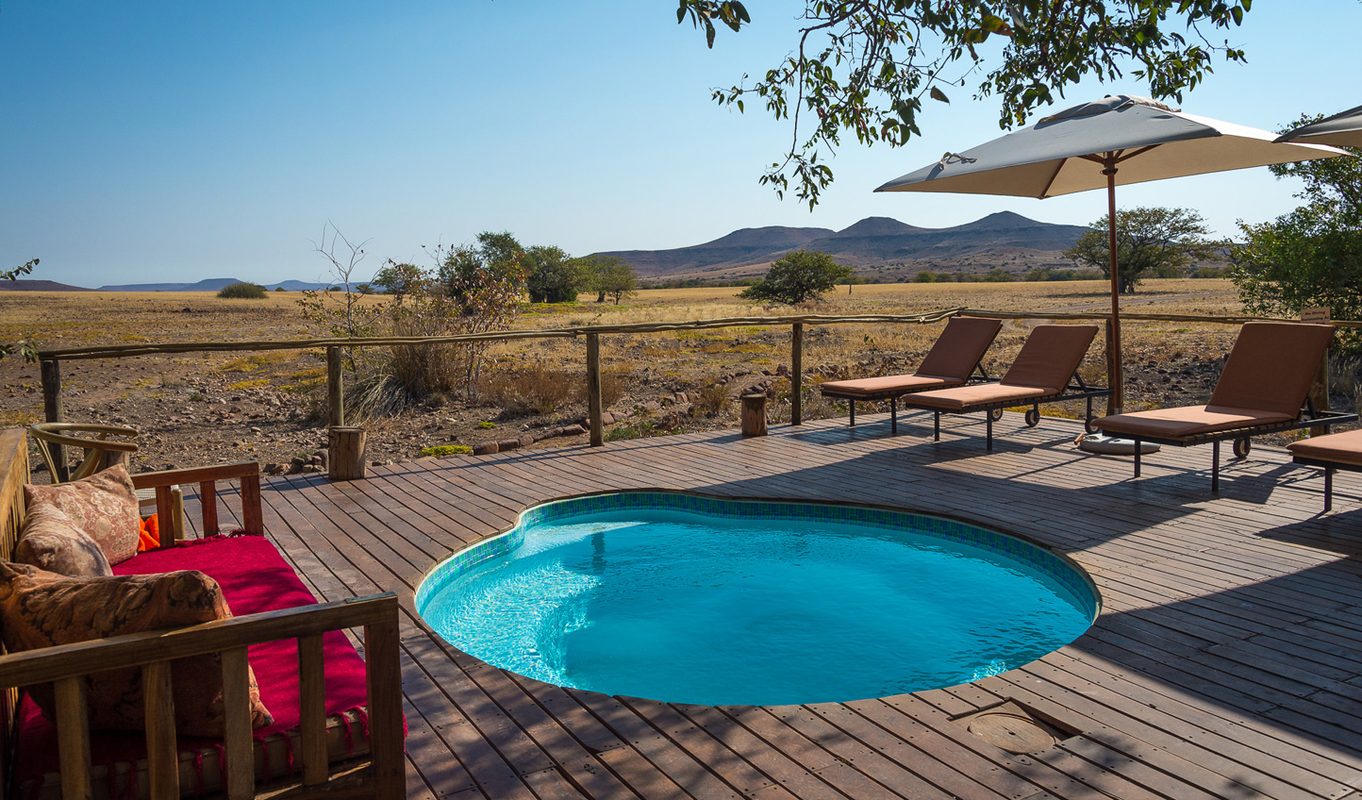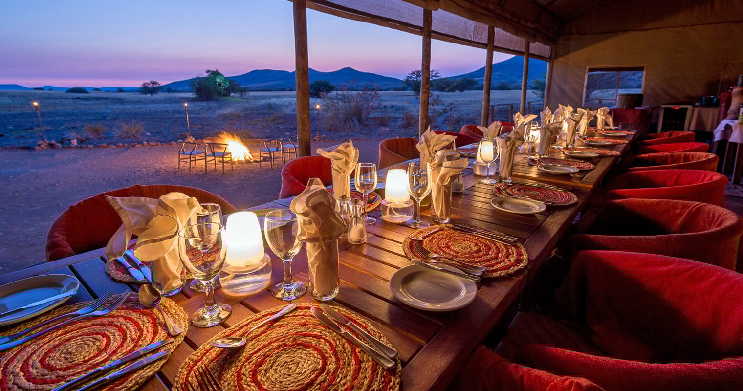 Desert Rhino Camp consists of eight raised Meru-style canvas tents with large verandas at the front, perfect for enjoying an evening cocktail while admiring the sweeping vistas of euphorbia and ancient welwitschia plants against the backdrop of the Etendeka Mountains. Dark local wood is used throughout the tent, making a dramatic contrast with the crisp white linen sheets of your sumptuous double bed. The tented dining and lounge areas are elevated and partially cut away at the sides to ensure you benefit from panoramic views all the time. An azure swimming pool provides a perfect respite from the midday sun, while evening meals are often taken around the fire pit under the starry skies.