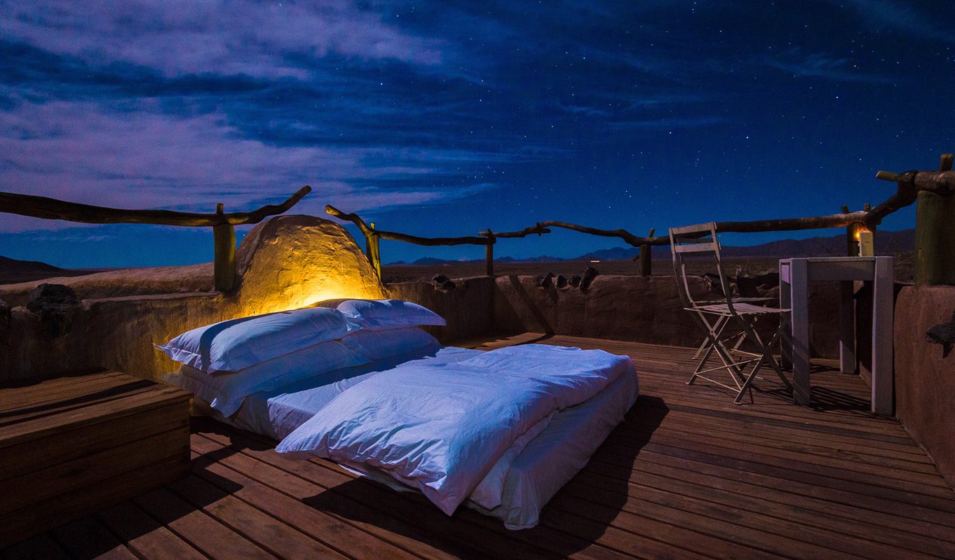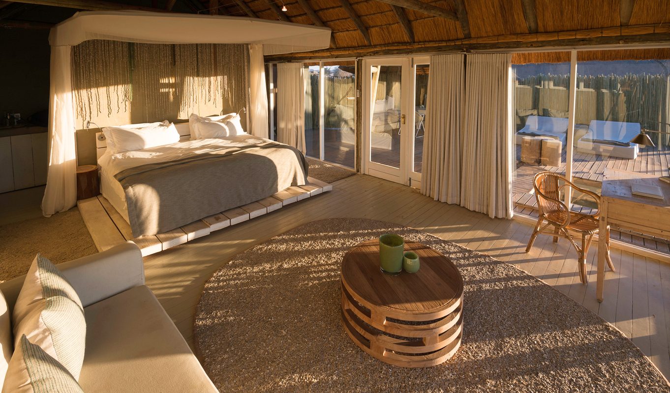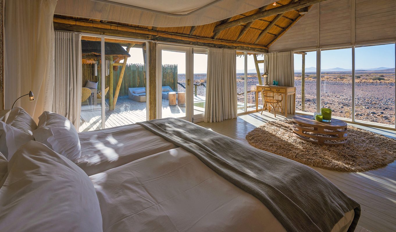 All of the 11 spacious desert villas blend in effortlessly with the surroundings thanks to gorgeous earthy tones and textures used all over Little Kulala (which also includes a wine cellar and its own library). Two sides of each room are covered with floor-to-ceiling glass, ensuring you don’t miss a second of Namibia’s wilderness; bamboo fences also provide complete privacy as you relax in the luxurious rooms complete with en-suite and private plunge pool and veranda. If this doesn’t cut it, head upstairs to your private outdoor terrace and sleep directly under the stars of Namibia’s impossibly clear night skies.