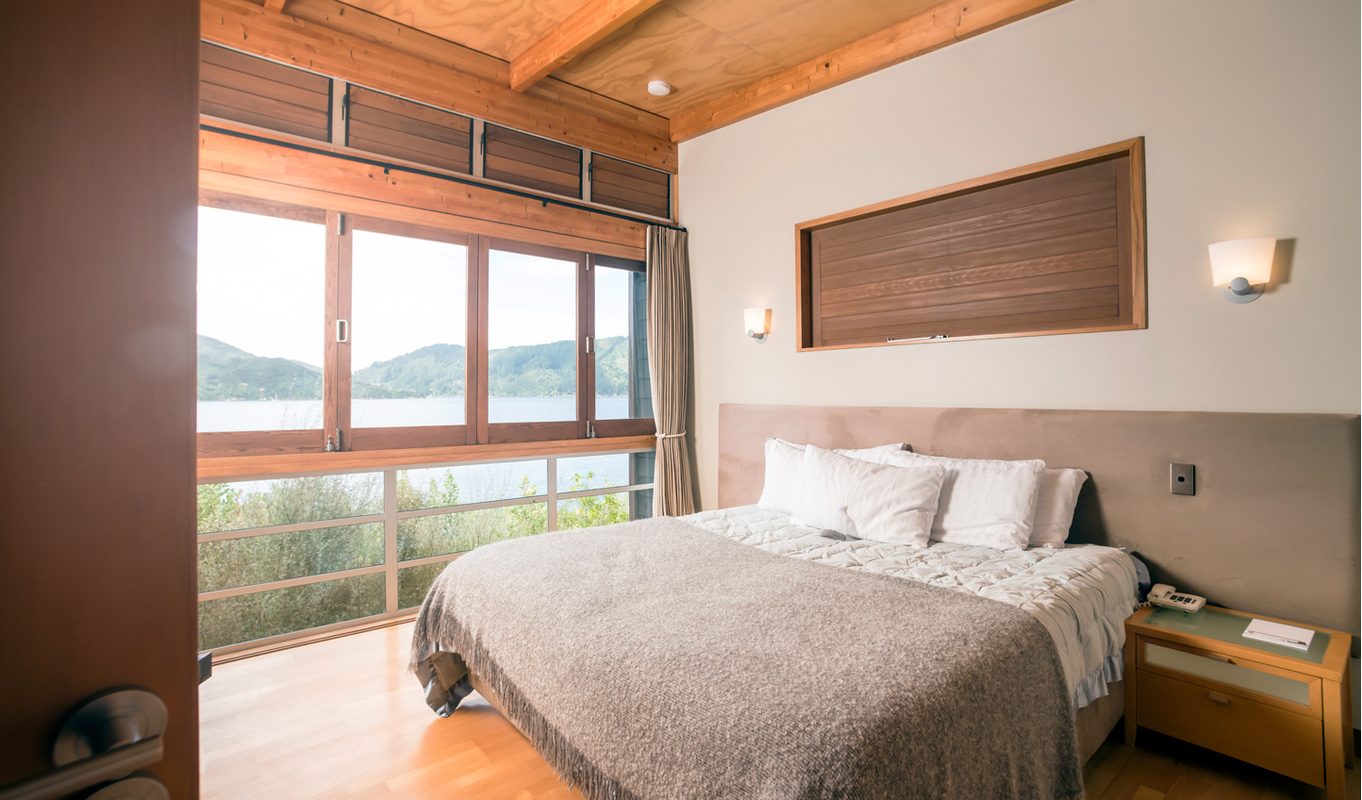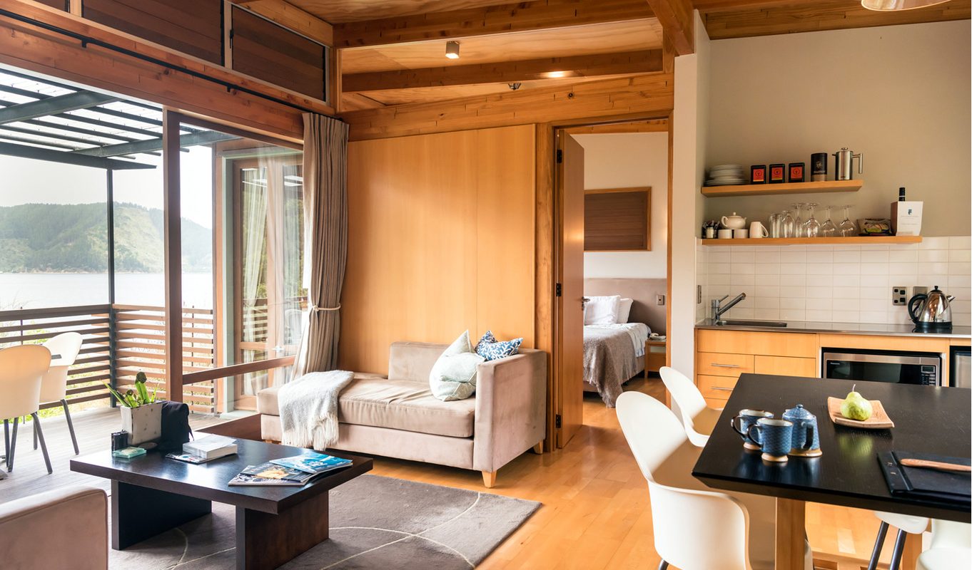 A selection of 1, 2 and 3-bedroom apartments designed with architectural finesse and huddled in amongst the bush provide spectacular natural views across Arthur’s Bay, with the shoreline just a stone’s throw beneath you. Hear nothing but the sound of water lapping the cove below and local birdlife whilst you unwind in luxurious home comforts and natural wood interiors. We love the Kereru Suite, an intimate experience that includes a spacious and secluded spa deck with sunken Jacuzzi. After all, nothing beats the feeling of being completely surrounded by nature – and the Kereru Suite achieves this so effortlessly.
