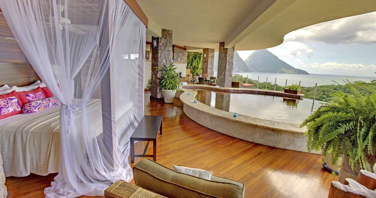 What better way to take advantage of the greatest view in the world than with a private hilltop suite where one wall is completely open to a panoramic view of the serene bay and the lush landscapes, highlighted by the Piton’s jagged twin peaks. Your 1,500+sq ft room, or sanctuary, as the hotel has labelled them, houses a 650 sq ft private infinity pool that magically hovers above the majestic view. A private stone walkway leads to your mountain sanctuary and your room’s location, perched on the side of a mountain, guarantees your complete seclusion and absolute privacy even with a completely open fourth wall.
